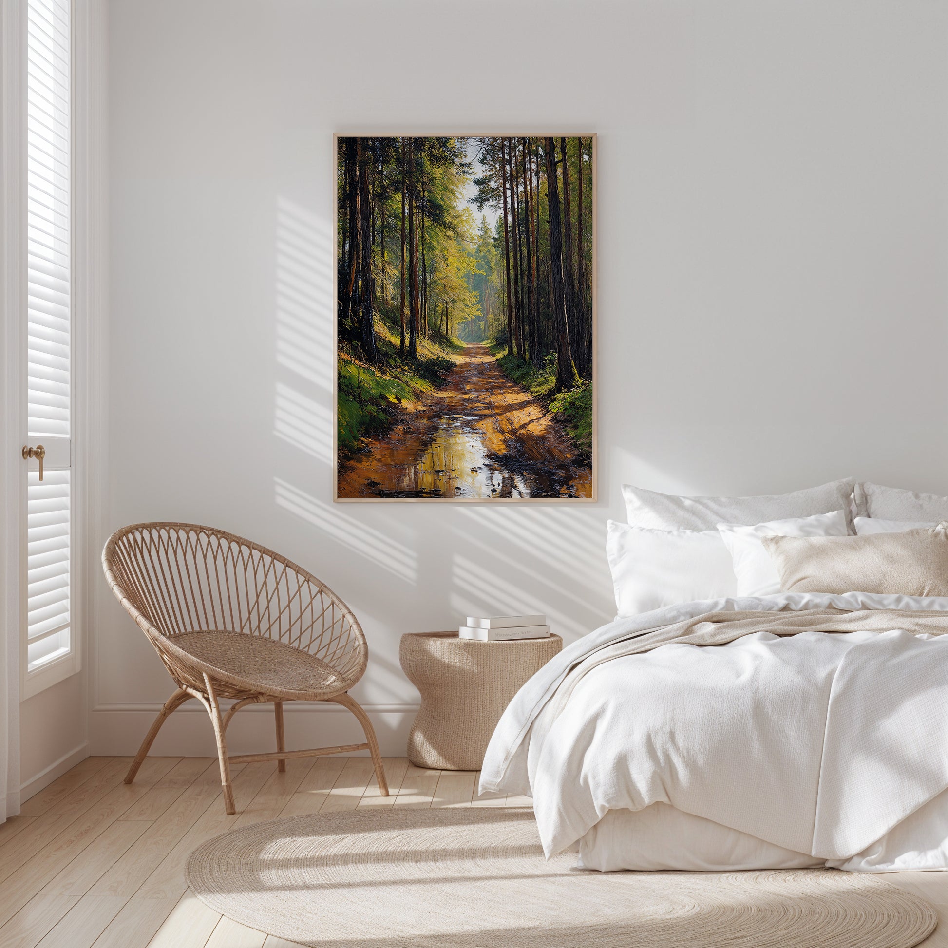 Perfect for rustic interiors, forest-themed spaces, or meditative corners, the piece captures more than a landscape—it captures transition. A path reborn in gold and quiet, reminding us that peace often follows the storm’s final note.