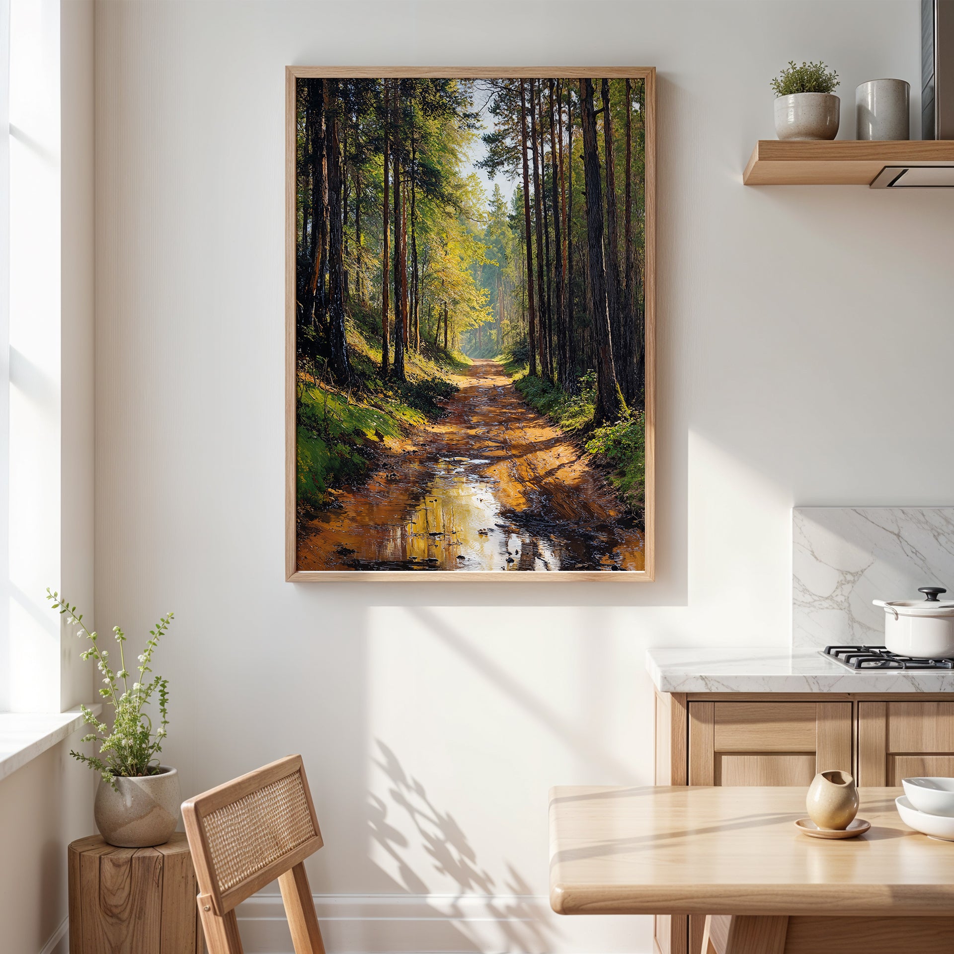After the Rain opens in the still breath of a soaked woodland path. Golden light filters through pine boughs, casting long reflections into puddled earth and lifting mist from the forest floor. Trees stand like sentinels, silent and watchful, as the trail begins to brighten with quiet promise.