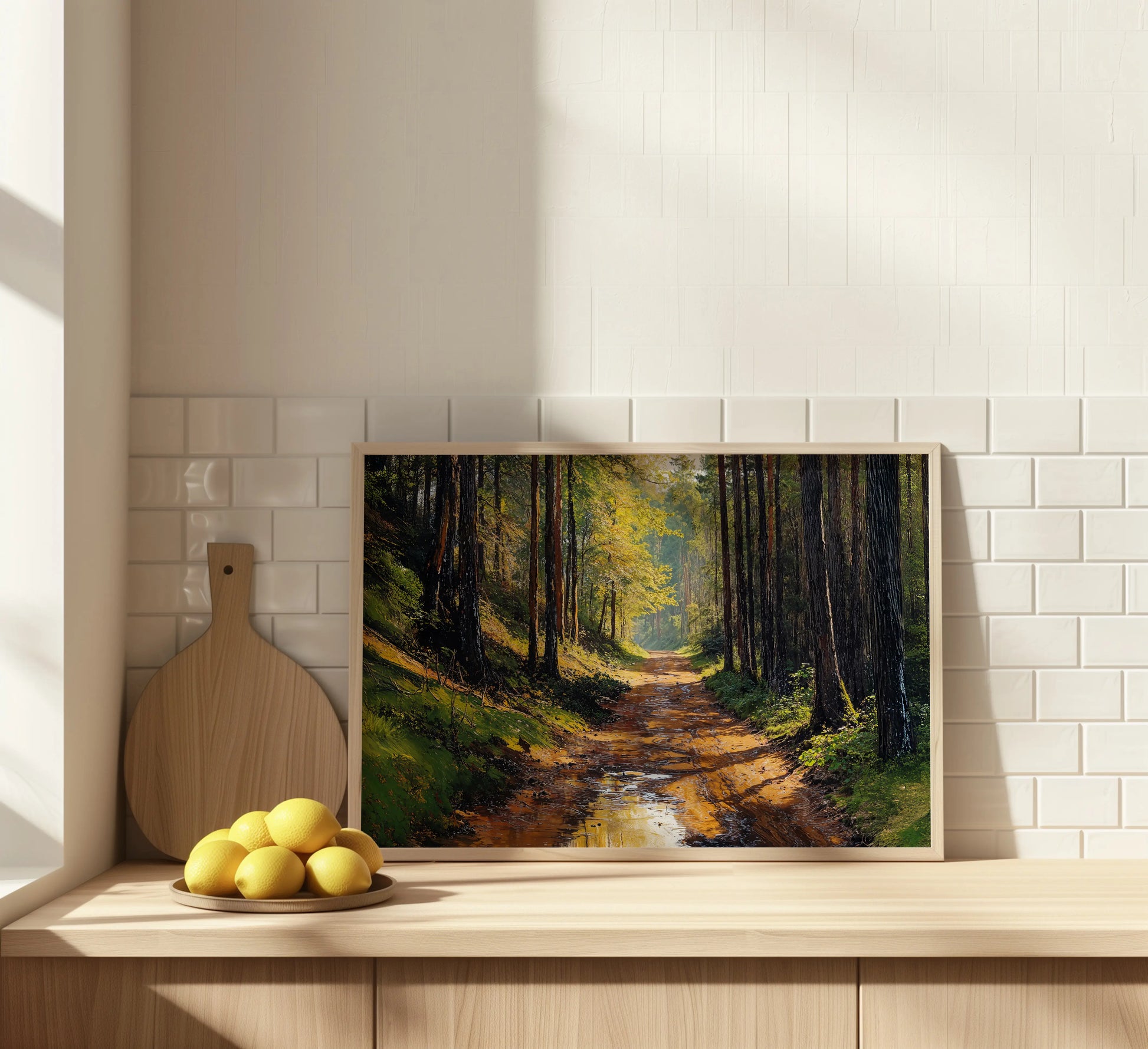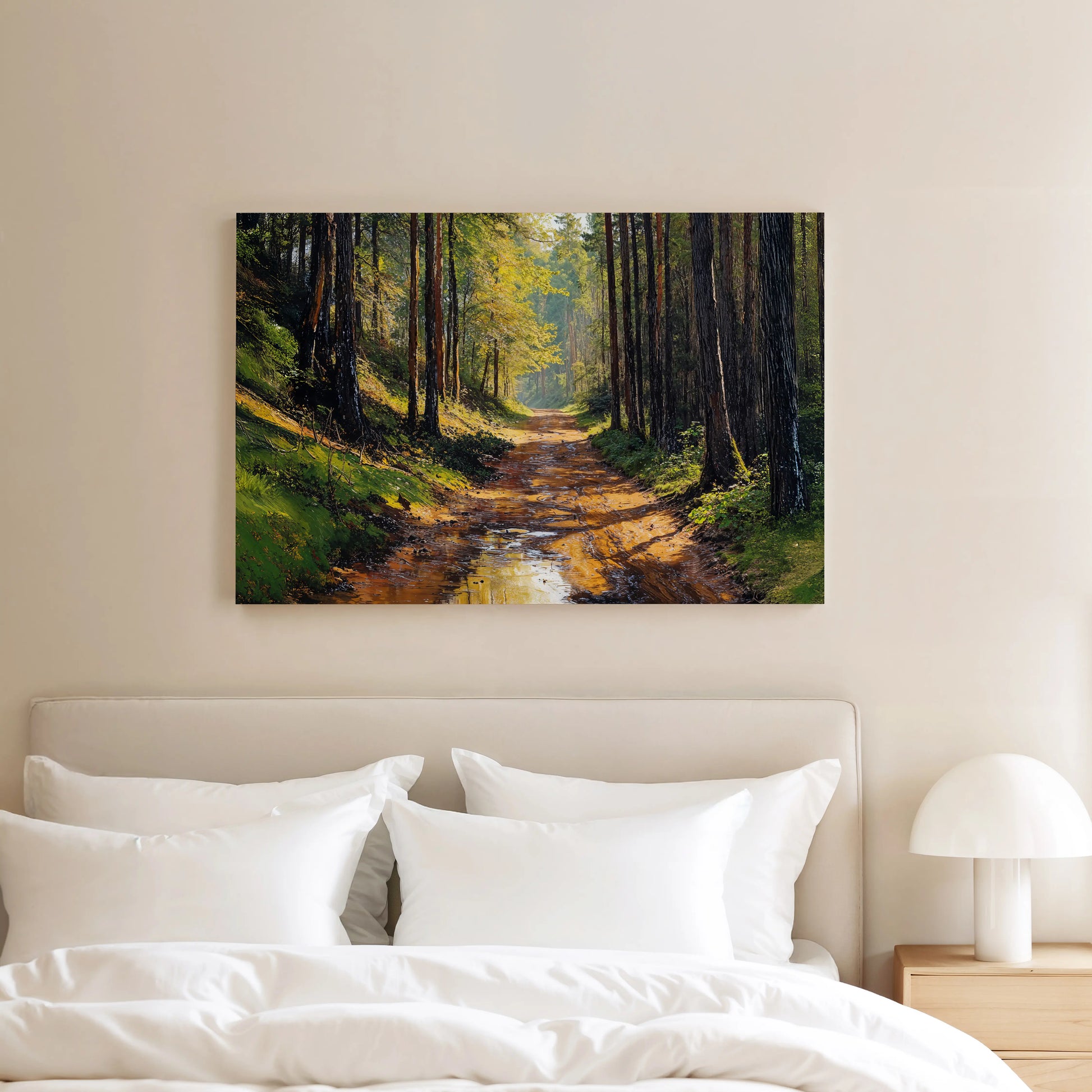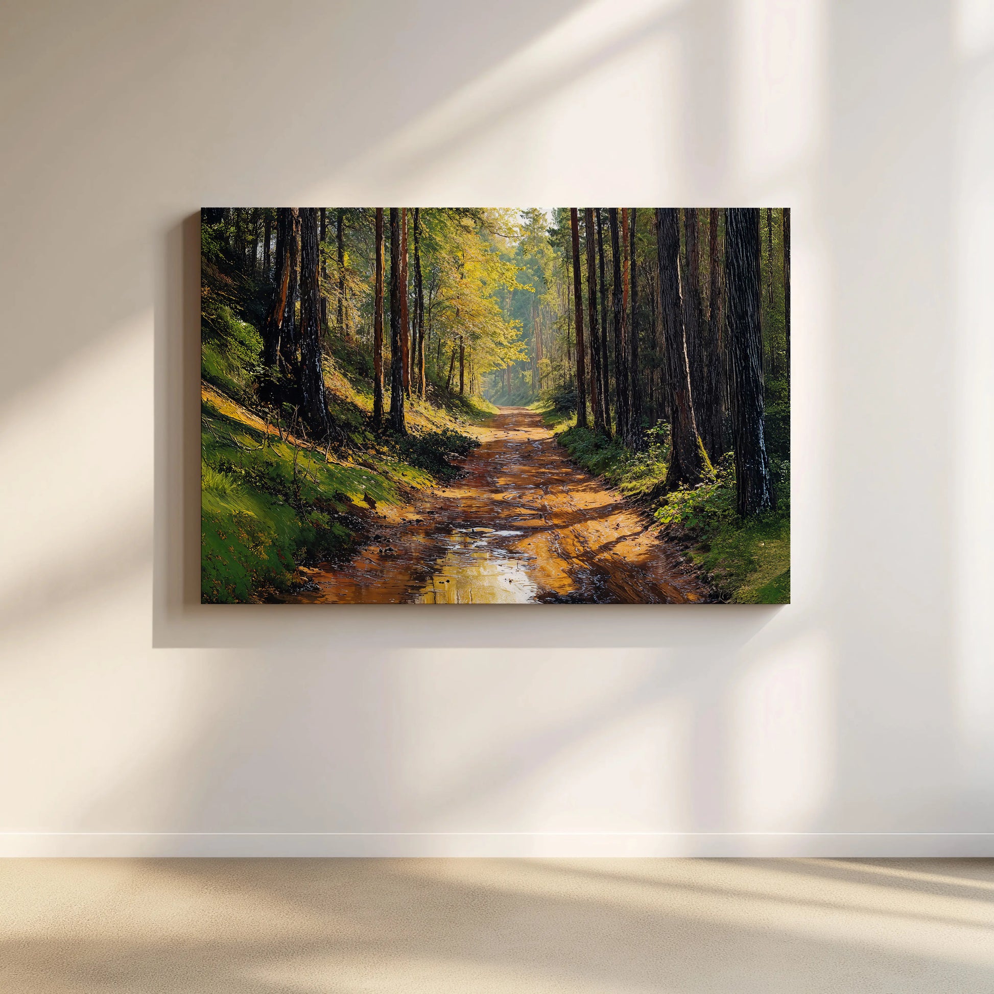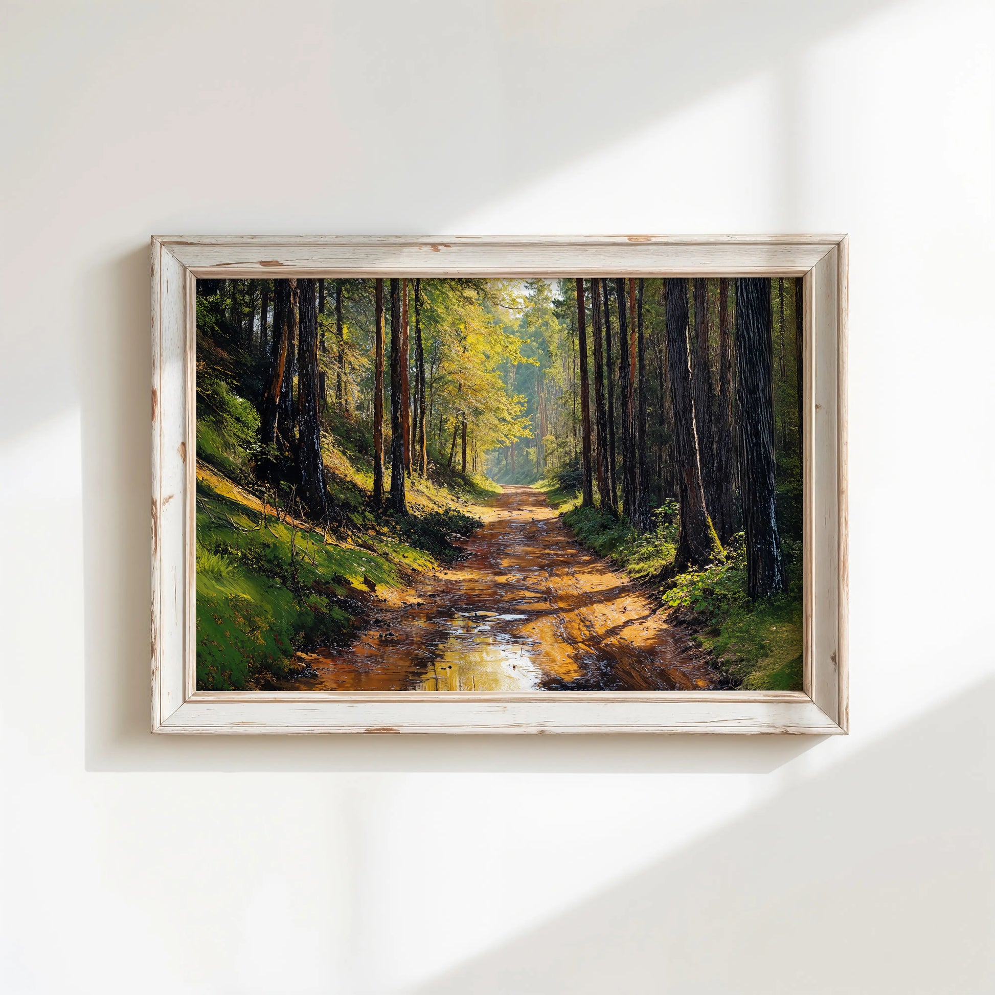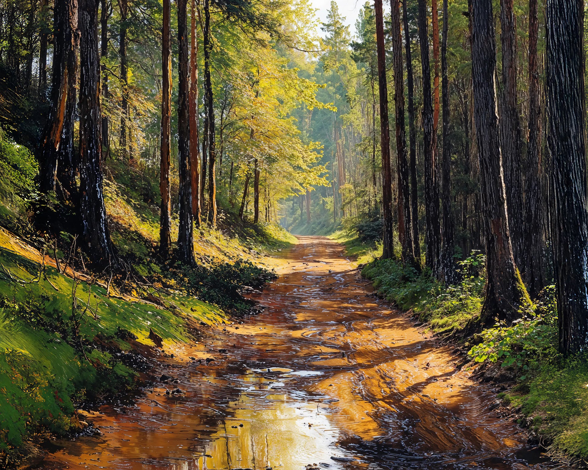 After the Rain portrays a peaceful forest trail just after rainfall. Puddles glisten on the muddy path, reflecting golden light filtering through tall pines and fresh green foliage. This scene evokes quiet solitude, groundedness, and the fresh scent of the forest after a storm.
