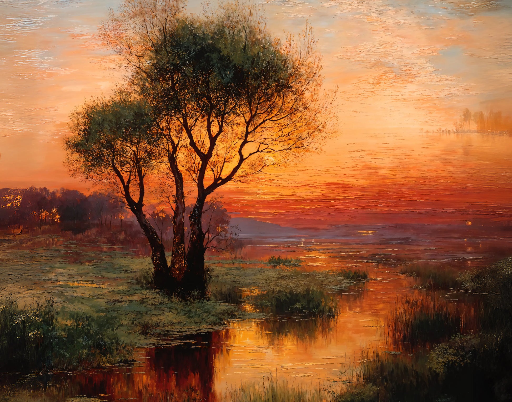 Afterglow captures the hush of autumn twilight—warm amber tones melted sky‑high, the marsh mirroring that glow, and nature sitting in reflection. Every brushstroke whispers calm, depth, and the soft departure of day.