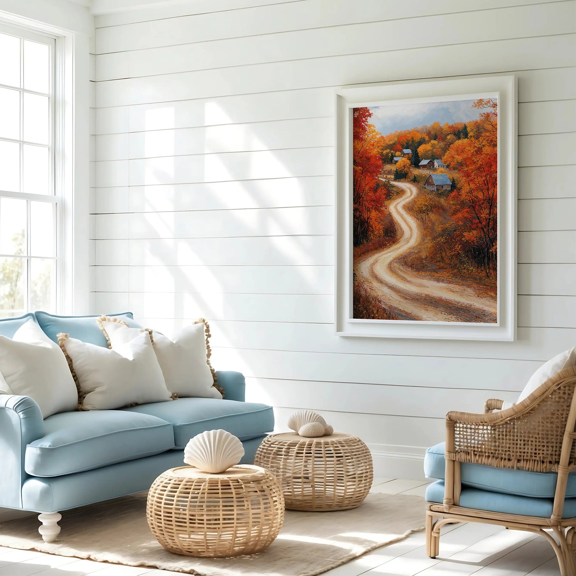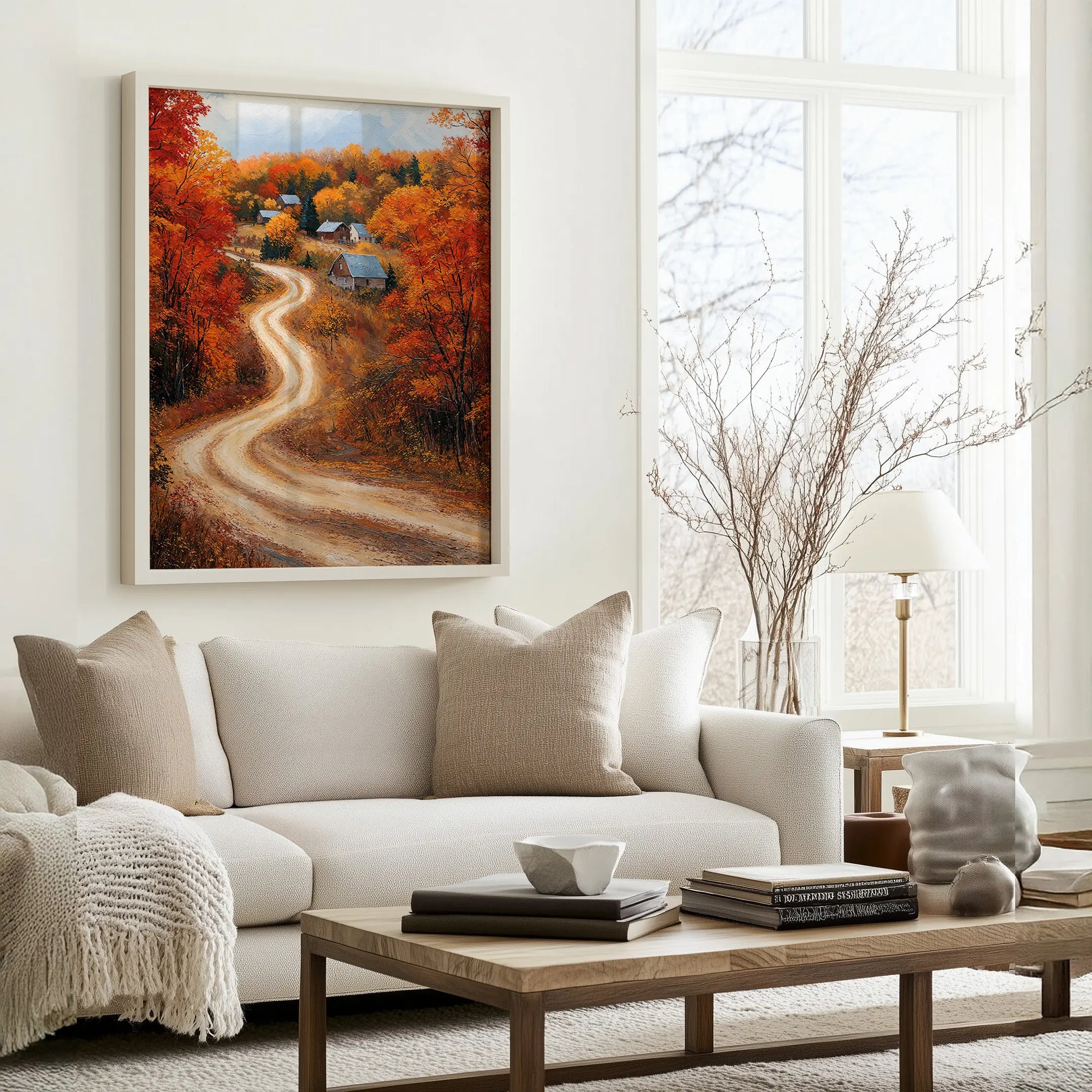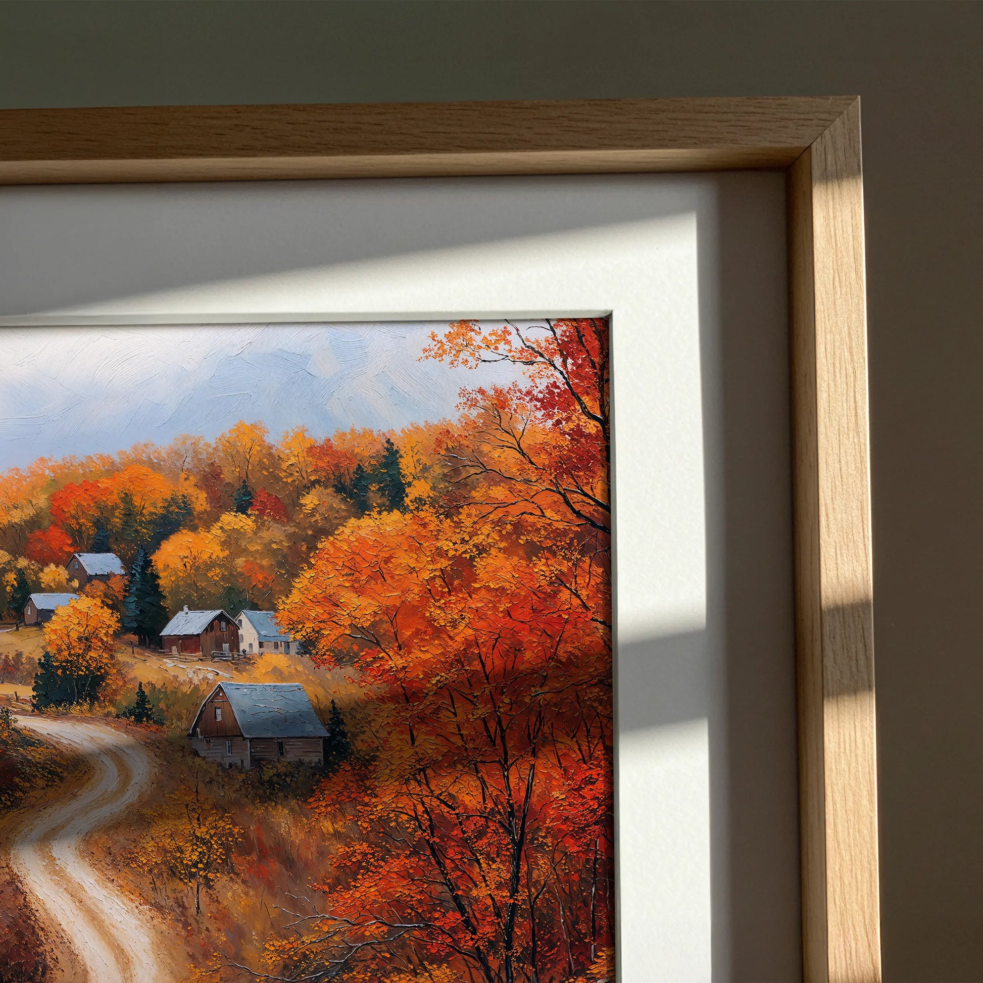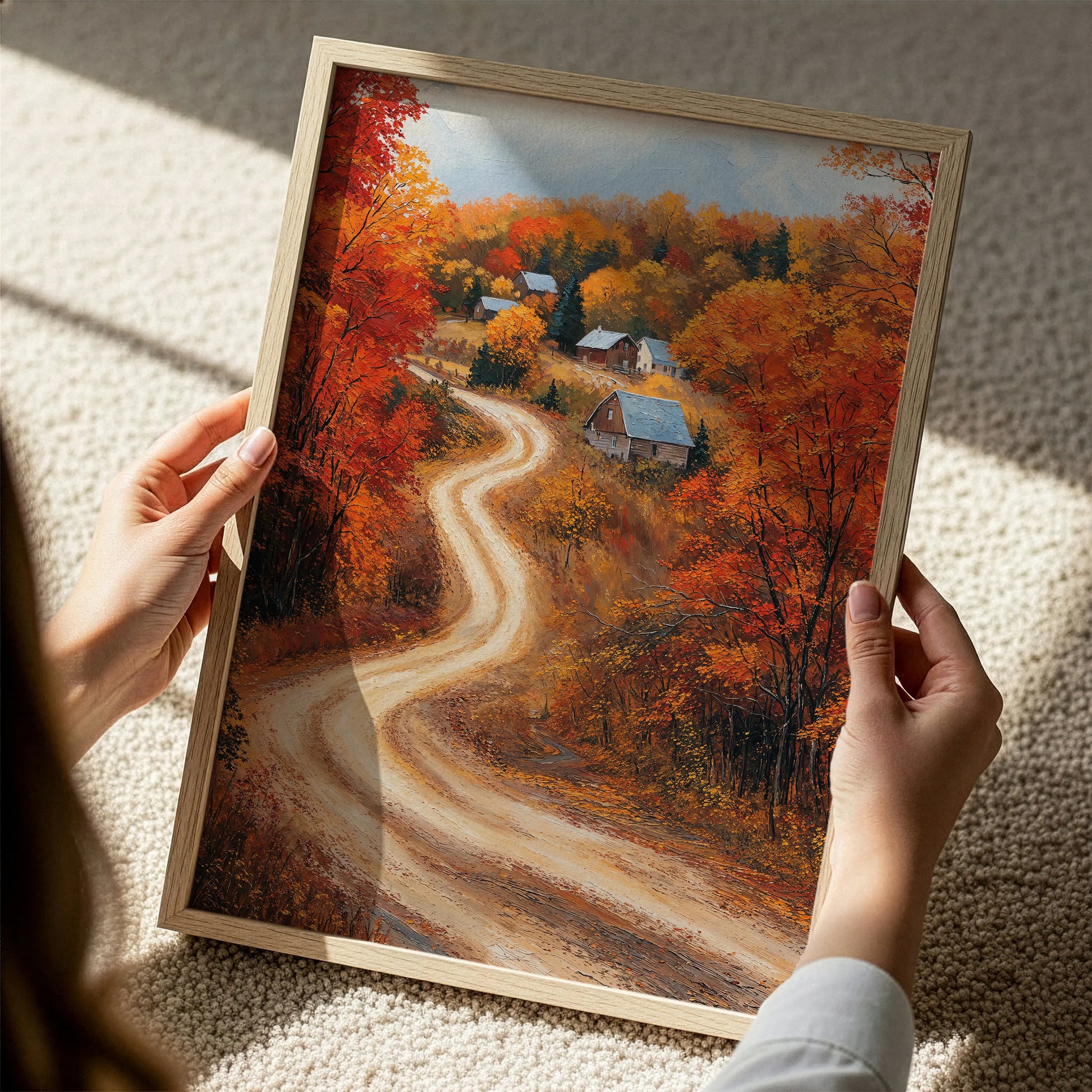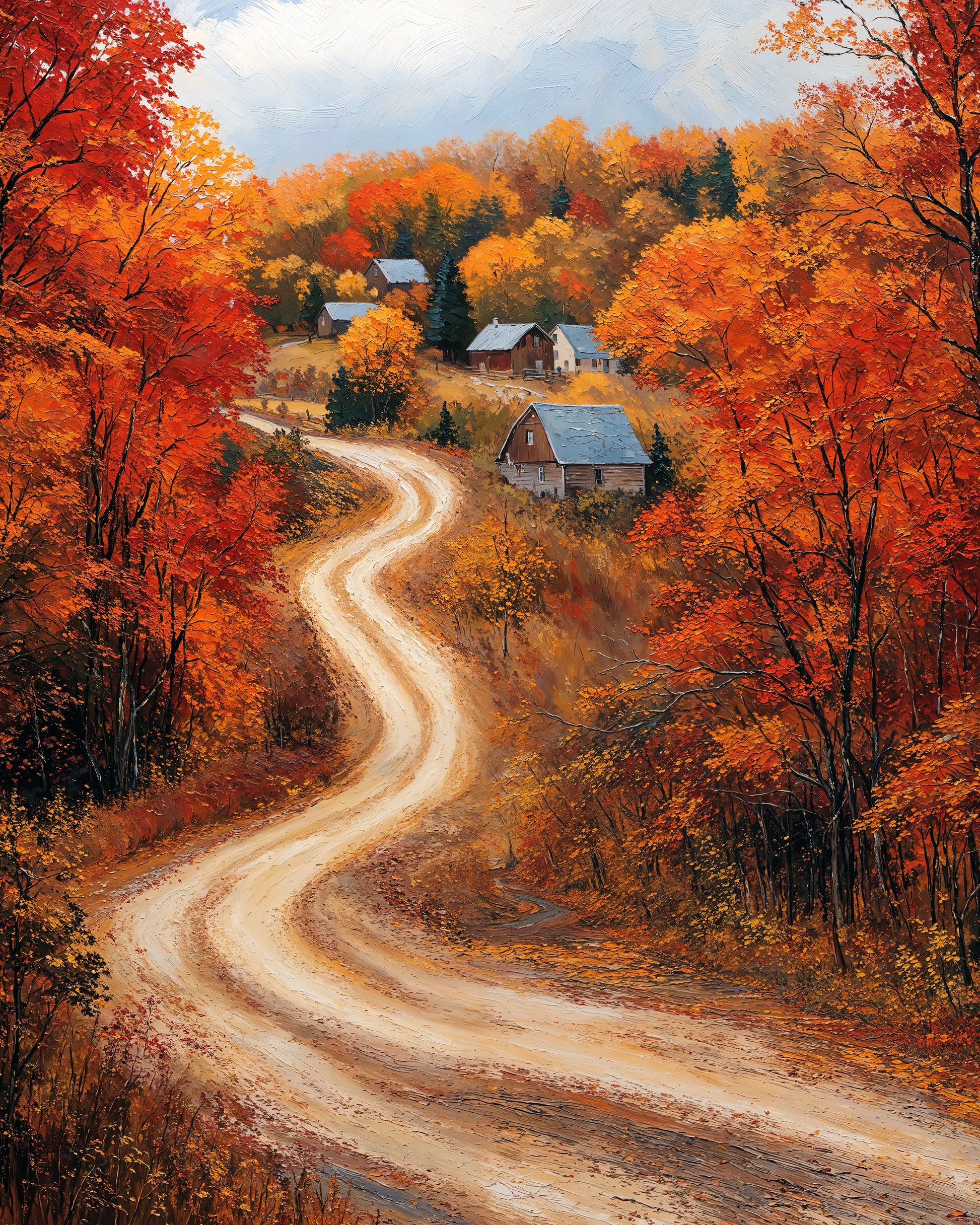 In Aksarben, a winding country road meanders through rolling hills ablaze with autumn color. Burnt orange, crimson, and gold pour through the trees, embracing scattered homesteads nestled among the foliage.
