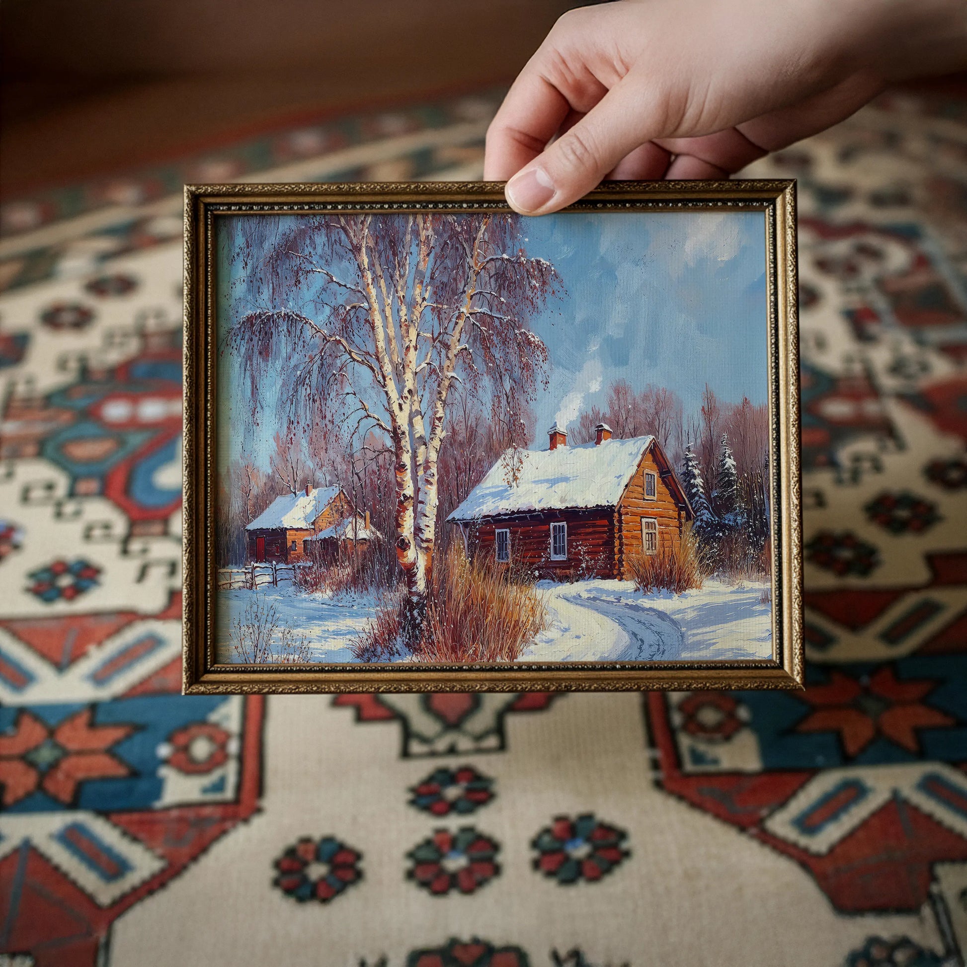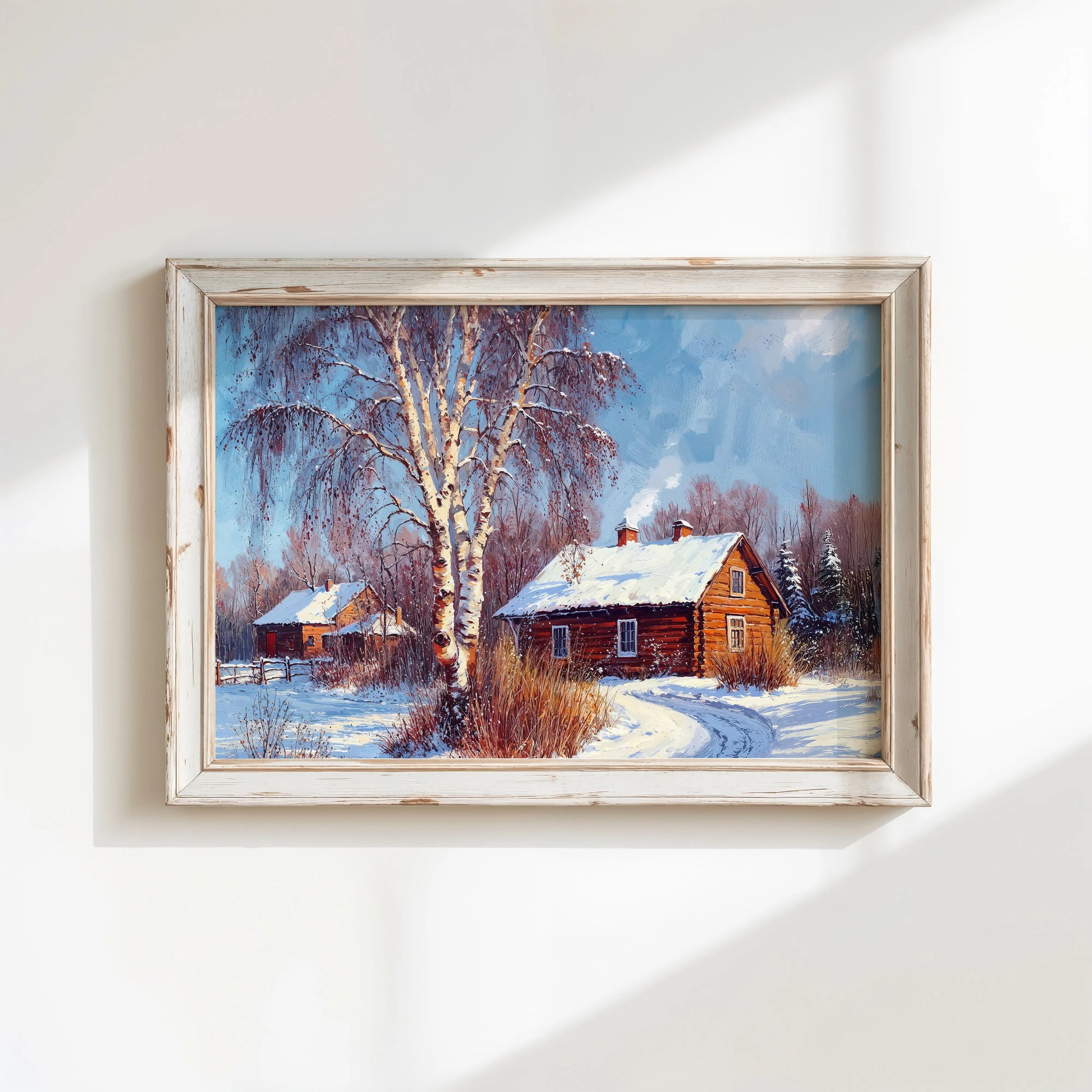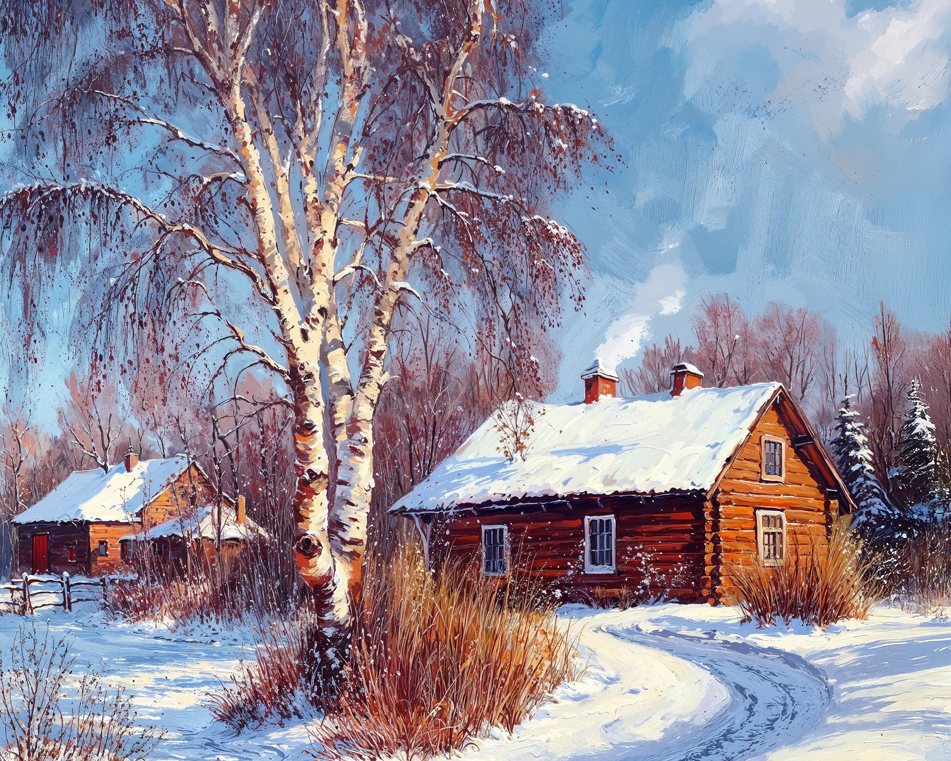 Alberta captures the stillness and warmth of a countryside winter morning. A rustic log cabin sits nestled among snowy birch trees, with smoke curling from the chimney under a crisp blue sky.