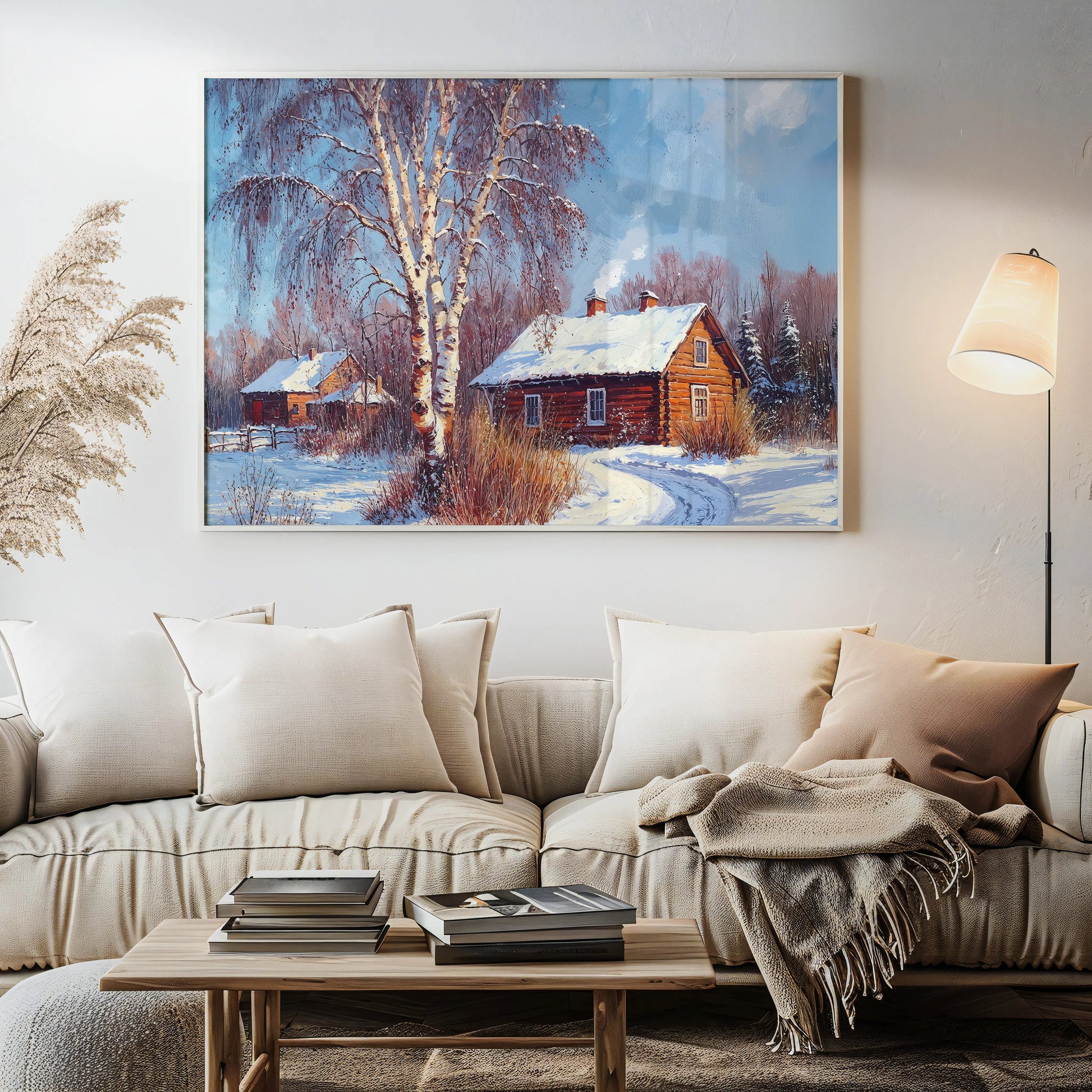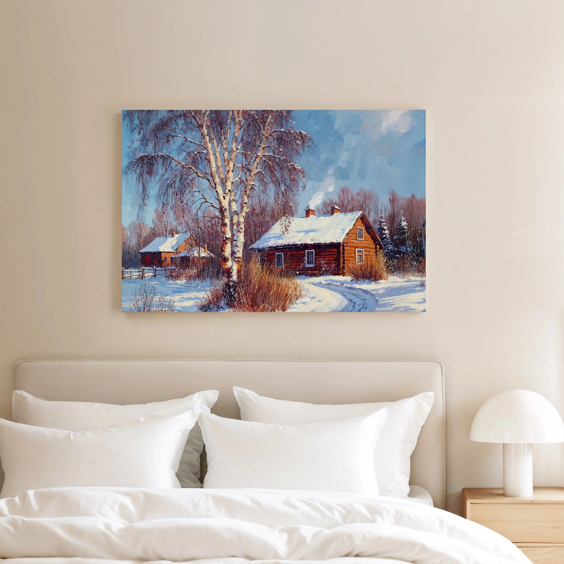This stunning stretched canvas is ideal for winter decor, offering a timeless, cozy atmosphere for your living room, hallway, or cabin retreat.