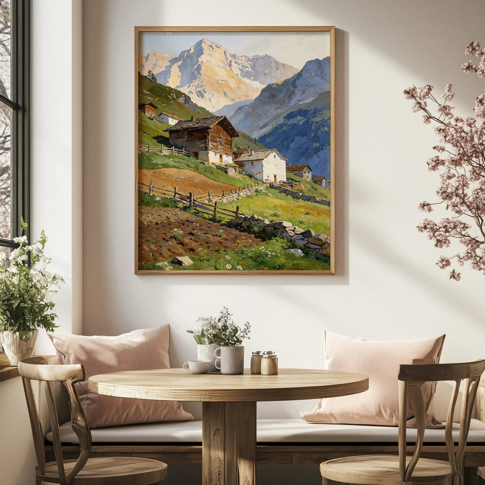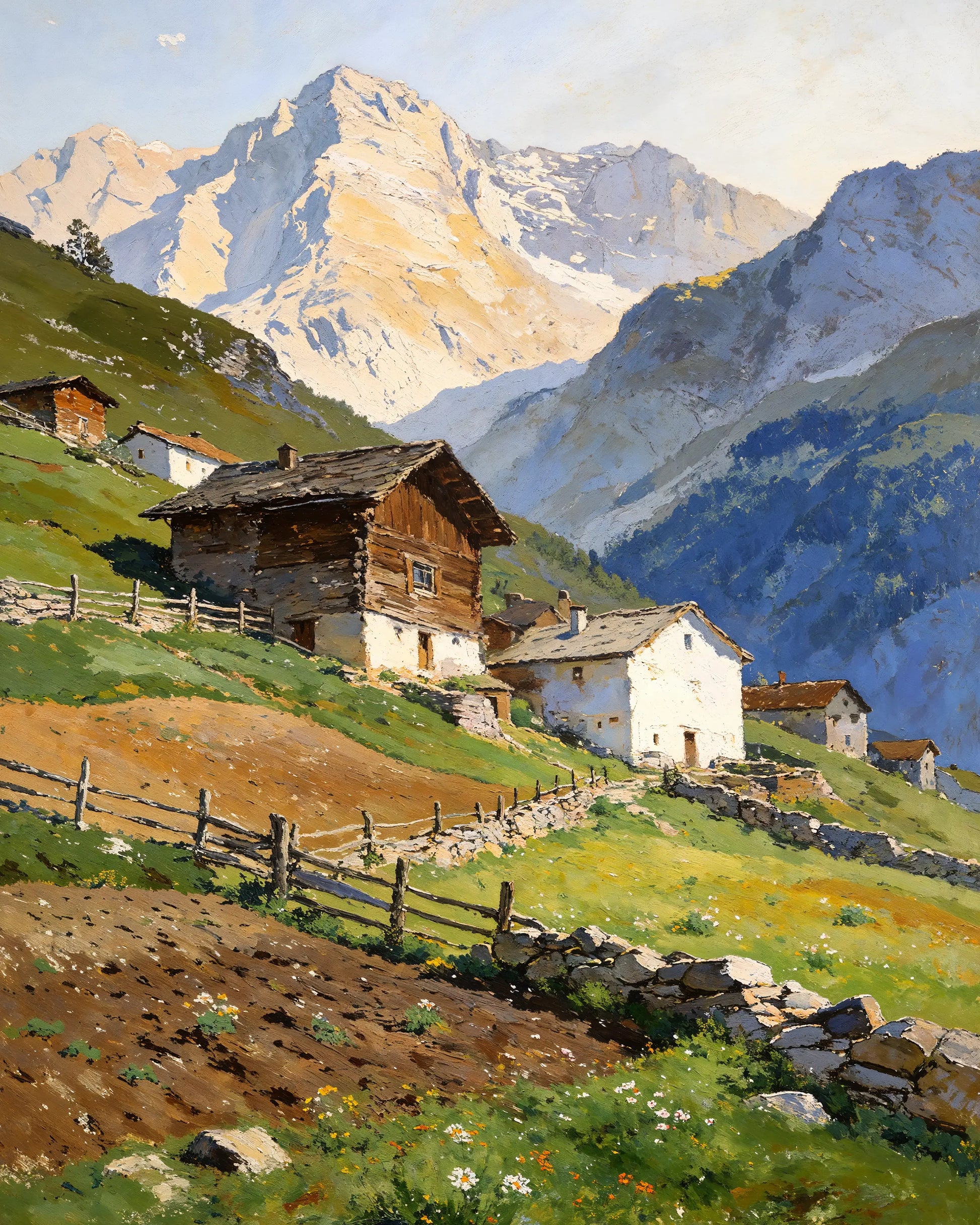 Morning settles over an alpine hillside where small houses cluster along green slopes. Sun touches pale peaks above, and the valley opens in cool layers, with fences, stone paths, and meadows leading the eye upward through clear air and quiet distance.