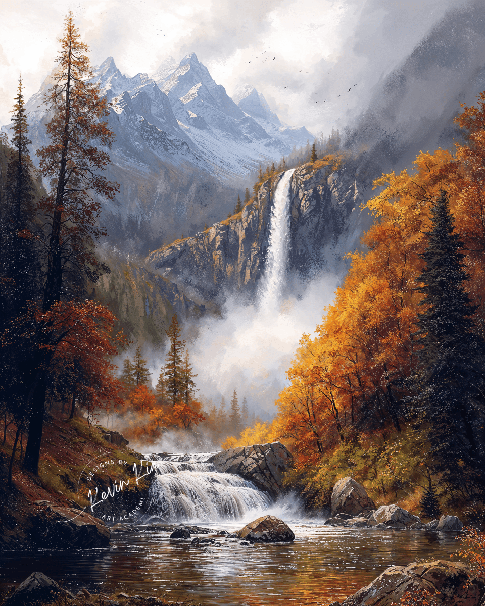 Water carves its voice through mountains in Majestic, where a glacier-fed waterfall descends with rhythmic grace into an autumn-cradled basin. Crimson and gold leaves ignite the foreground, while mist climbs through alpine pines toward distant, snow-laced peaks. The entire landscape breathes—calm, expansive, awake.