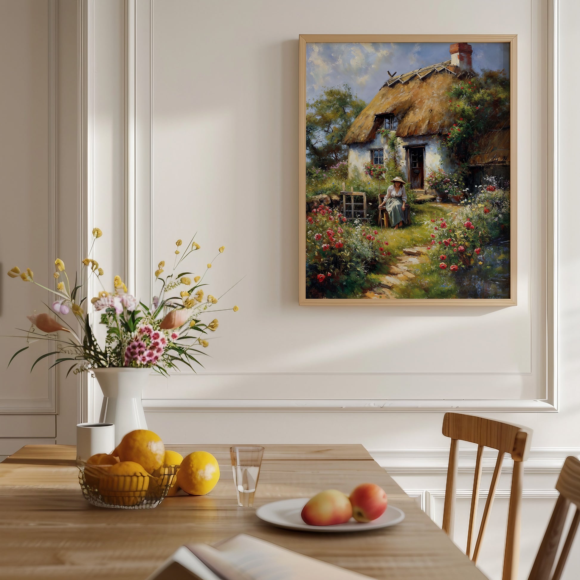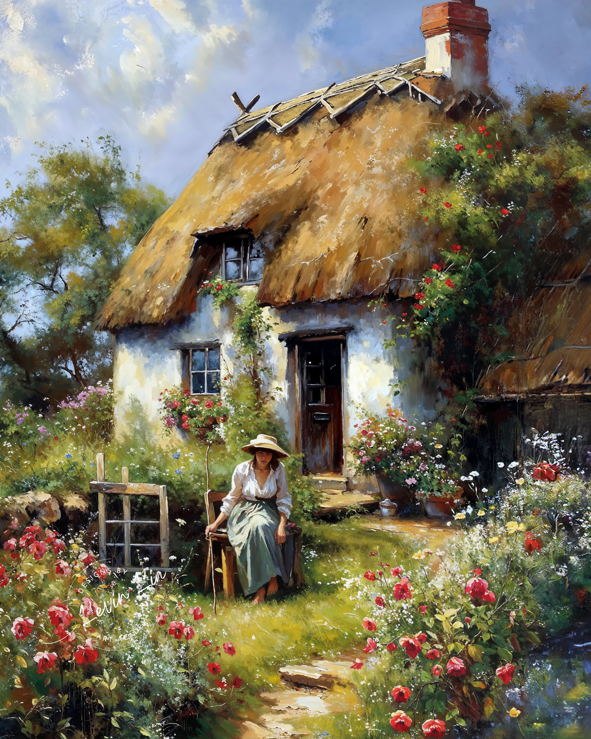 Anima Floris moves in quiet rhythm. A barefoot woman rests outside a thatched cottage, surrounded by wild roses and the soft hush of summer—stillness and landscape blend, where time leans instead of passing.