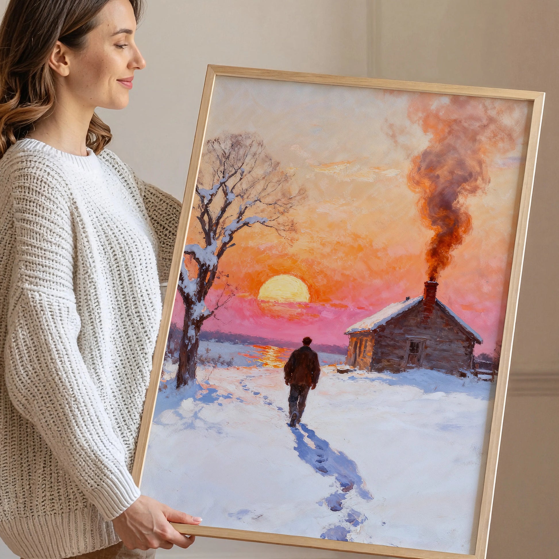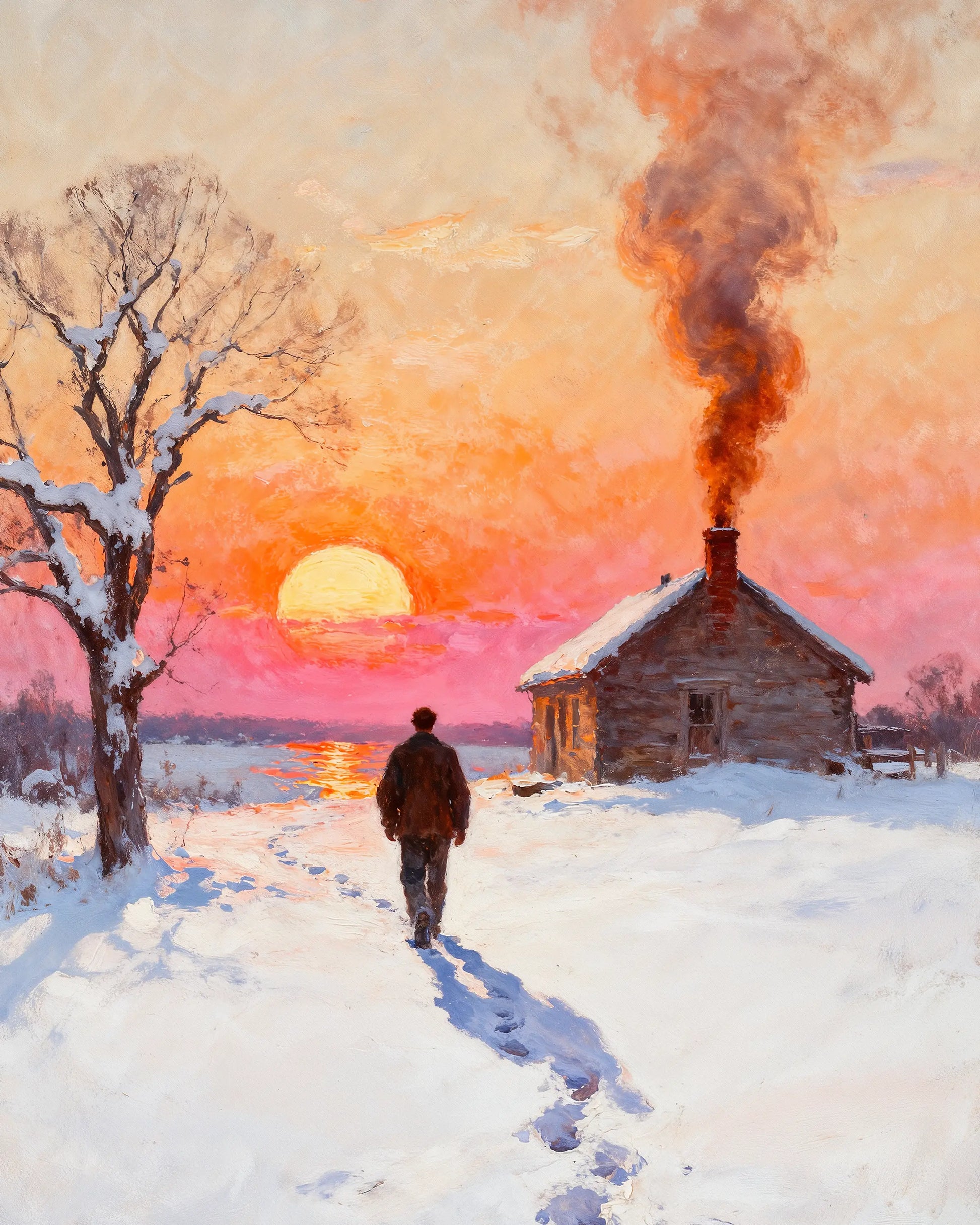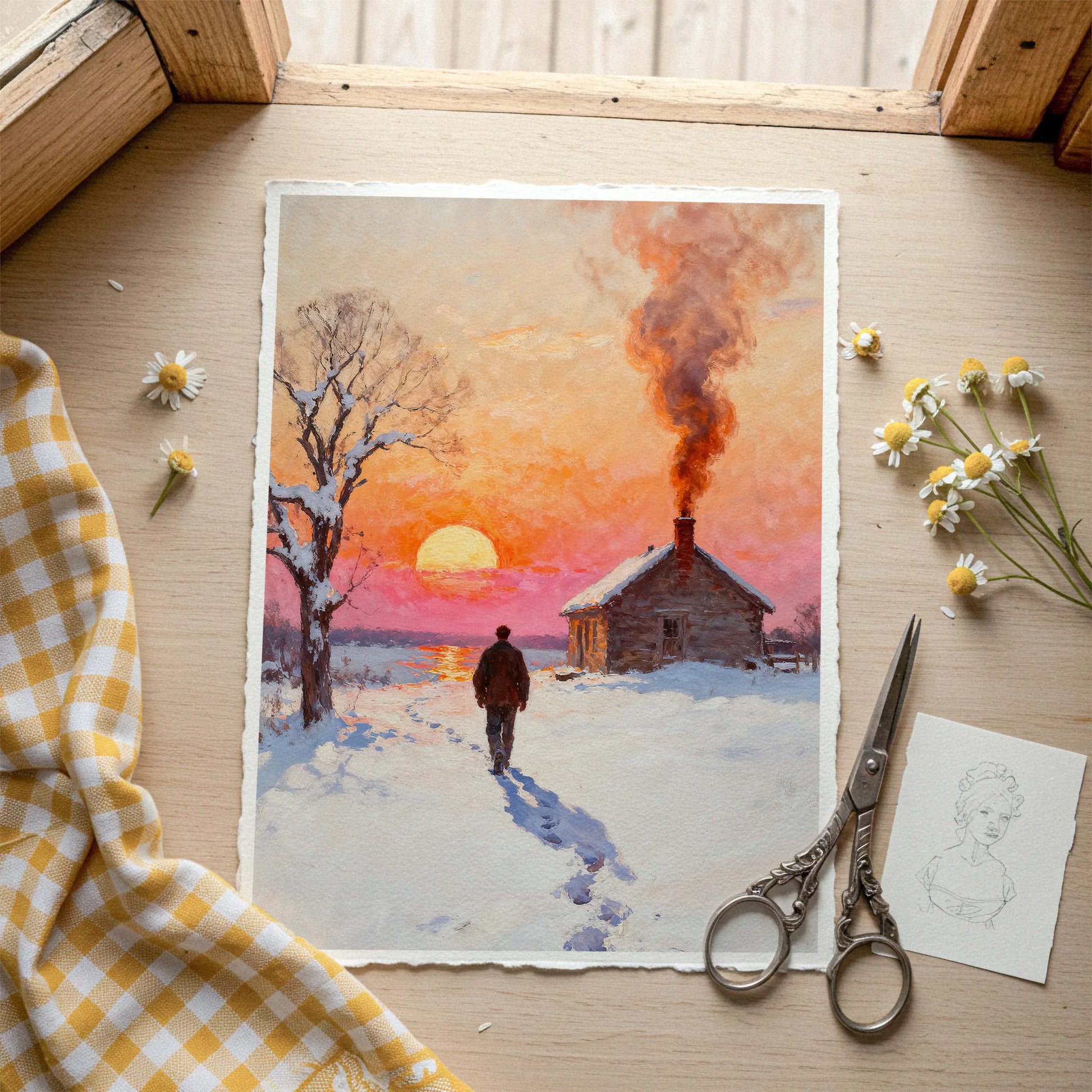 Fate unfolds in a world of snow and fire, where a solitary figure walks toward a humble cabin as the sun sinks low, igniting the sky in shades of rose and ember. Each brushstroke glows with warmth against the surrounding chill—smoke rising like memory from the chimney, footprints tracing the quiet inevitability of return.
