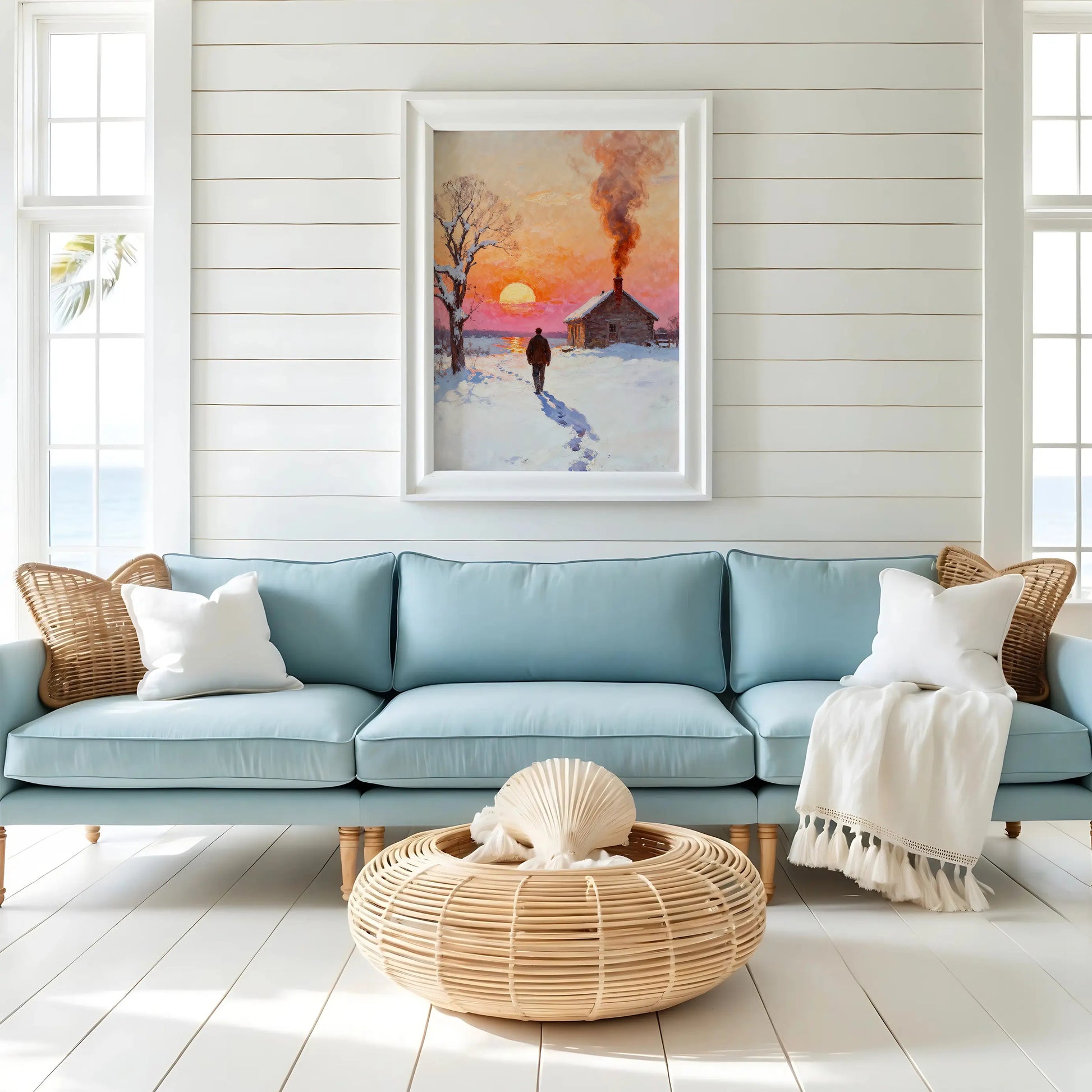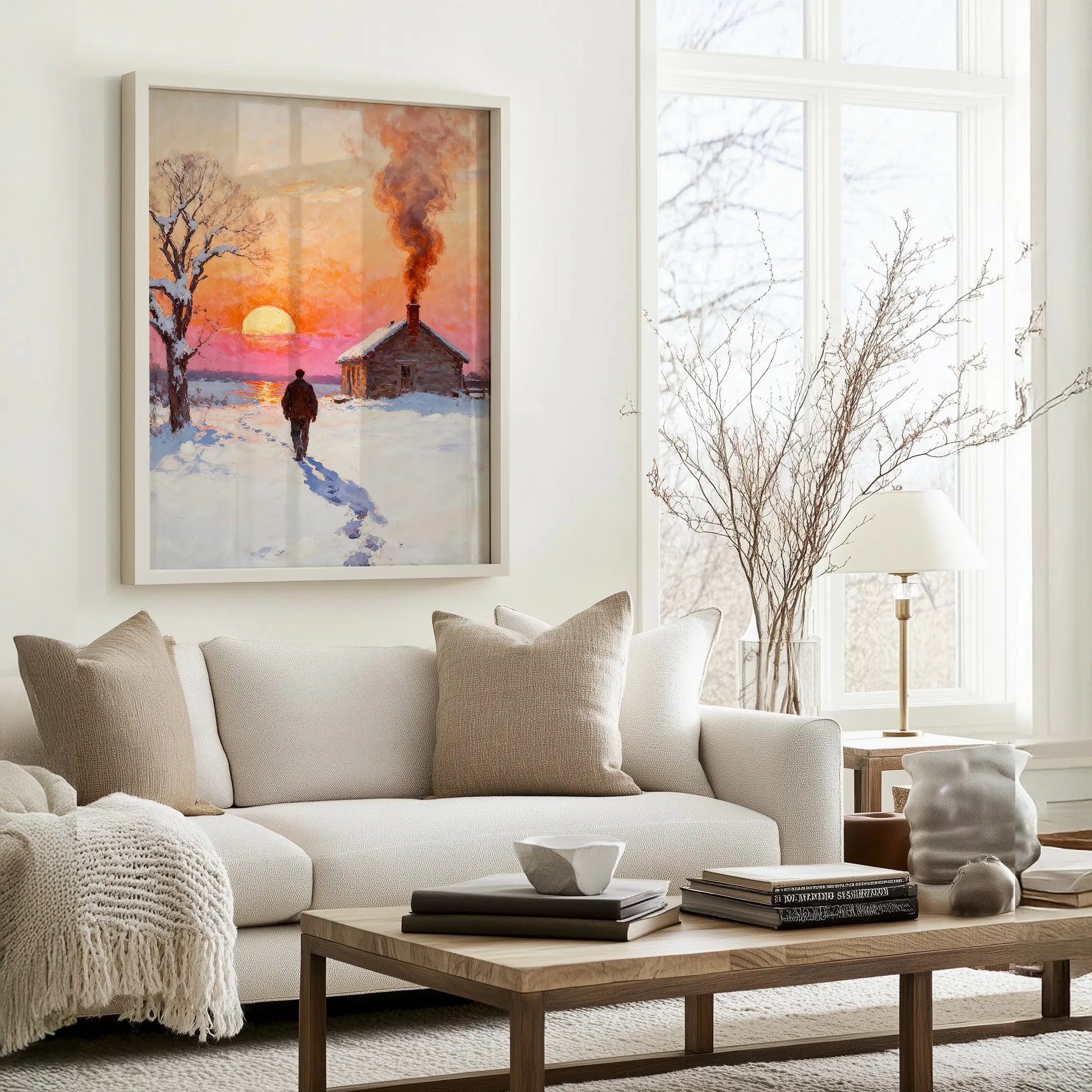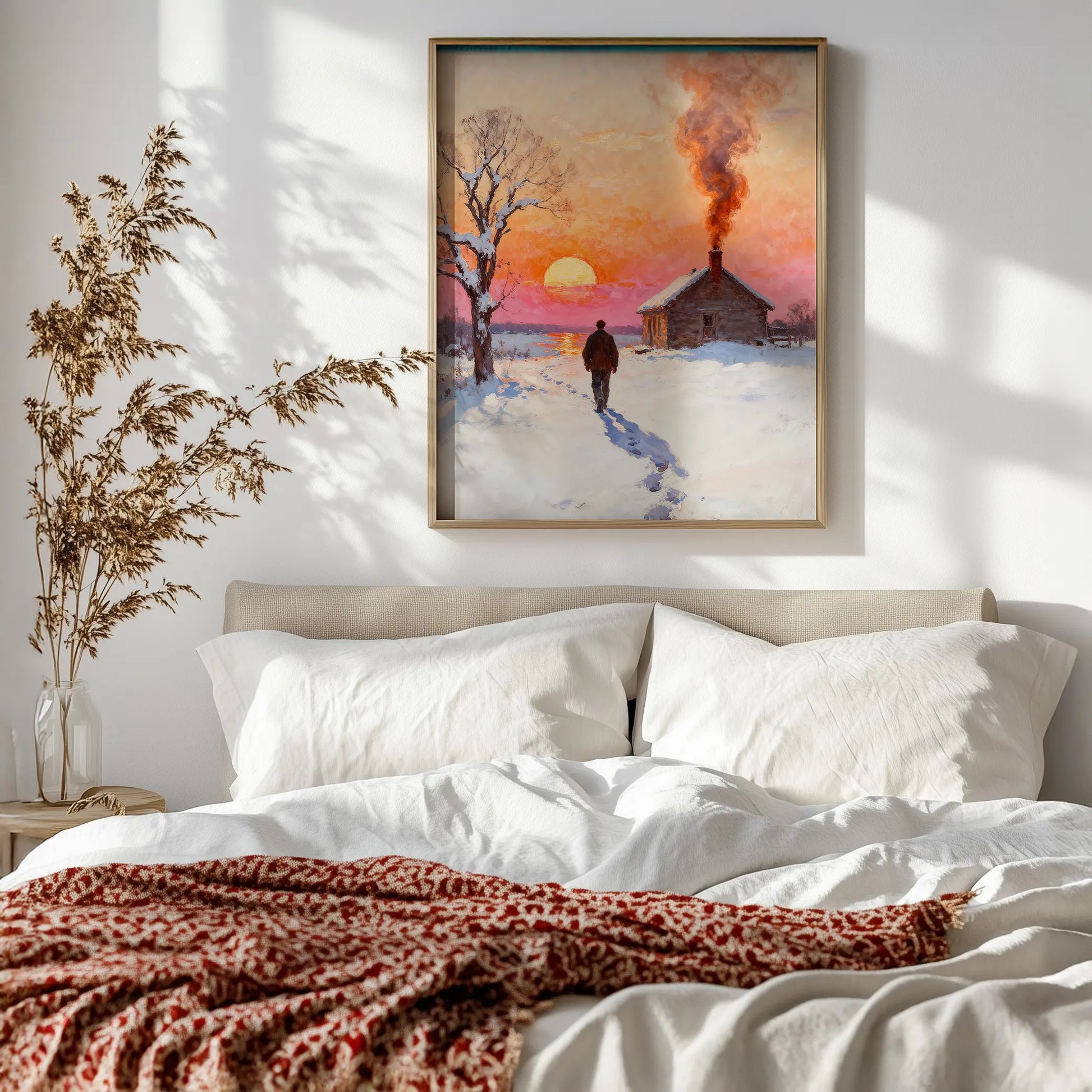 Fate unfolds in a world of snow and fire, where a solitary figure walks toward a humble cabin as the sun sinks low, igniting the sky in shades of rose and ember. Each brushstroke glows with warmth against the surrounding chill—smoke rising like memory from the chimney, footprints tracing the quiet inevitability of return.