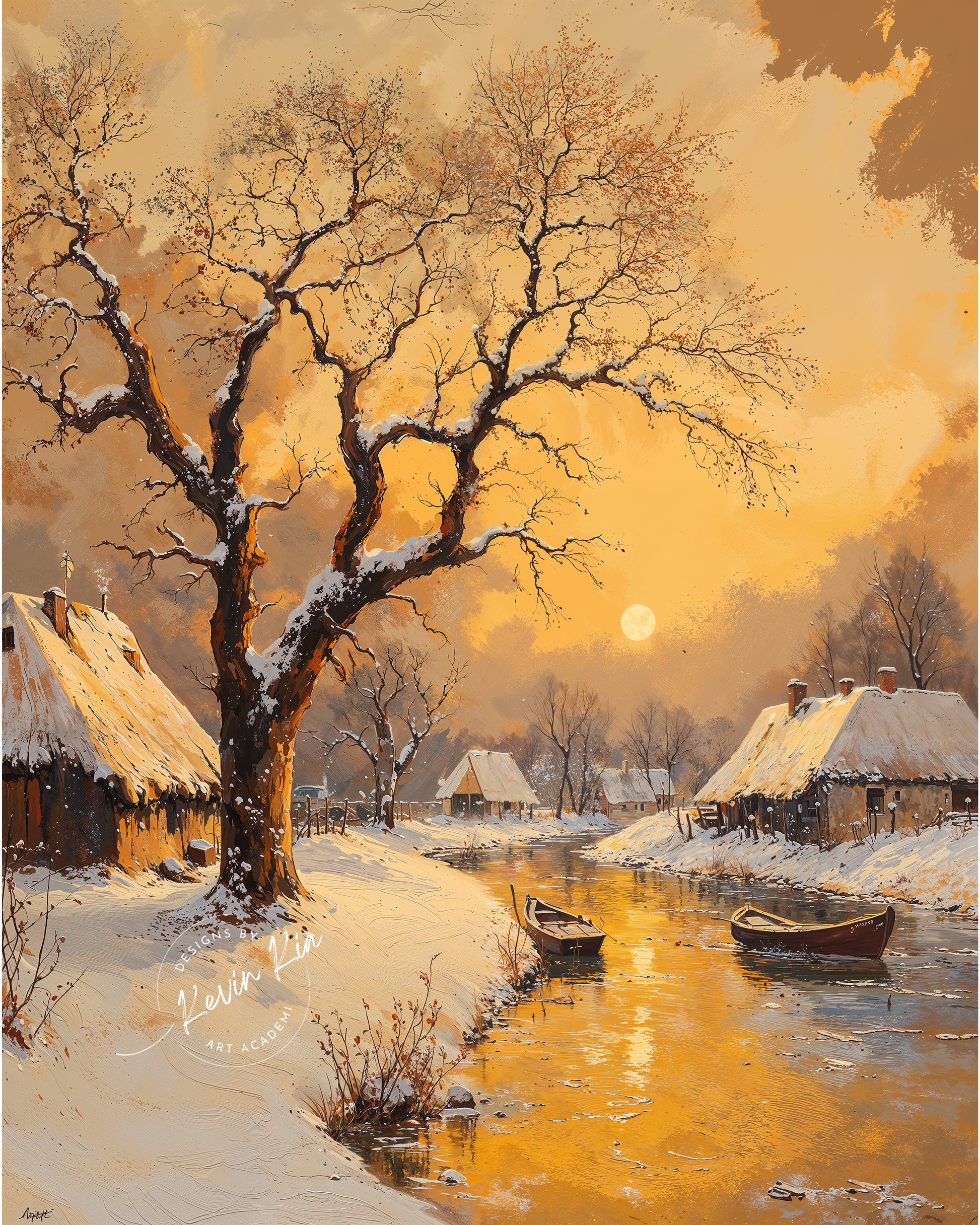 Aura traces a winter evening’s final warmth across a snow-laced village. Moonrise glows behind frosted rooftops, while the last blush of sun lingers on a slow-moving stream. Two moored boats drift slightly, suspended in reflection. Time feels hushed, as if the world is caught in quiet reverence.