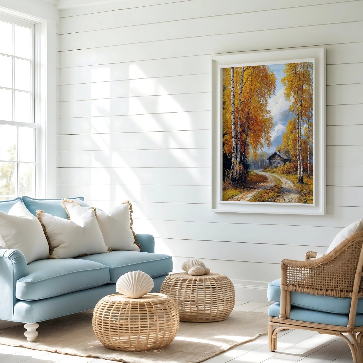 Birchwood Reverie unfolds like a quiet invitation—an S-shaped trail winding gently through golden birch, guiding the eye toward a modest wooden cabin embraced by fall. Trees rise like watchful pillars, their white bark glowing against a sky tempered with soft blue and slate.