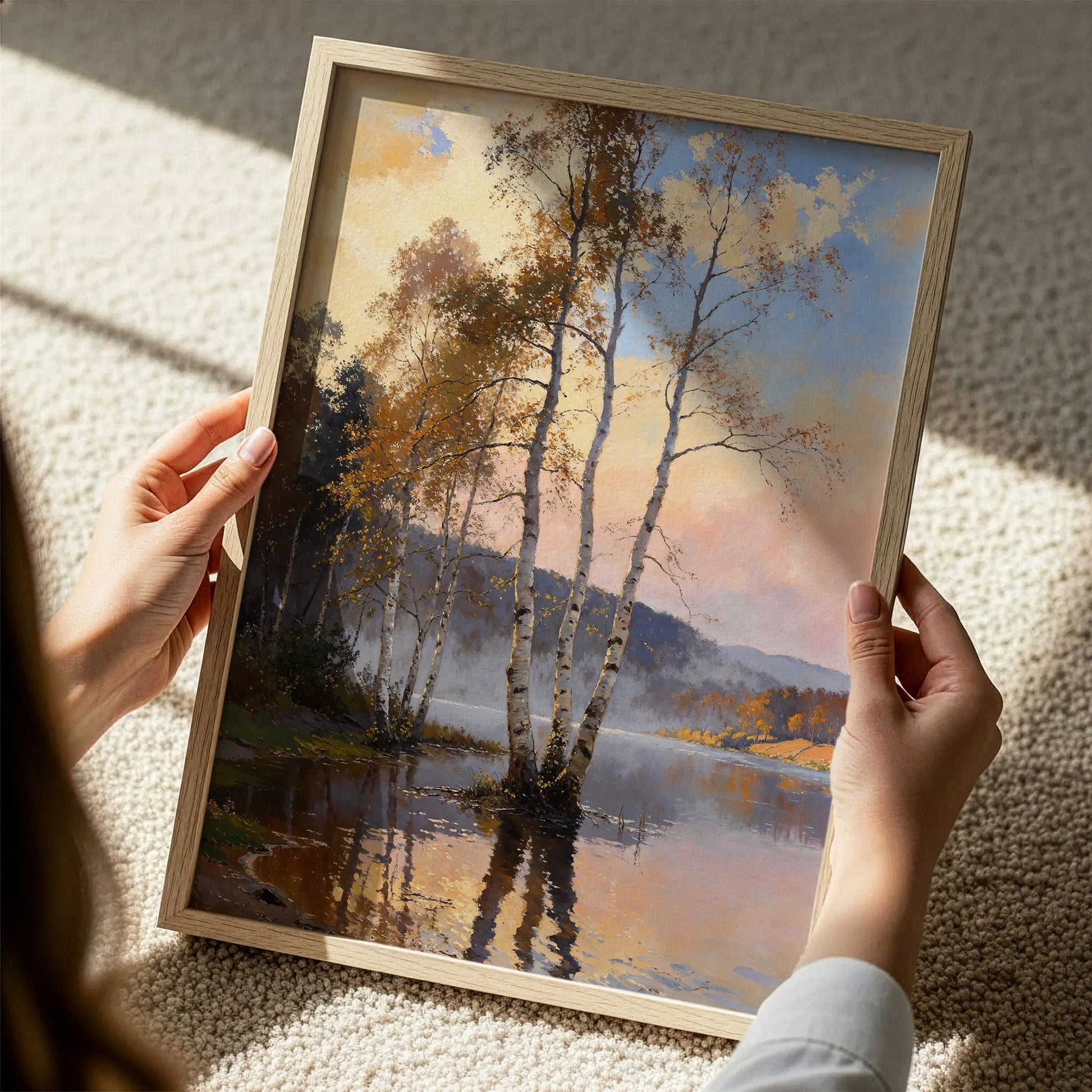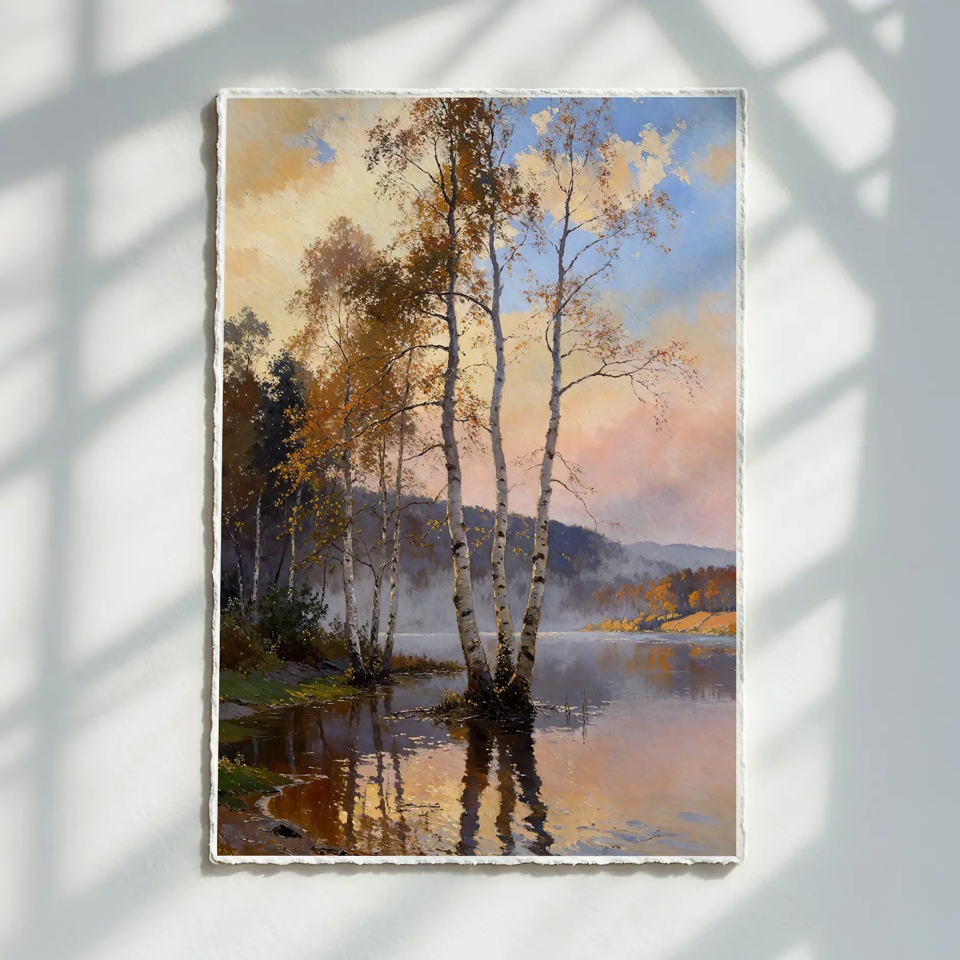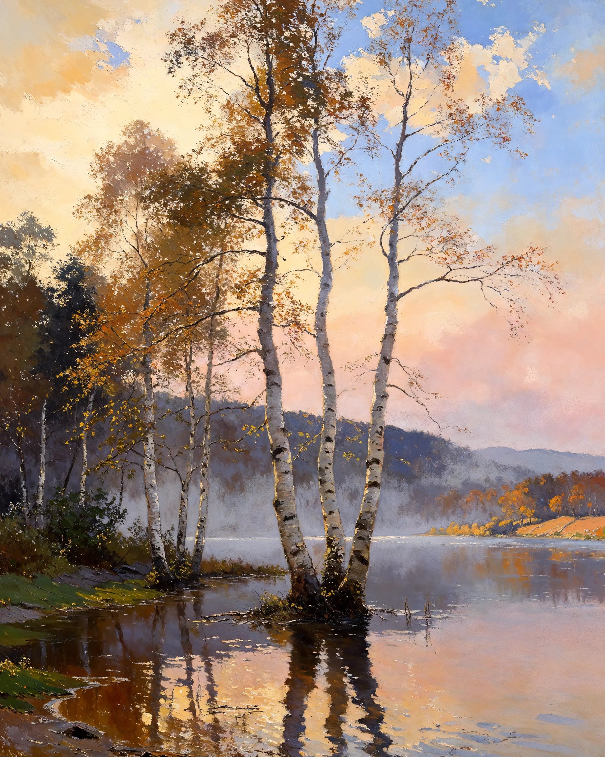 Slender birch trunks rise from calm lake water, their pale bark catching late autumn light beneath an open sky. 3 Musketeers offer quiet steadiness, inviting the eye to rest within gentle transitions of light and surface. Subtle handwork supports depth without insistence.