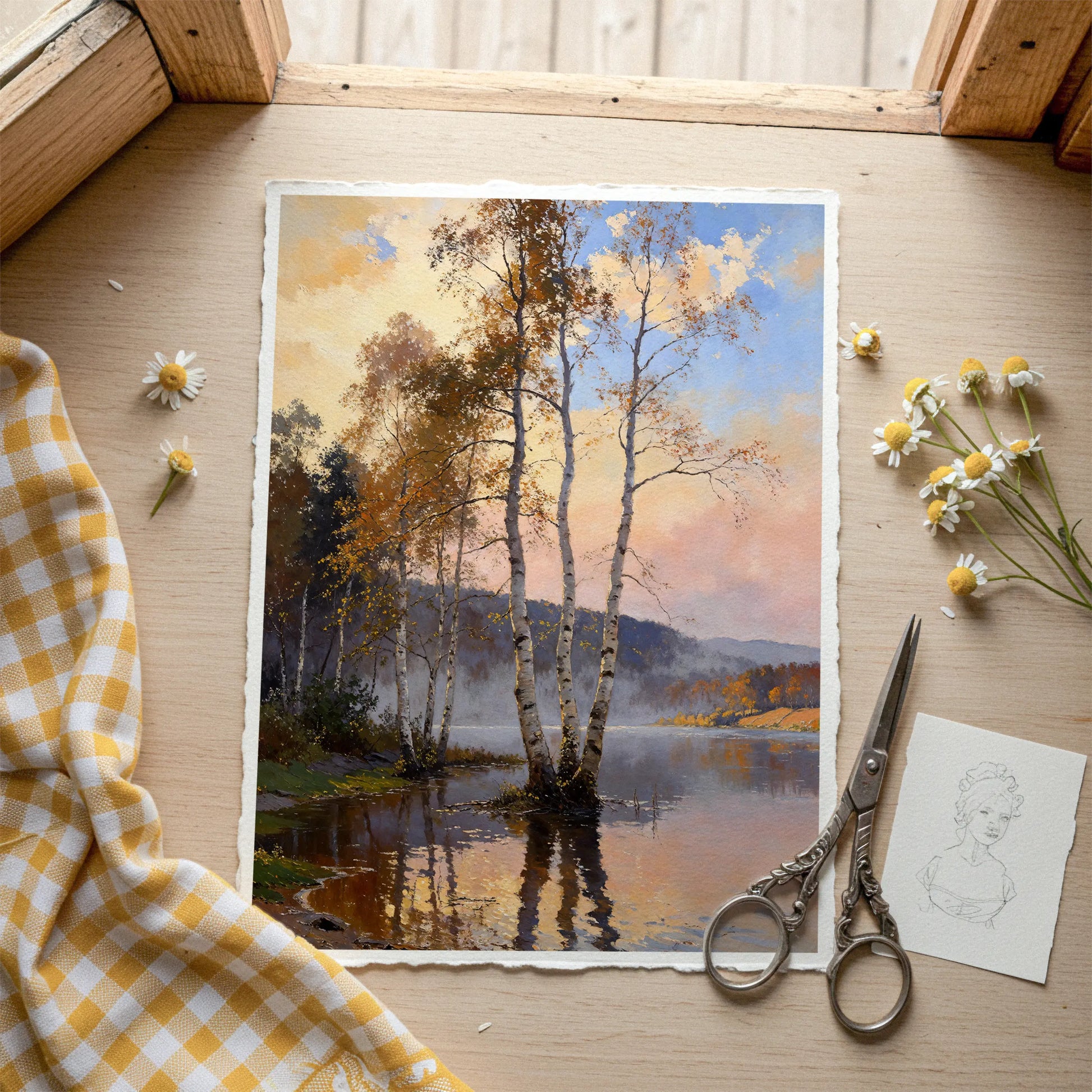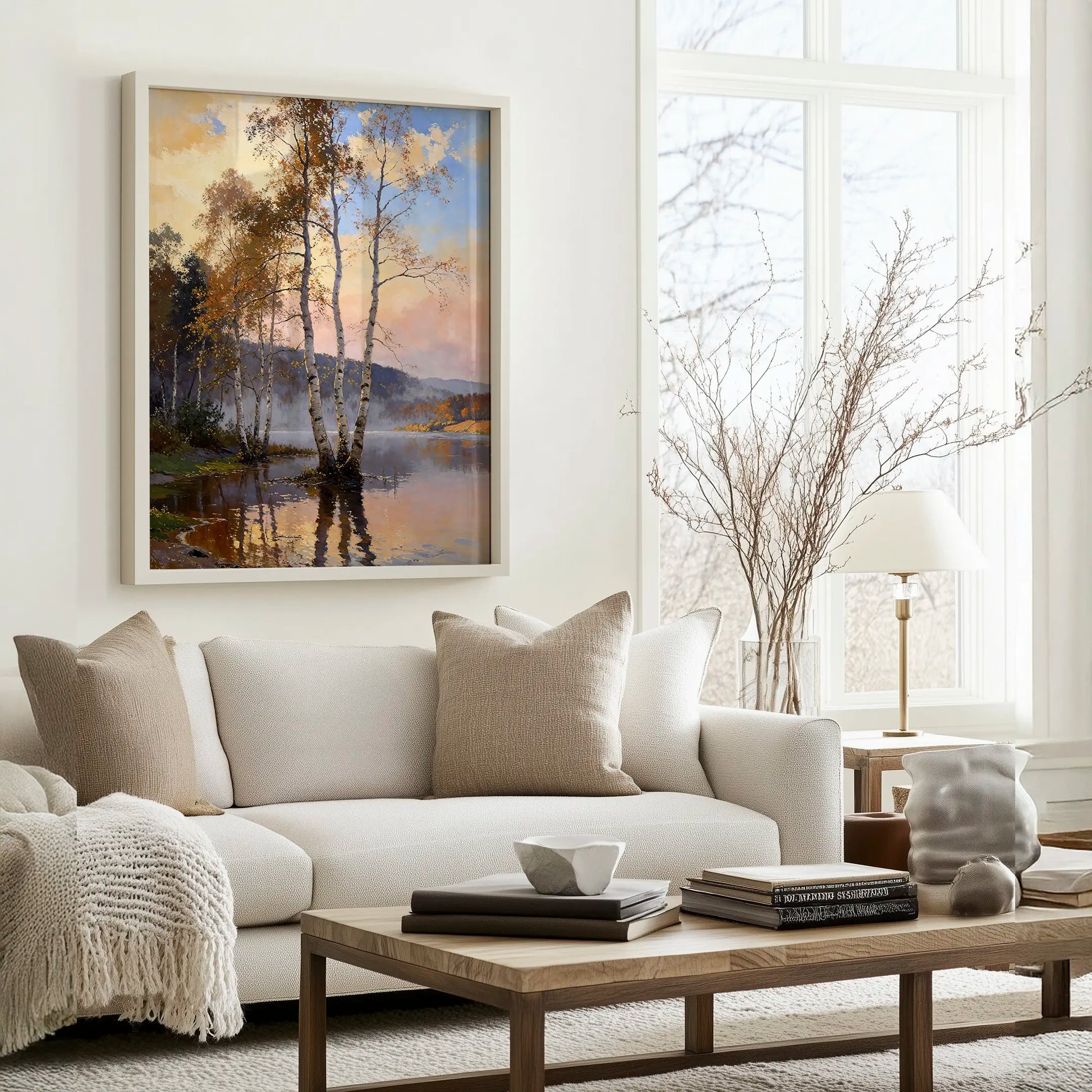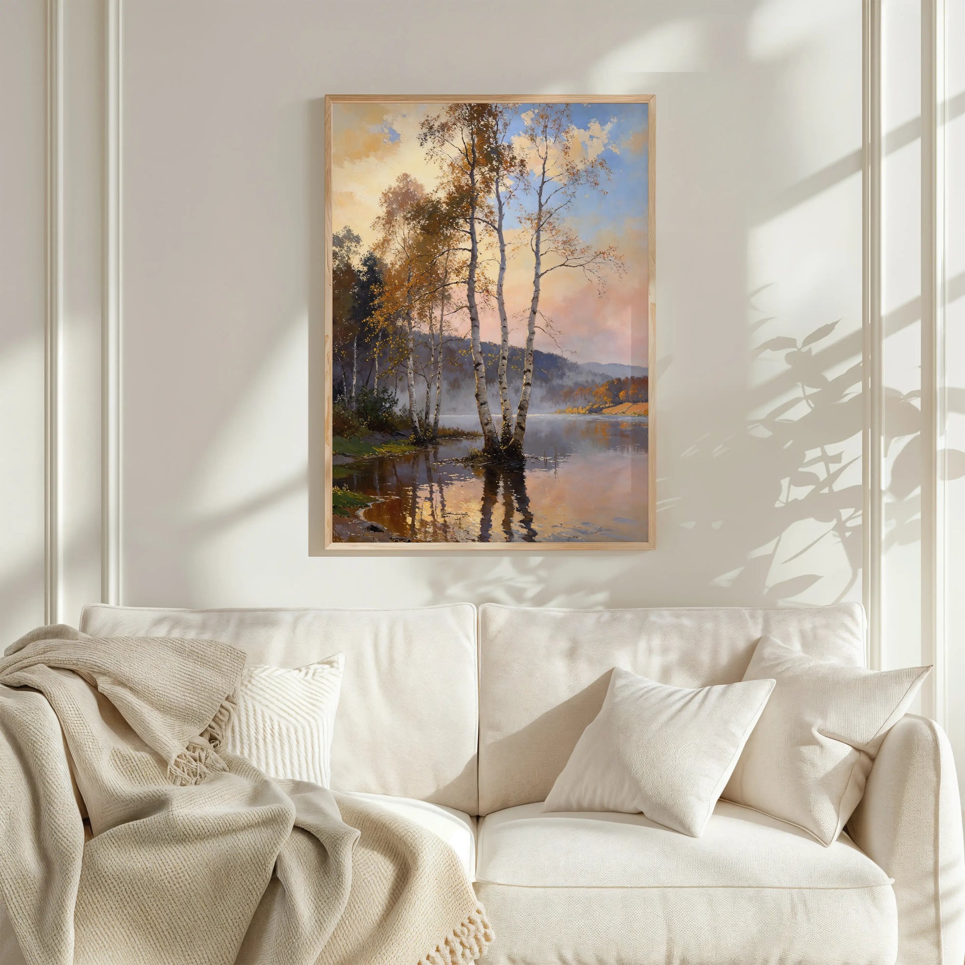 Slender birch trunks rise from calm lake water, their pale bark catching late autumn light beneath an open sky. 3 Musketeers offer quiet steadiness, inviting the eye to rest within gentle transitions of light and surface. Subtle handwork supports depth without insistence.