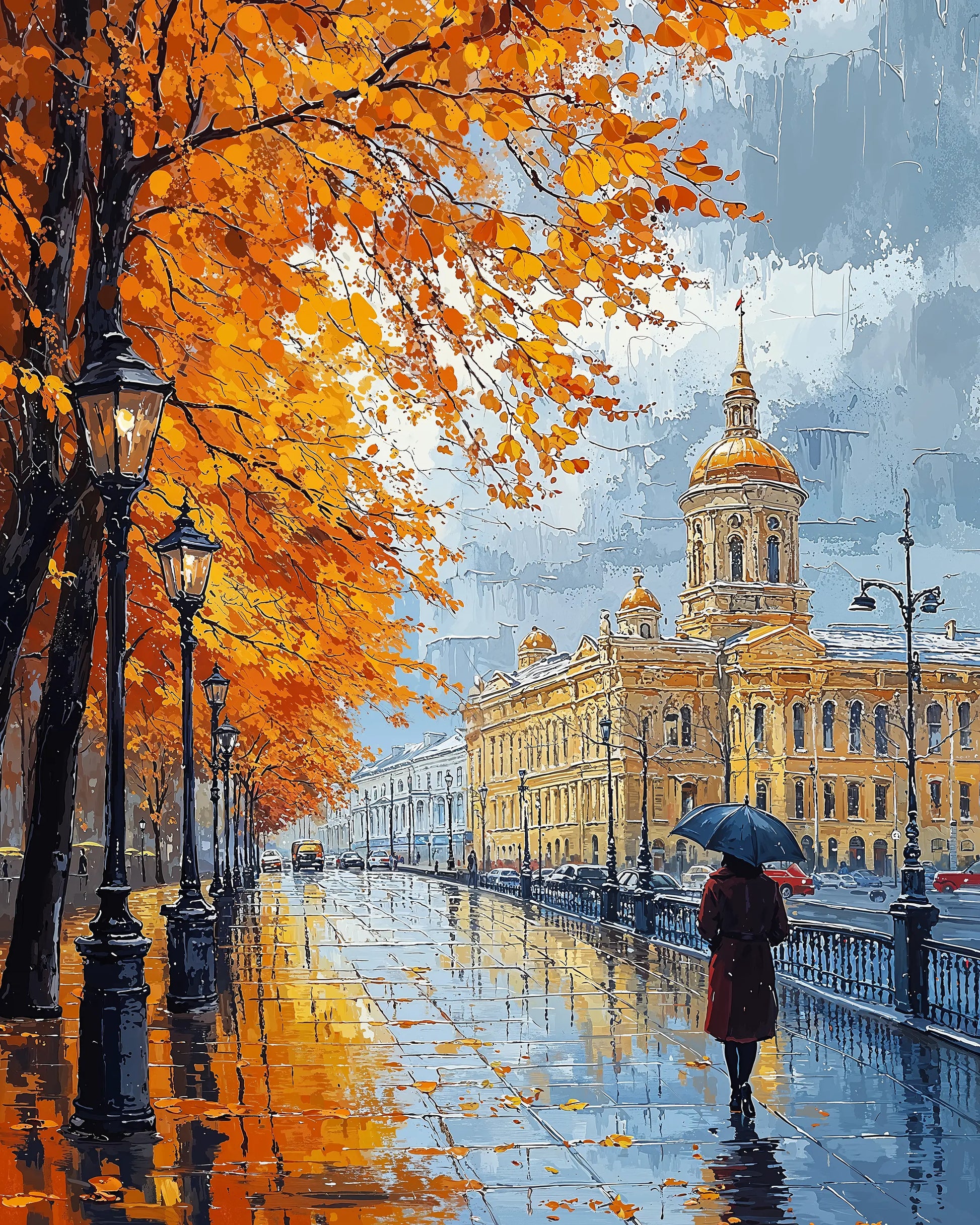 Autumn Sonata unfolds beneath golden boughs and soft rain, where fallen leaves scatter like notes from a quiet melody. Amber streetlamps glow along a rain-slick promenade, guiding a lone figure walking inward, not lost.