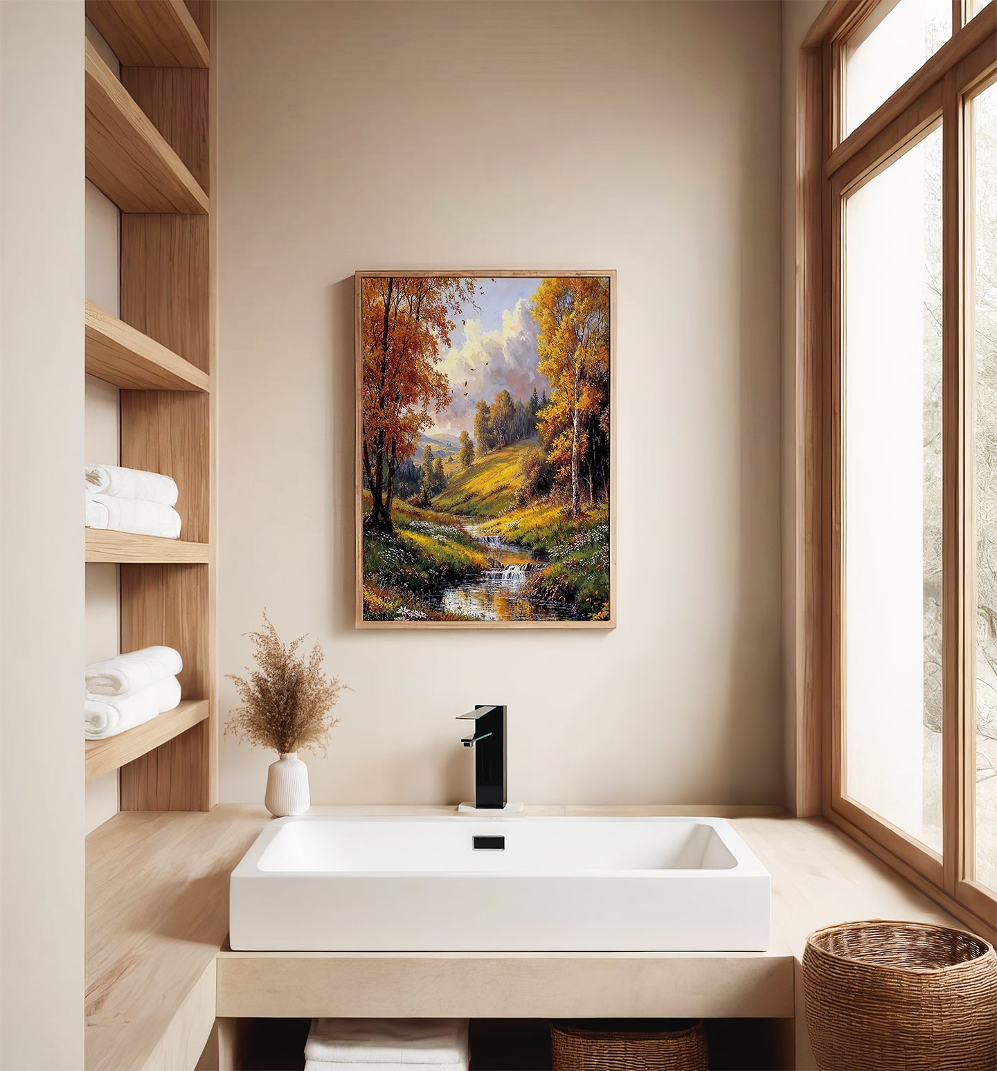 Autumn Valley curves around a stream that moves with the rhythm of thought—quiet, reflective, enduring. Trees flare in golden brilliance, their trunks catching the last of the season’s warmth while clouds drift above like softened echoes. Water tumbles gently over stones, guiding the eye through layers of pastoral light.