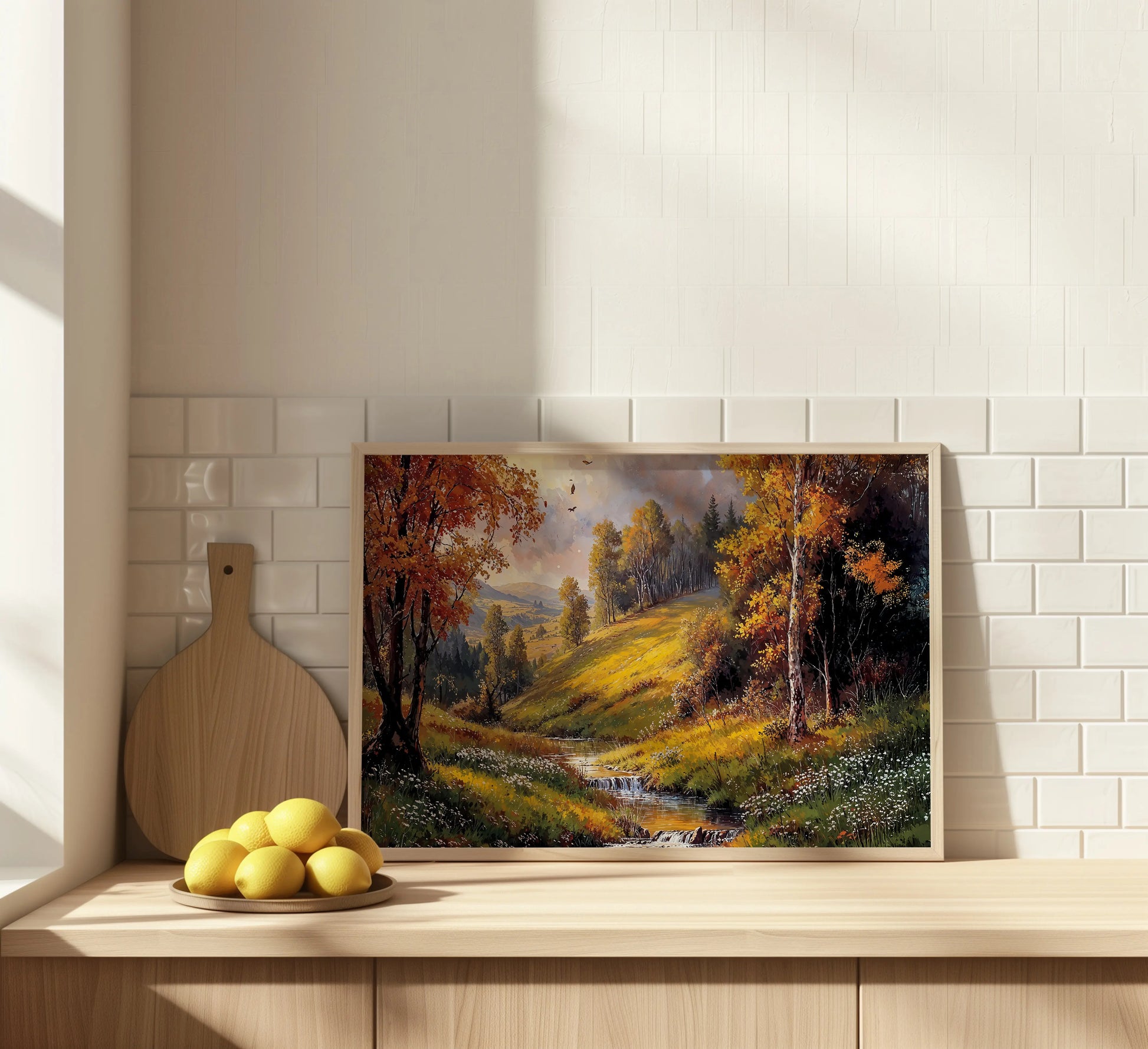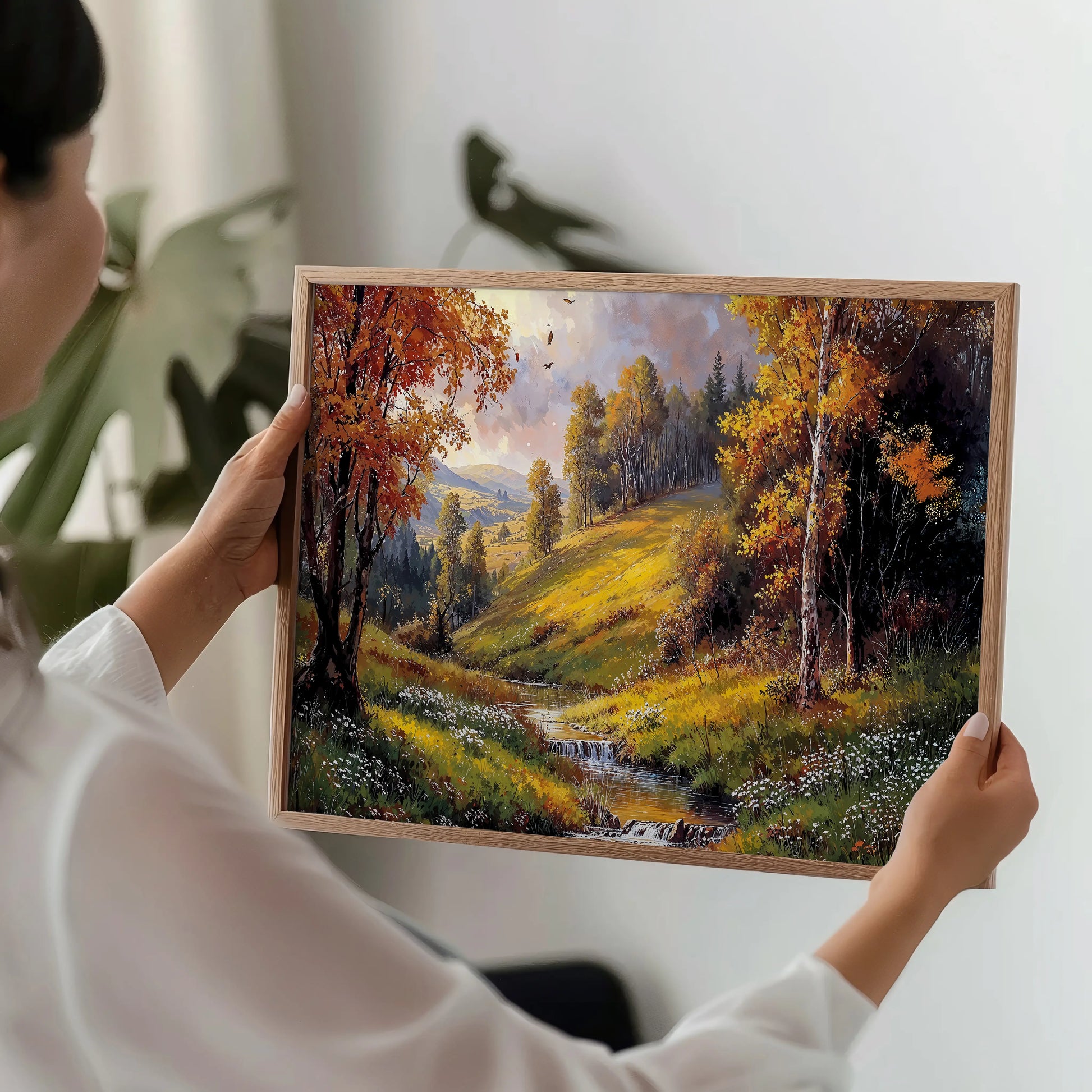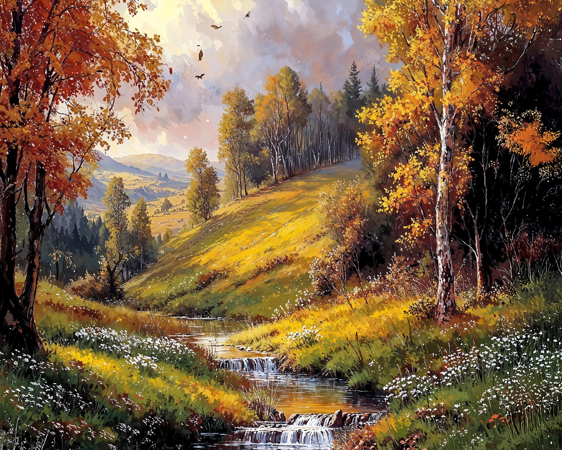 Autumn Valley brings the peacefulness of an autumn valley to life. A meandering stream gently flows through wildflower-dotted hills under a golden sky, while trees in fiery shades frame the scene.