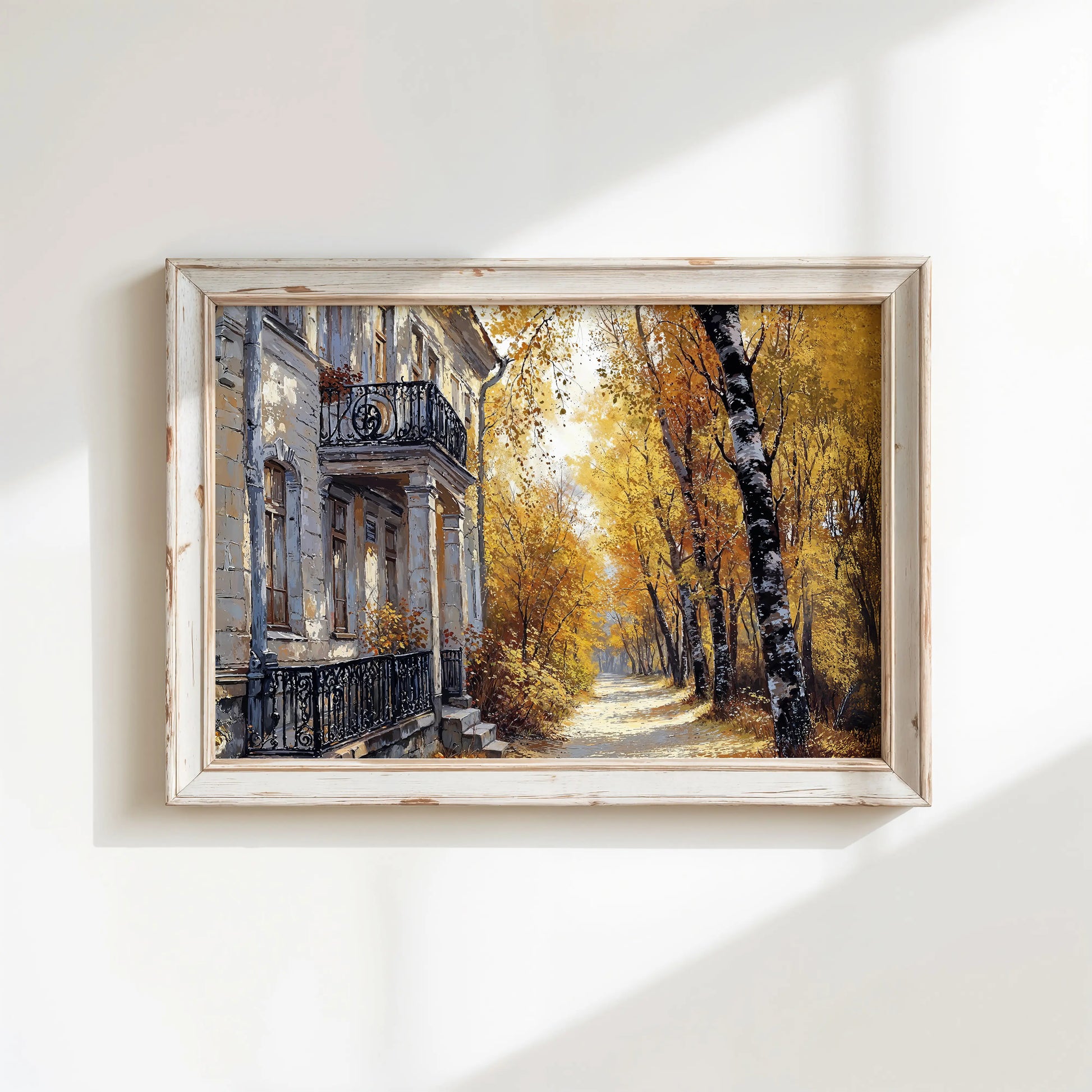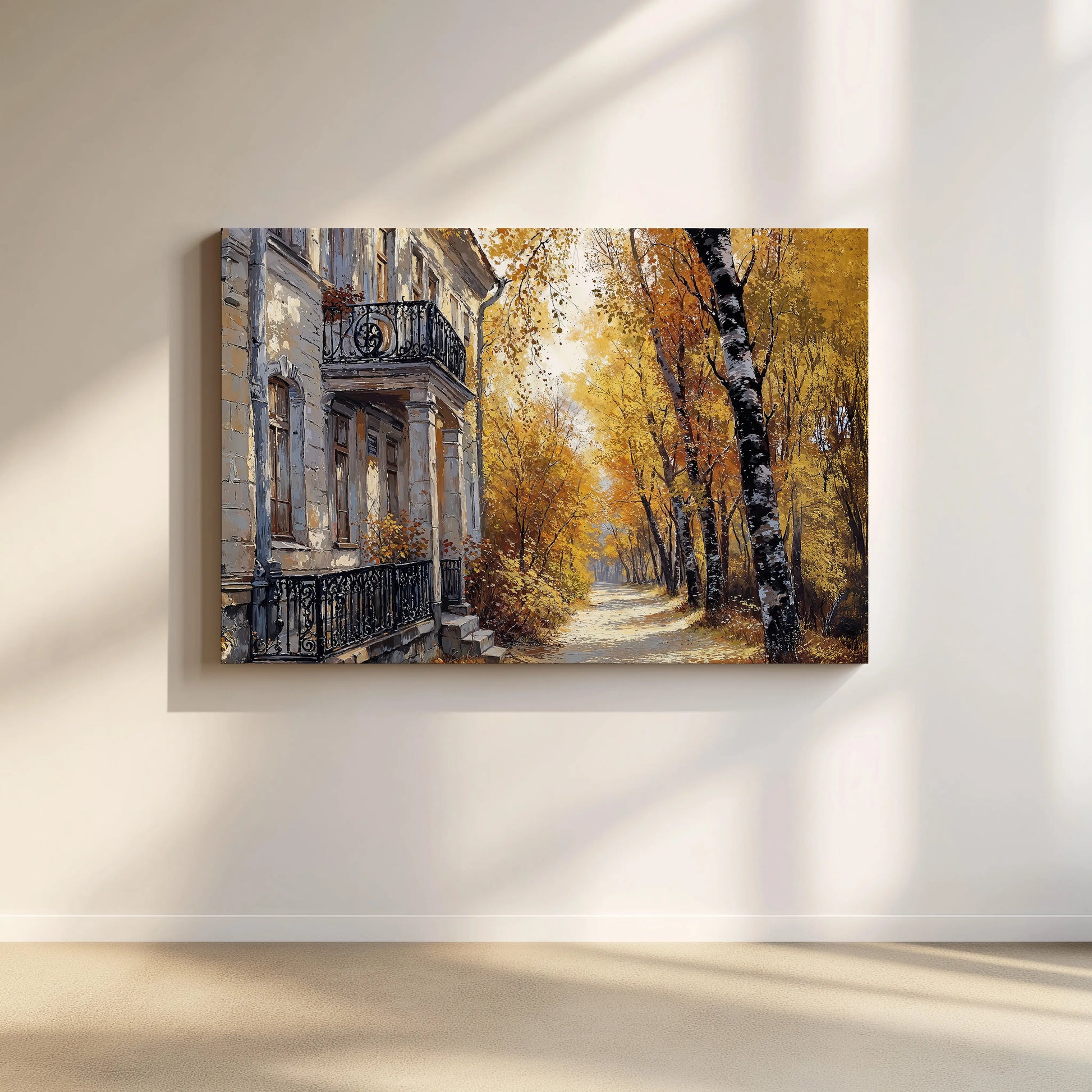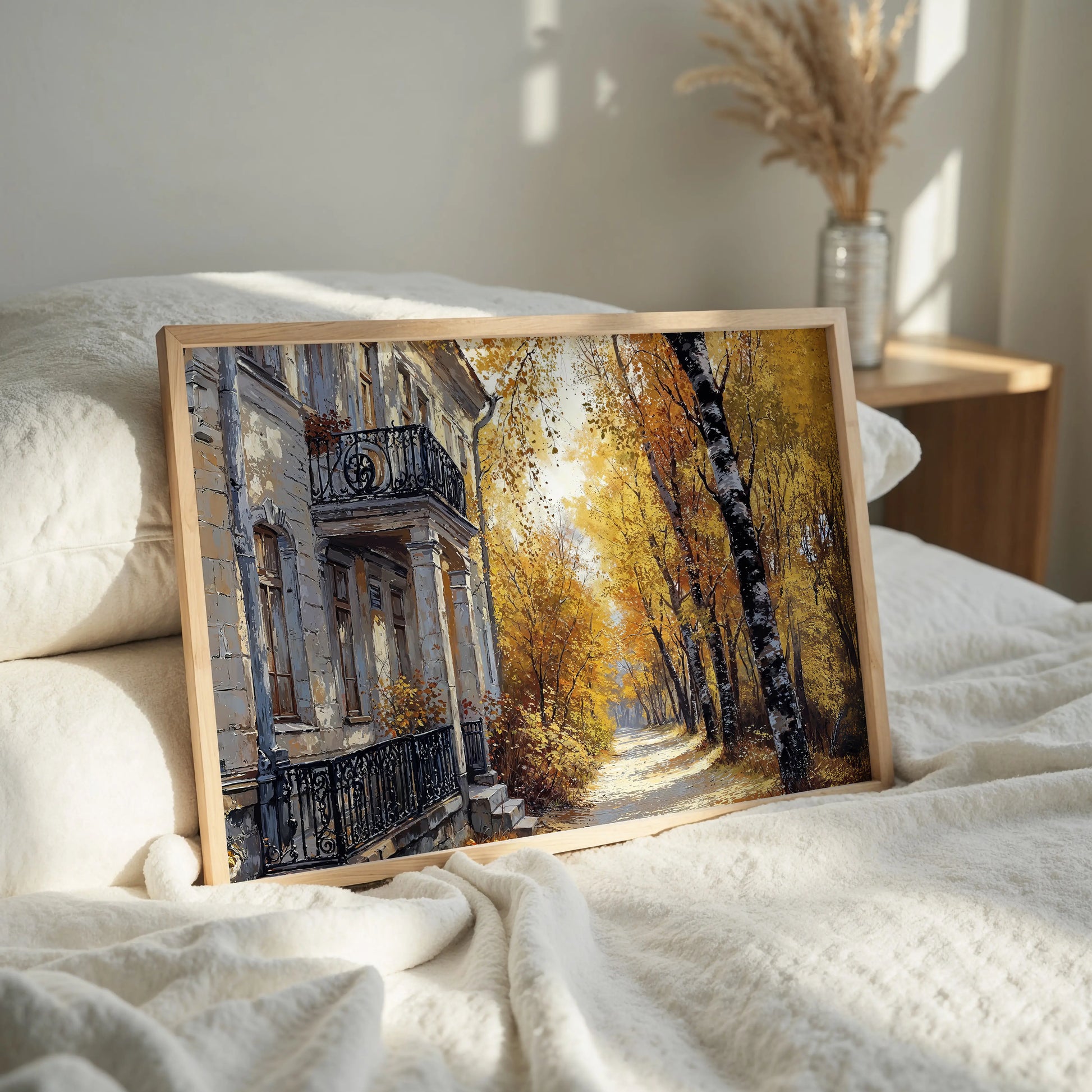 Balcony invites you into a tranquil scene where a graceful vintage manor stands at the edge of a golden-leafed forest. The wrought-iron balconies and aged stone exterior contrast beautifully with the vibrant fall foliage and soft woodland path.