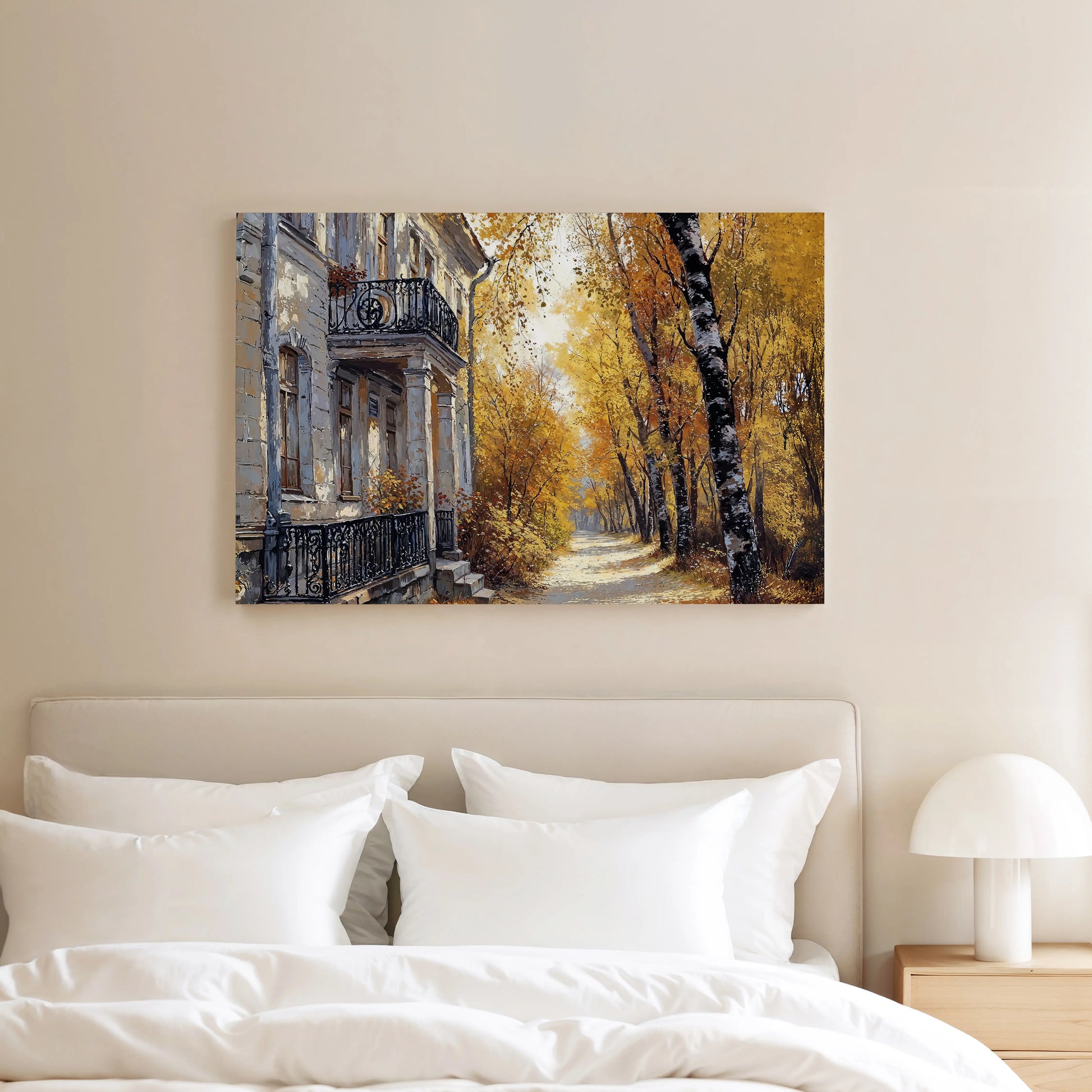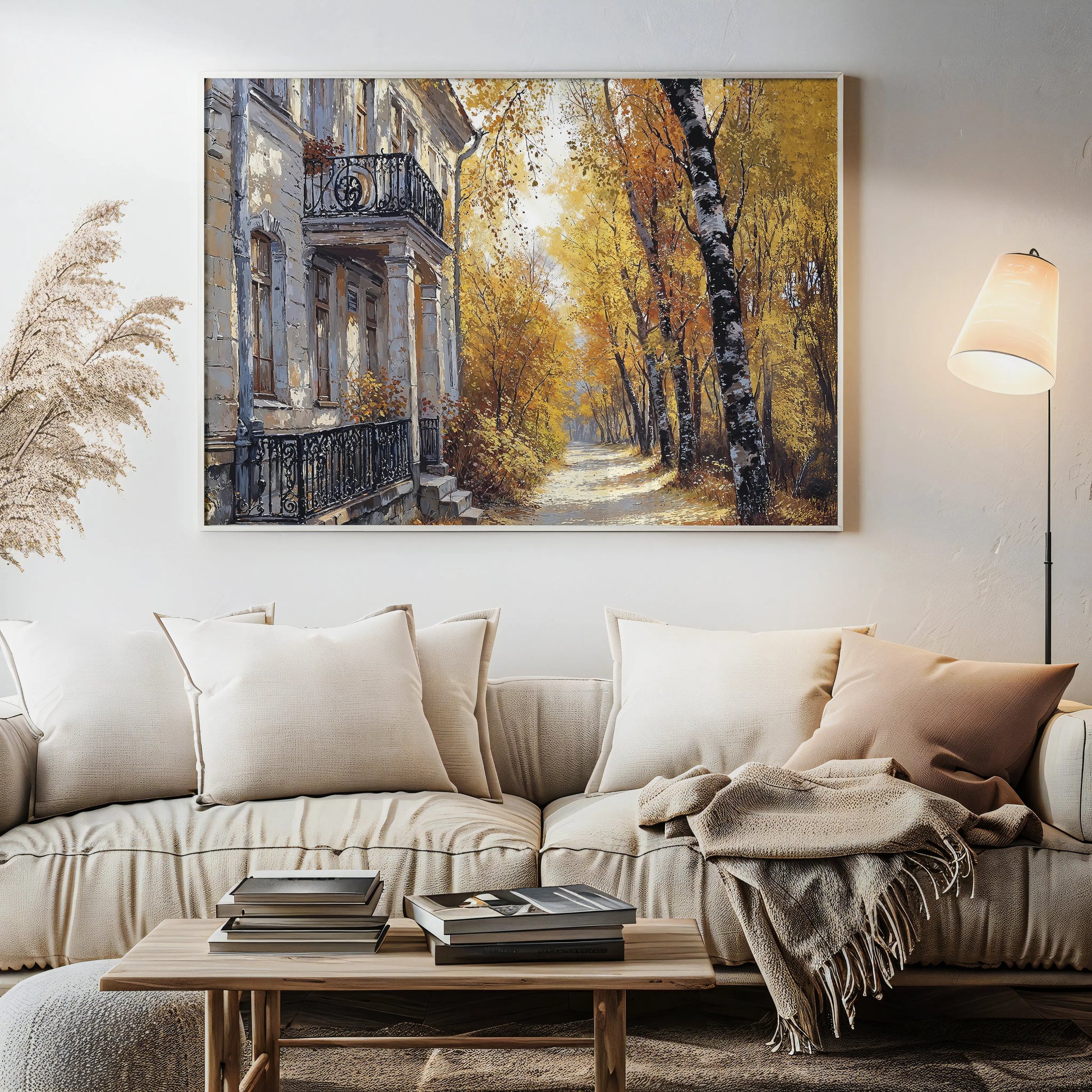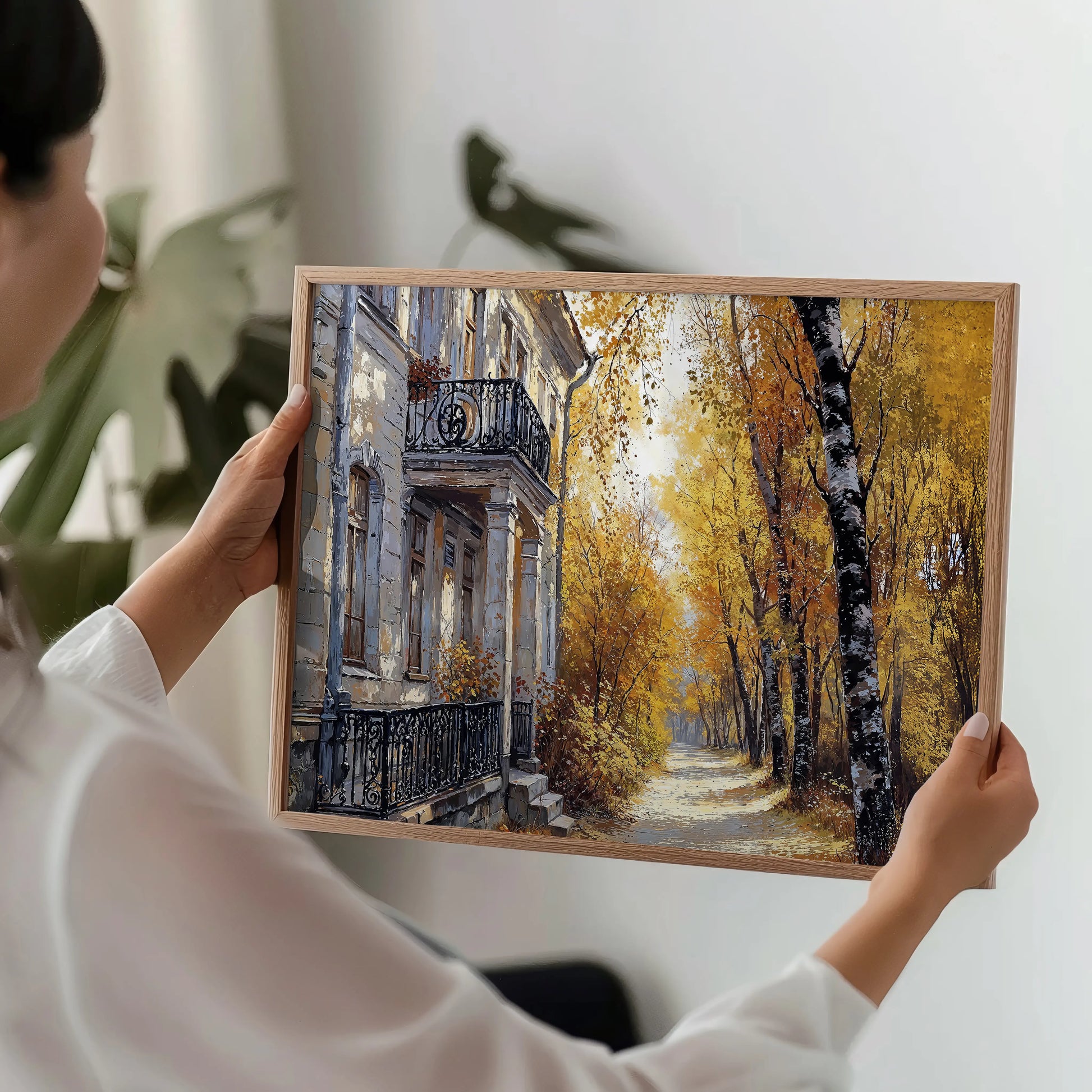 Balcony invites you into a tranquil scene where a graceful vintage manor stands at the edge of a golden-leafed forest. The wrought-iron balconies and aged stone exterior contrast beautifully with the vibrant fall foliage and soft woodland path.