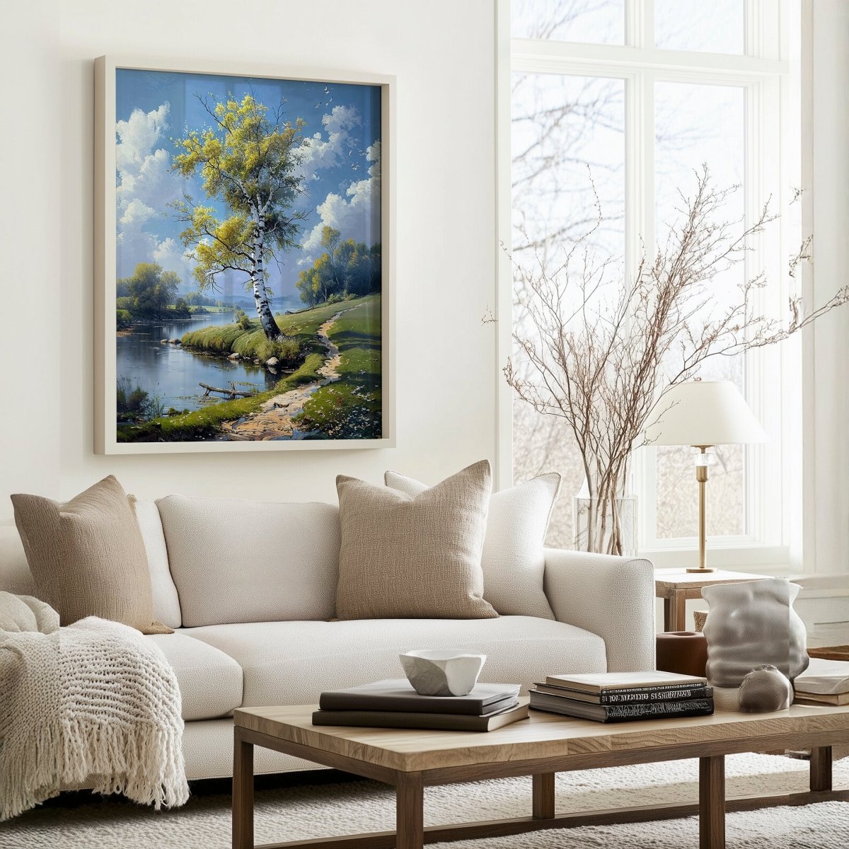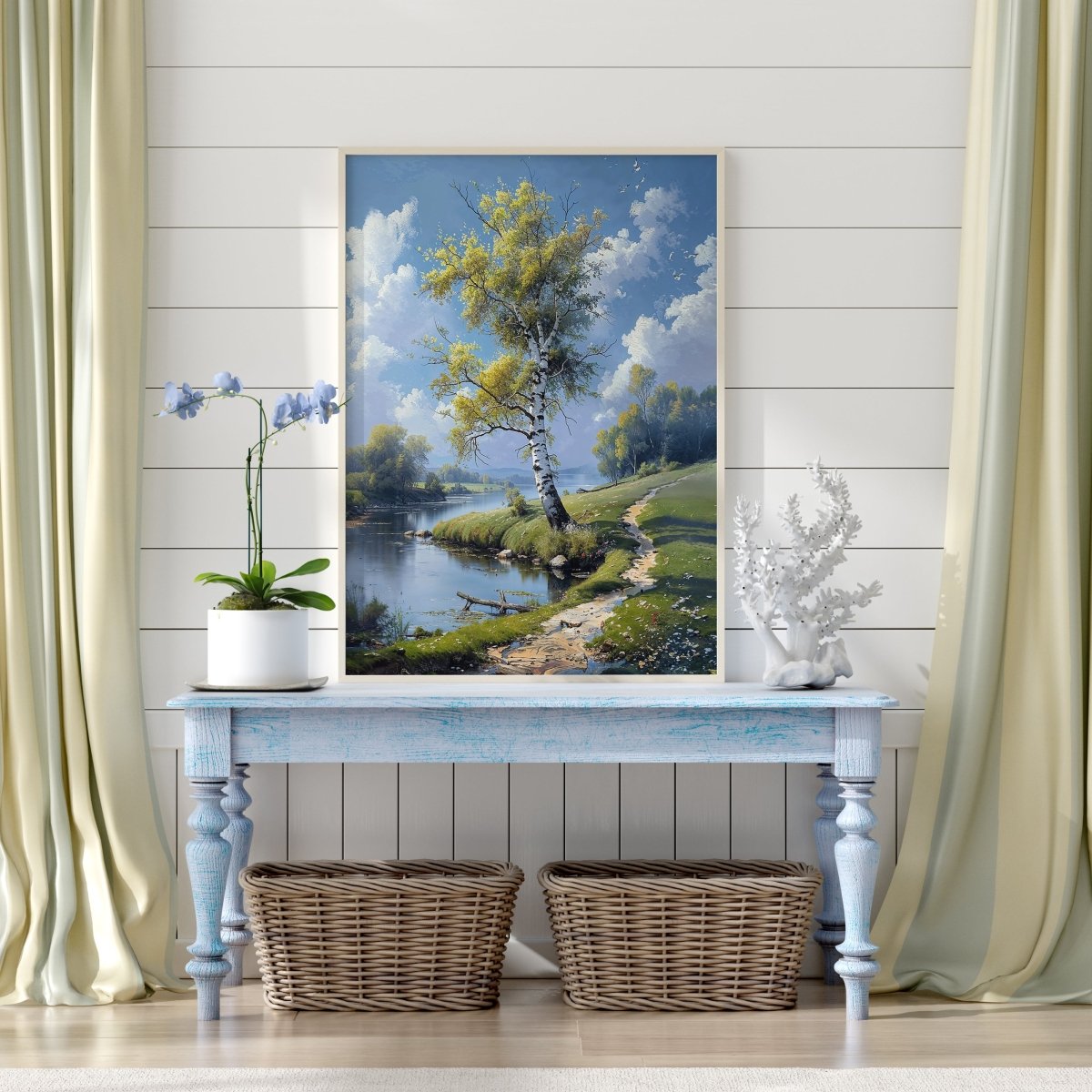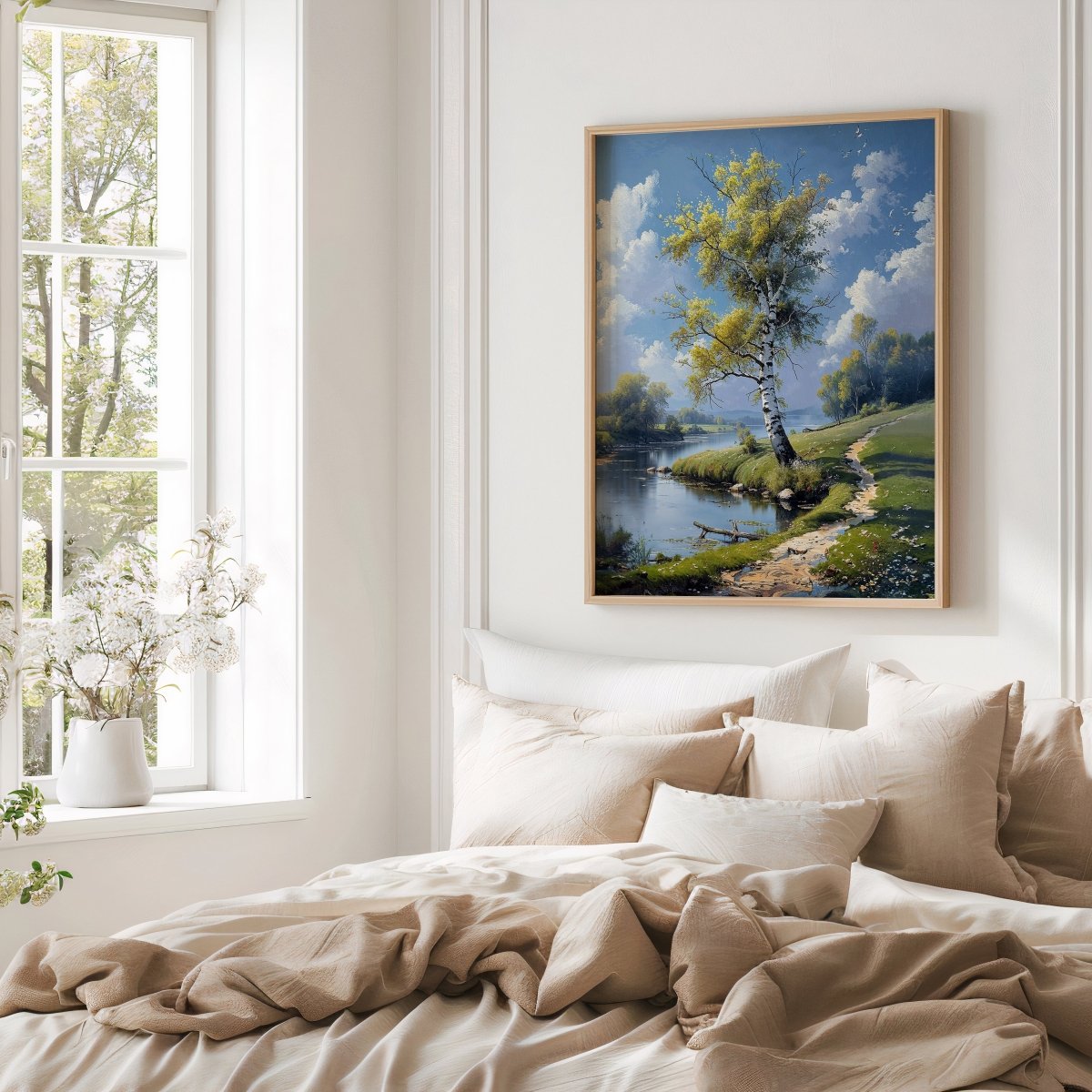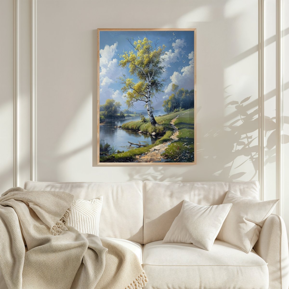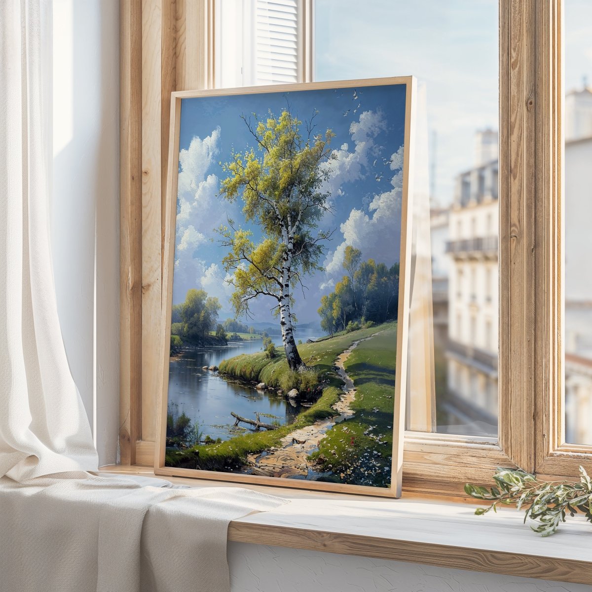 Riverbend invites stillness. A single birch, luminous against the calm, leans gracefully toward the mirrored water, its pale bark echoing the light scattered across the sky and stream. The landscape stretches gently into the distance, carrying breath and quiet along its meandering curve.