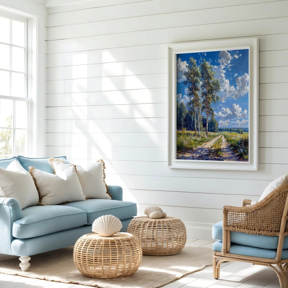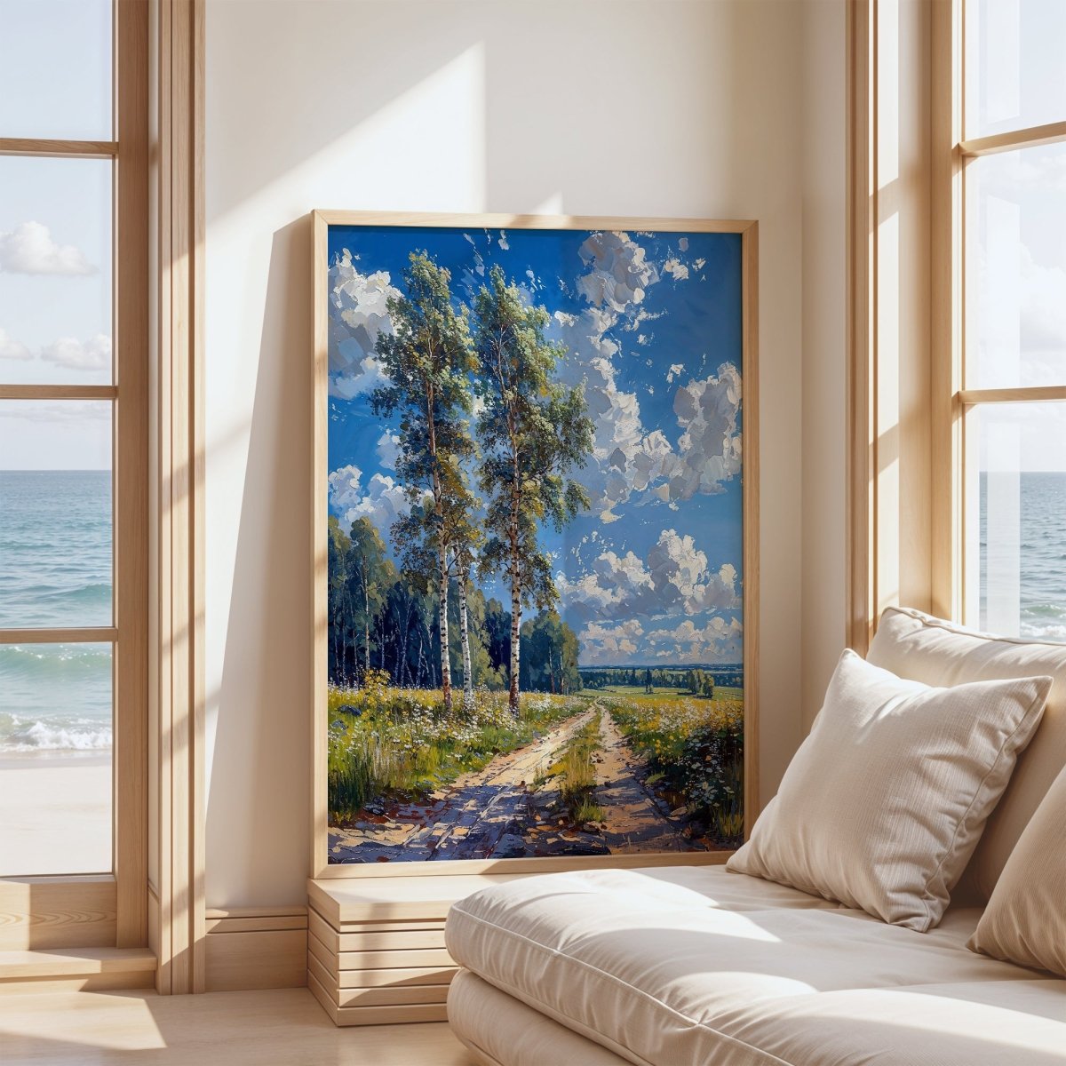 Touching the Sky invites movement through stillness—a winding path edged by wildflowers and birch trunks, illuminated by soft midday light. With each step suggested by broken brushwork and layered shadow, the landscape opens like breath: expansive, rhythmic, and unforced.
