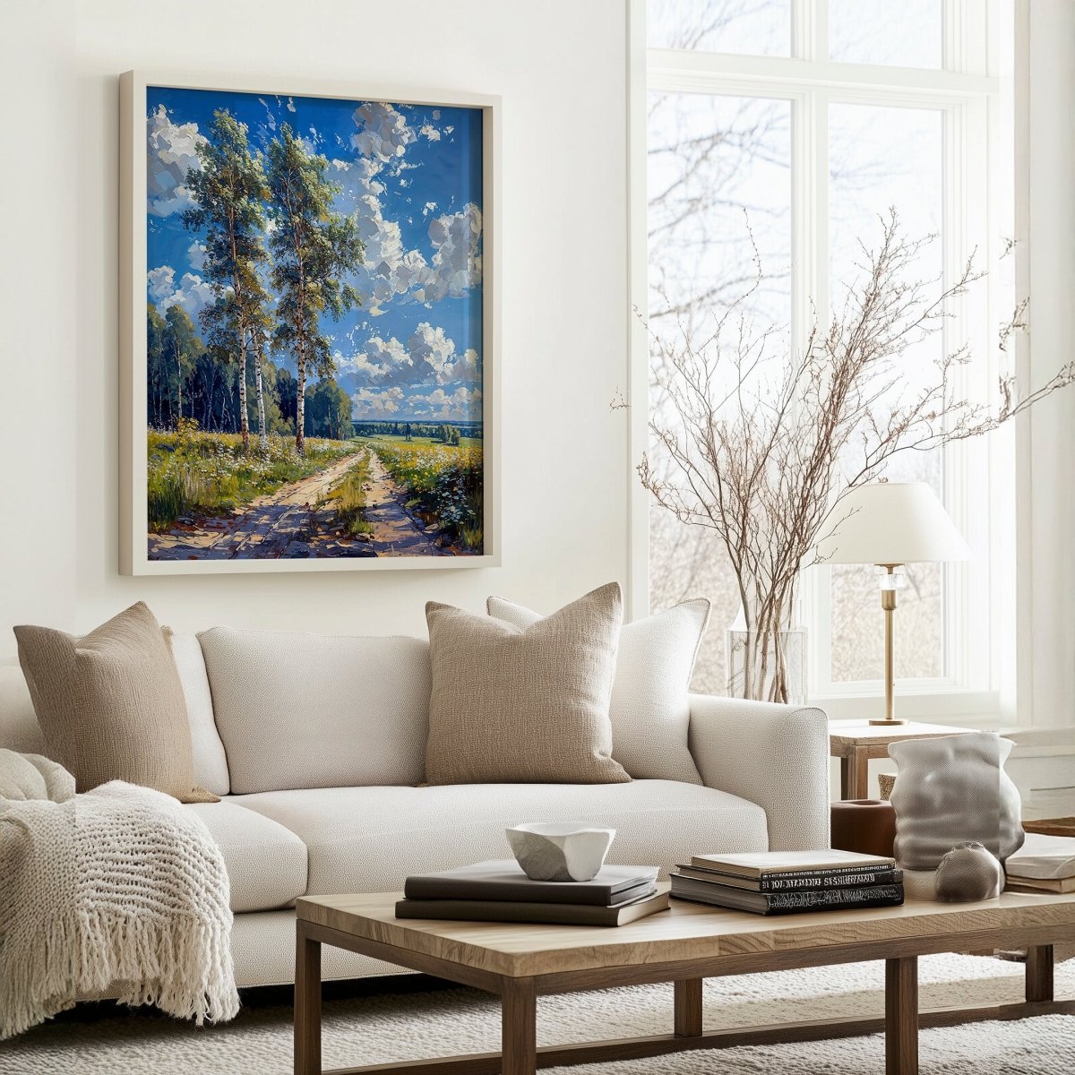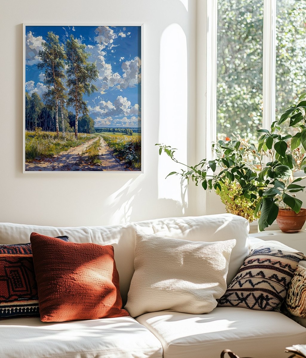 Ideal for modern farmhouse entryways, light-filled studios, or wellness spaces, the work offers more than path and meadow—it offers pause—a moment suspended between arrival and return.