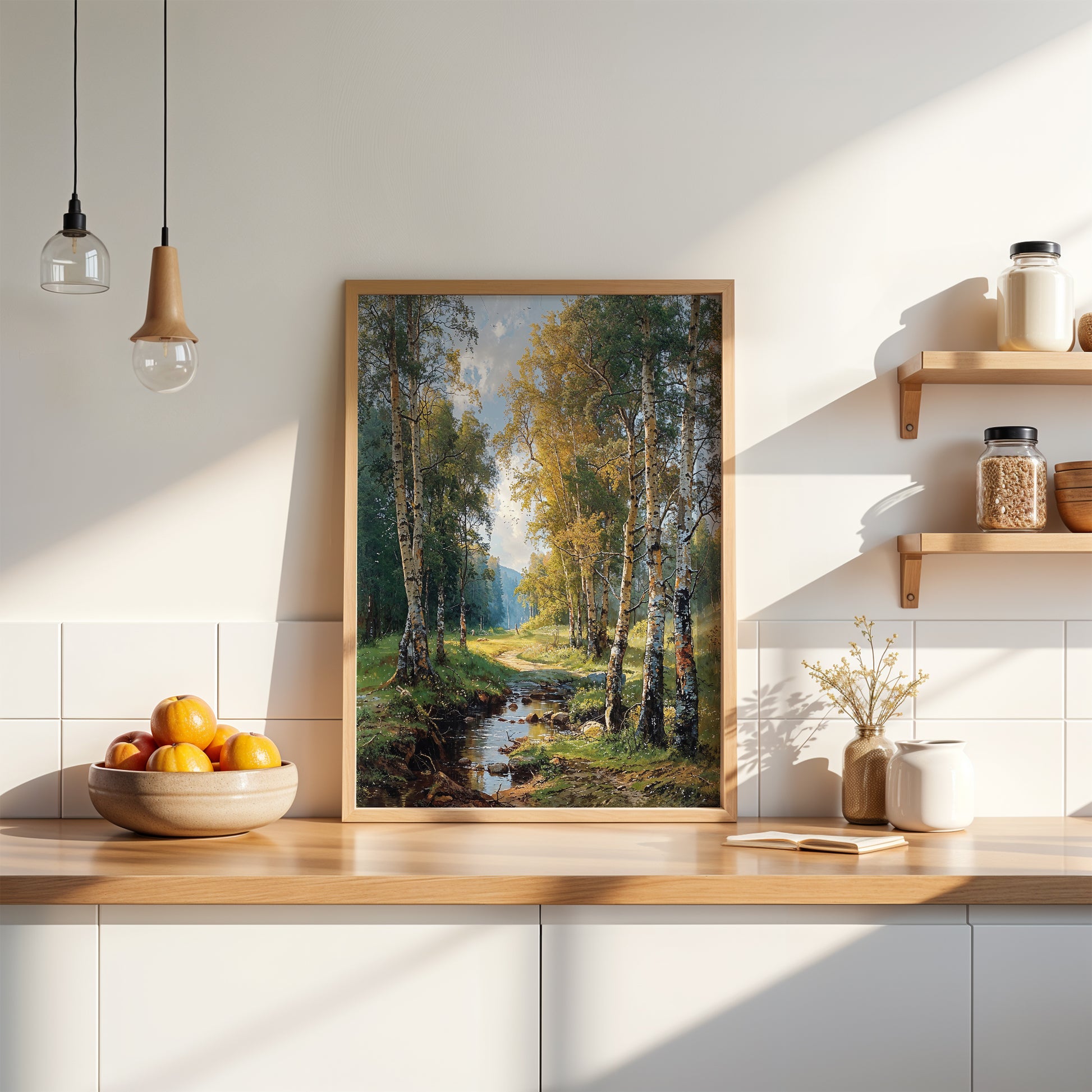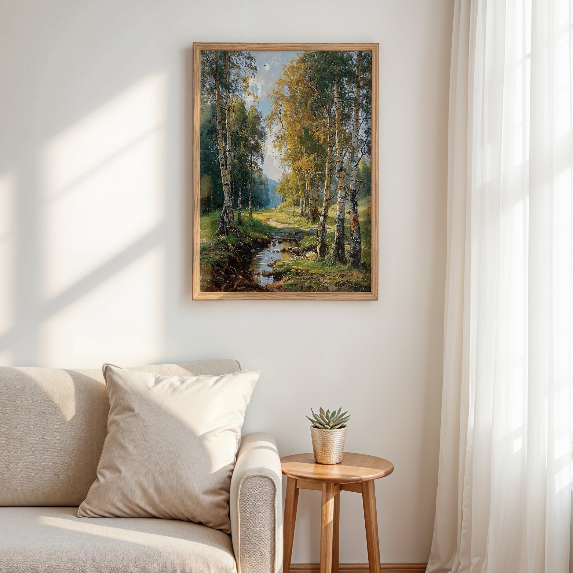 Birchlight Path breathes through sunlit forest where silver trunks rise in quiet cadence and a stream bends softly through the meadow floor. Light touches everything—bark, water, moss—with the gentleness of memory. The trail ahead glows not with urgency, but with invitation.