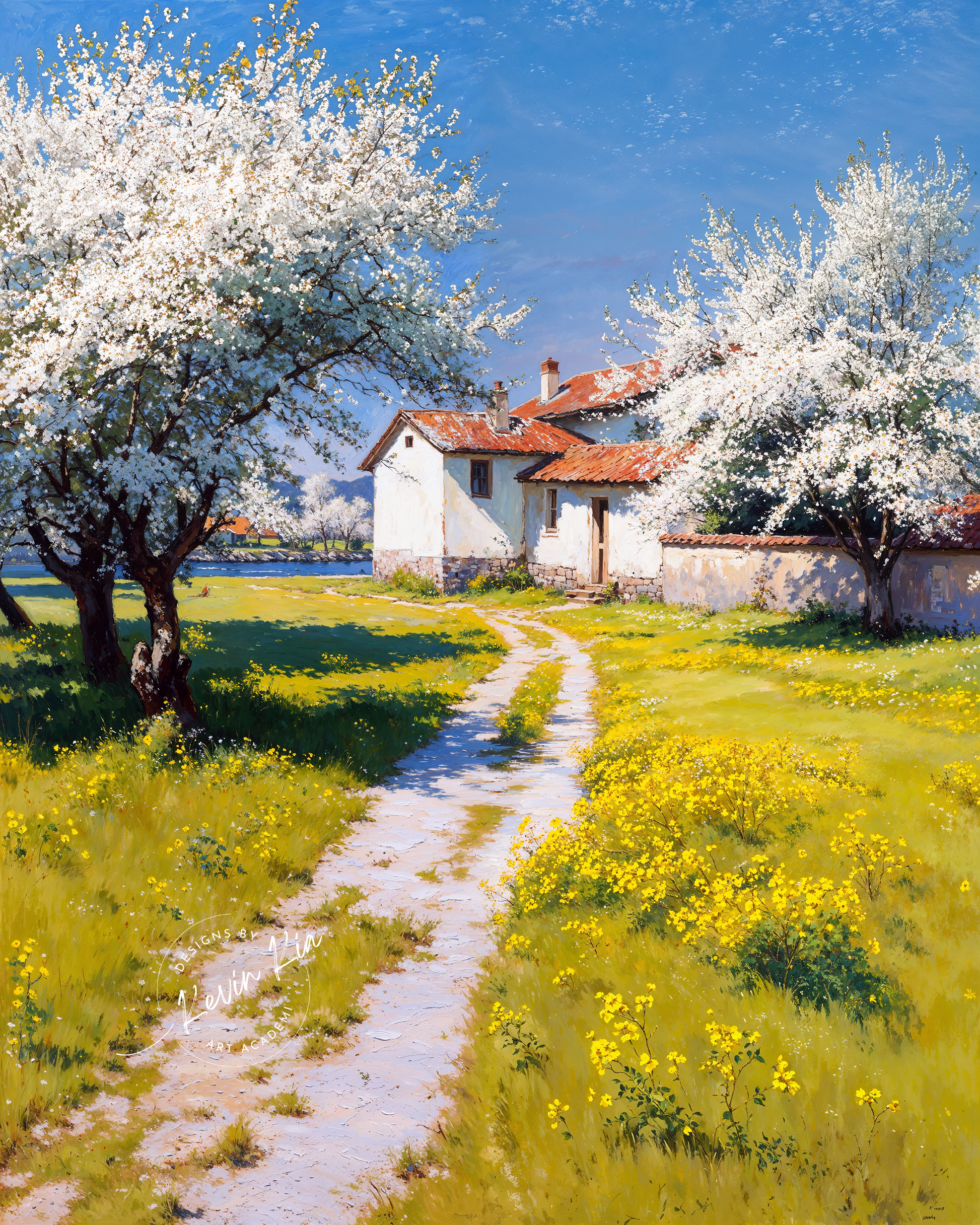 A winding path cuts through golden meadowlight, guiding the eye beneath canopies of white blossom toward a sun-warmed cottage framed in quiet bloom. Light glides across yellow wildflowers like memory surfacing—tender, vivid, unhurried. Each tree holds its breath of spring, rendered with a balance of vibrancy and restraint.