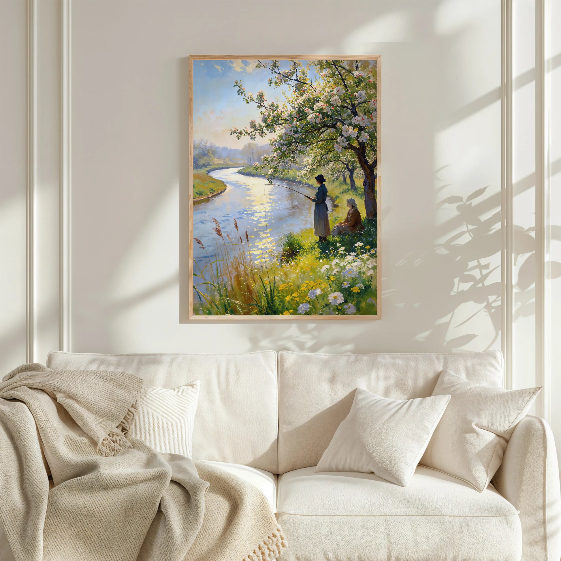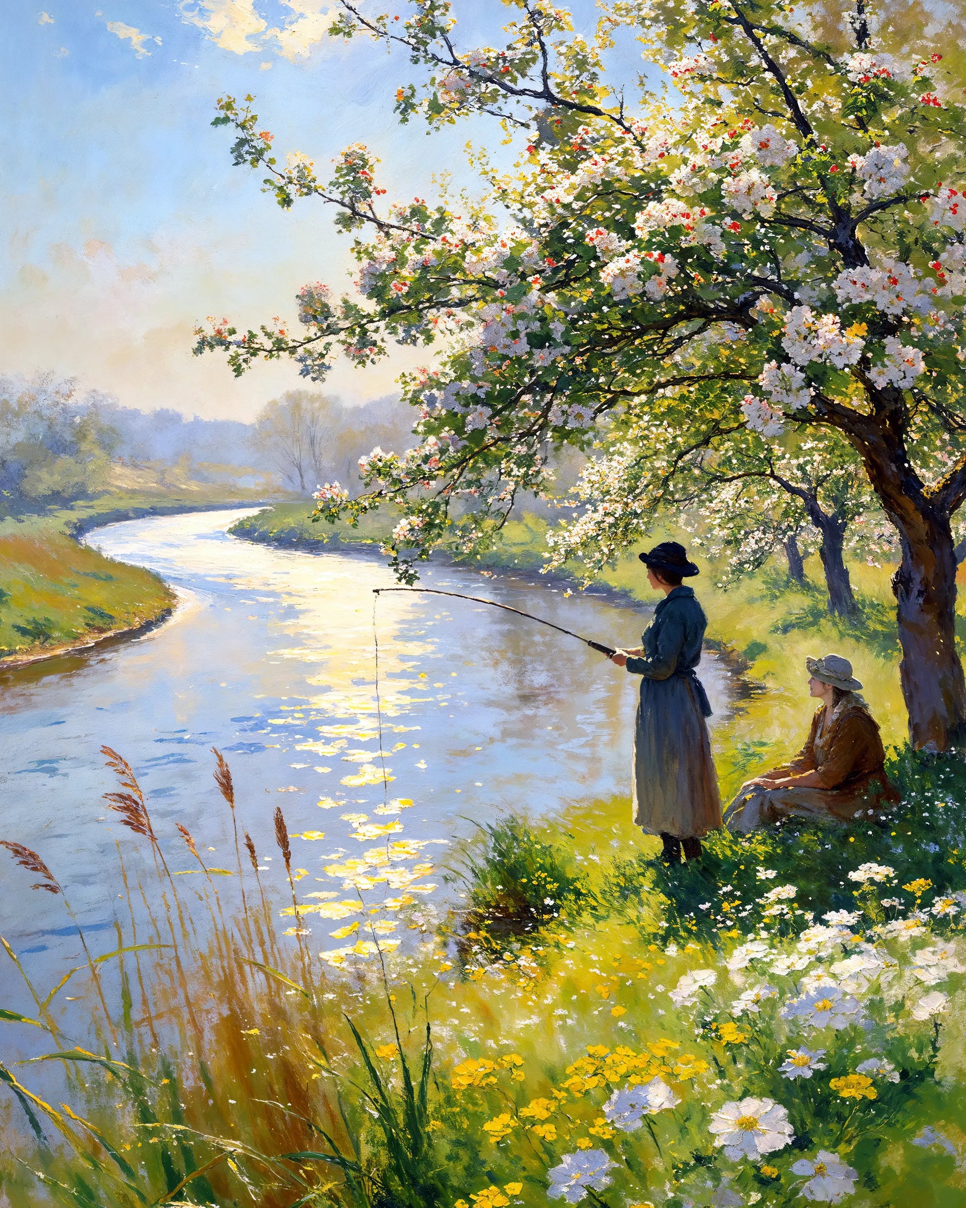 Along a gentle river bend, spring light moves across water as blossoms open overhead. White and pink flowers scatter through green branches, and the current carries soft reflections downstream. Grasses and wildflowers gather at the bank, while the air feels clear, slow, and touched by passing wind.