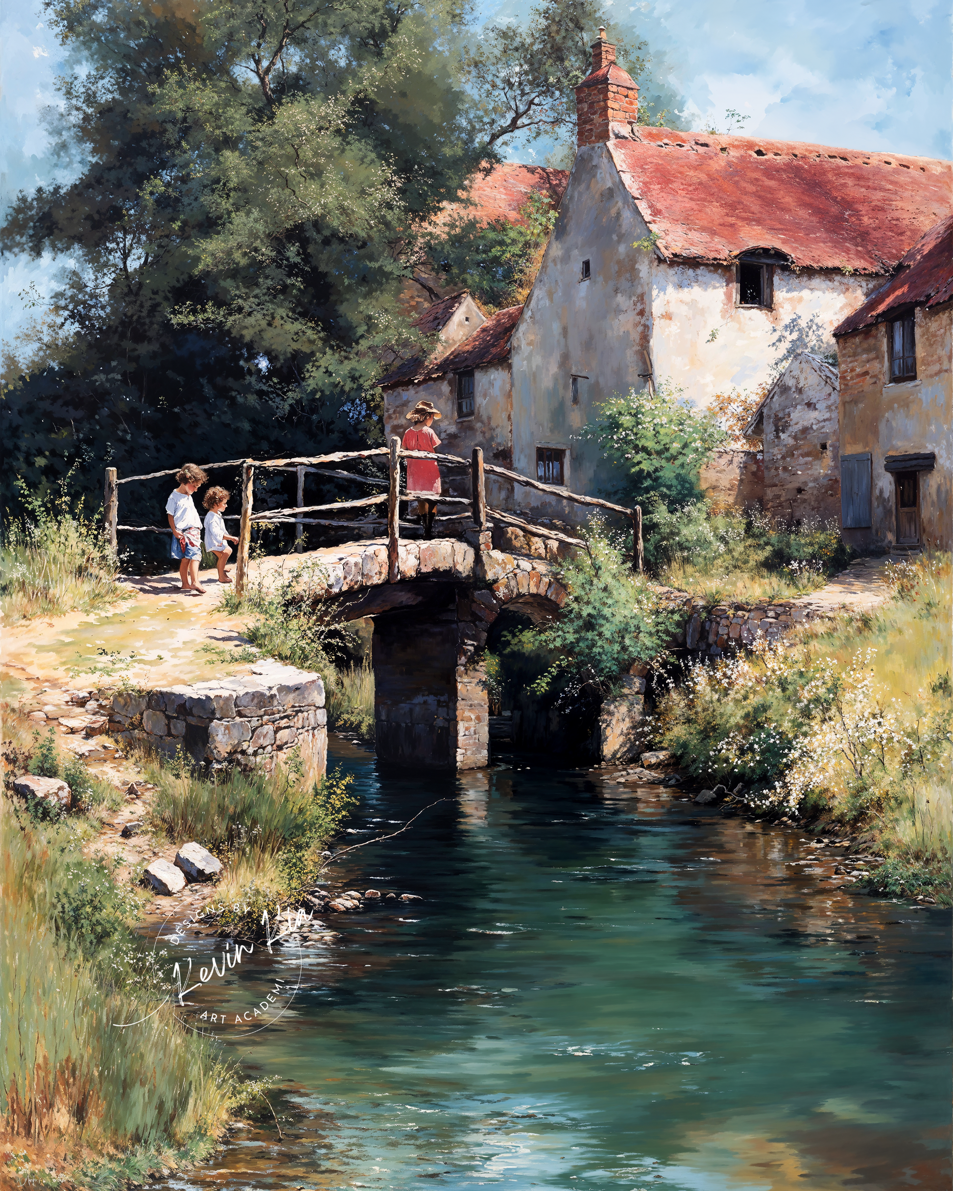 Bridge of Memories unfolds like a quiet memory, where sun-warmed stone and dappled foliage frame a timeless moment of childhood. The arching bridge draws the eye across a stream of stillness, as laughter and movement echo softly between old walls and waving grass. A red-roofed cottage leans into the shade, its textured facade glowing beneath the high blue sky.
