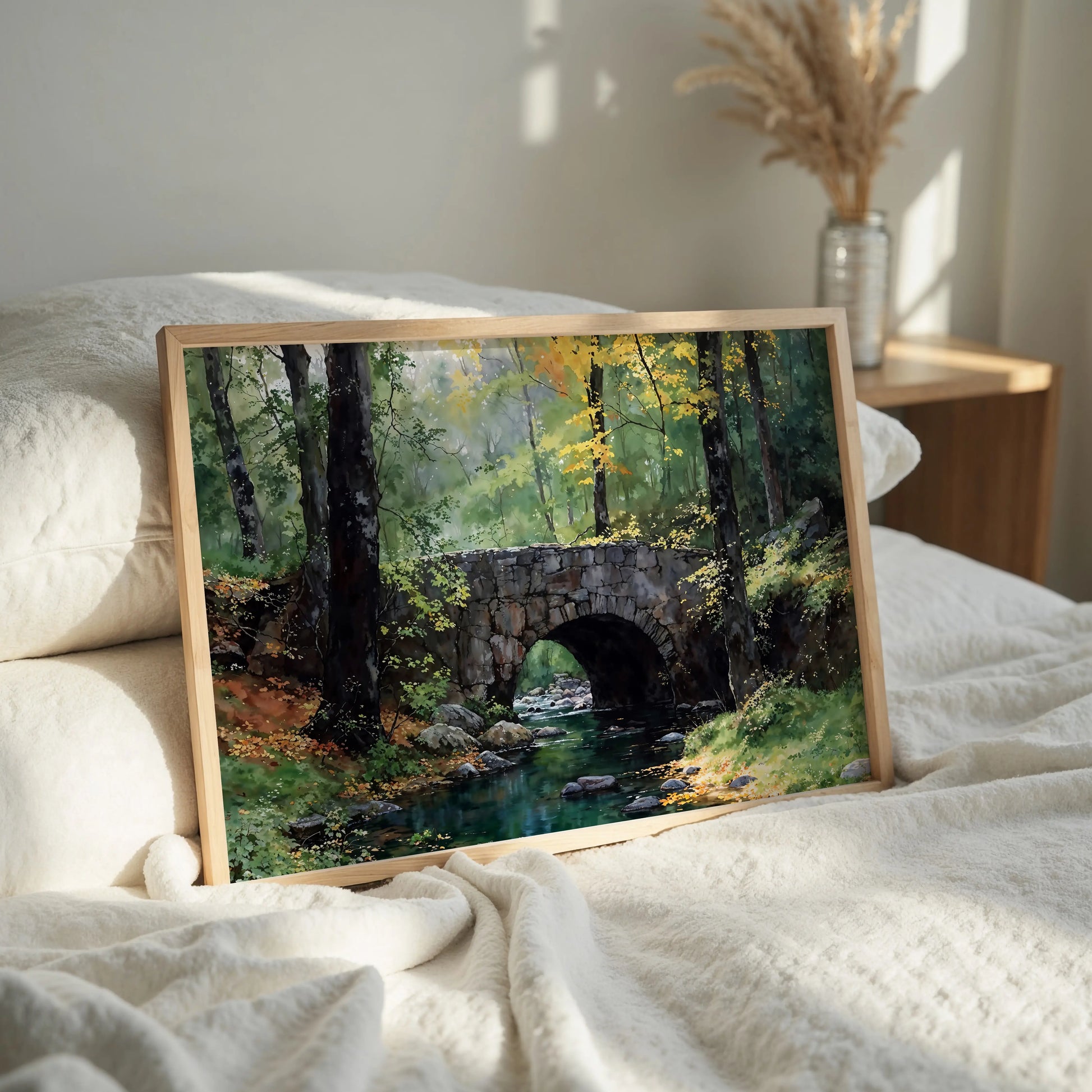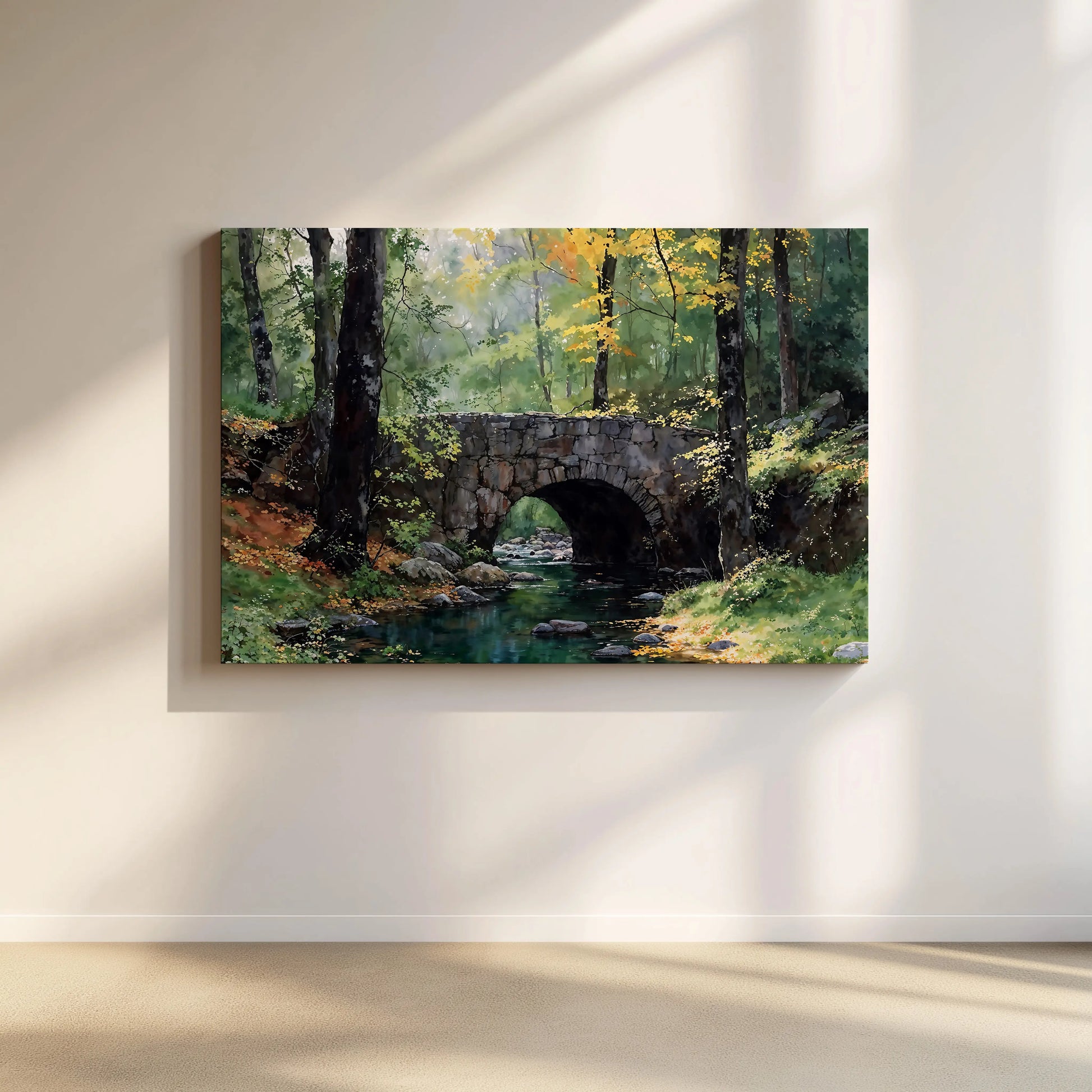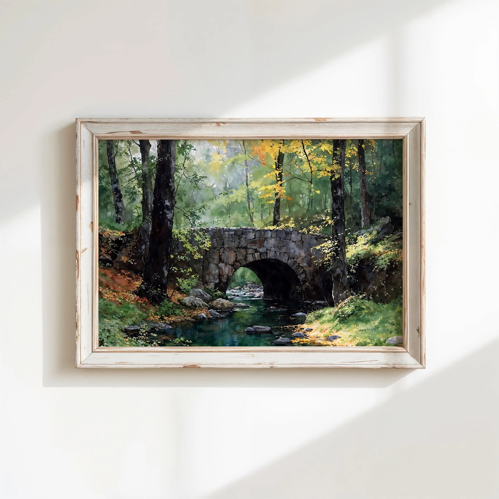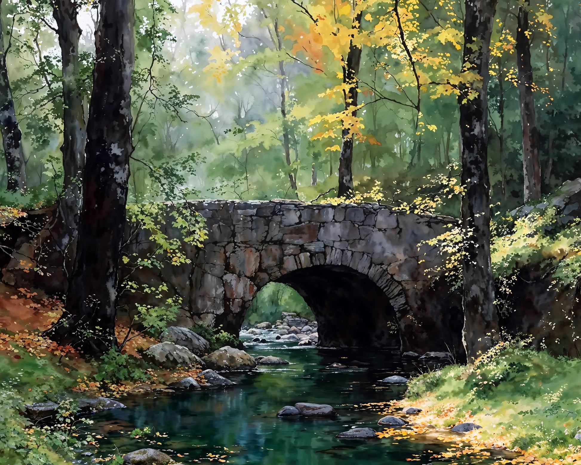 The Bridge on the River Kwai captures the serene charm of a quiet forest, where a rustic stone bridge spans a gentle, rocky stream. Sunlight filters softly through autumn leaves, creating a golden glow on the forest floor and water.