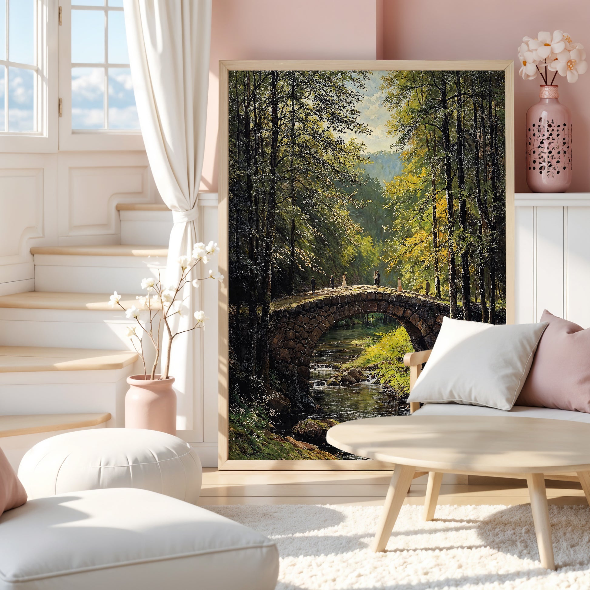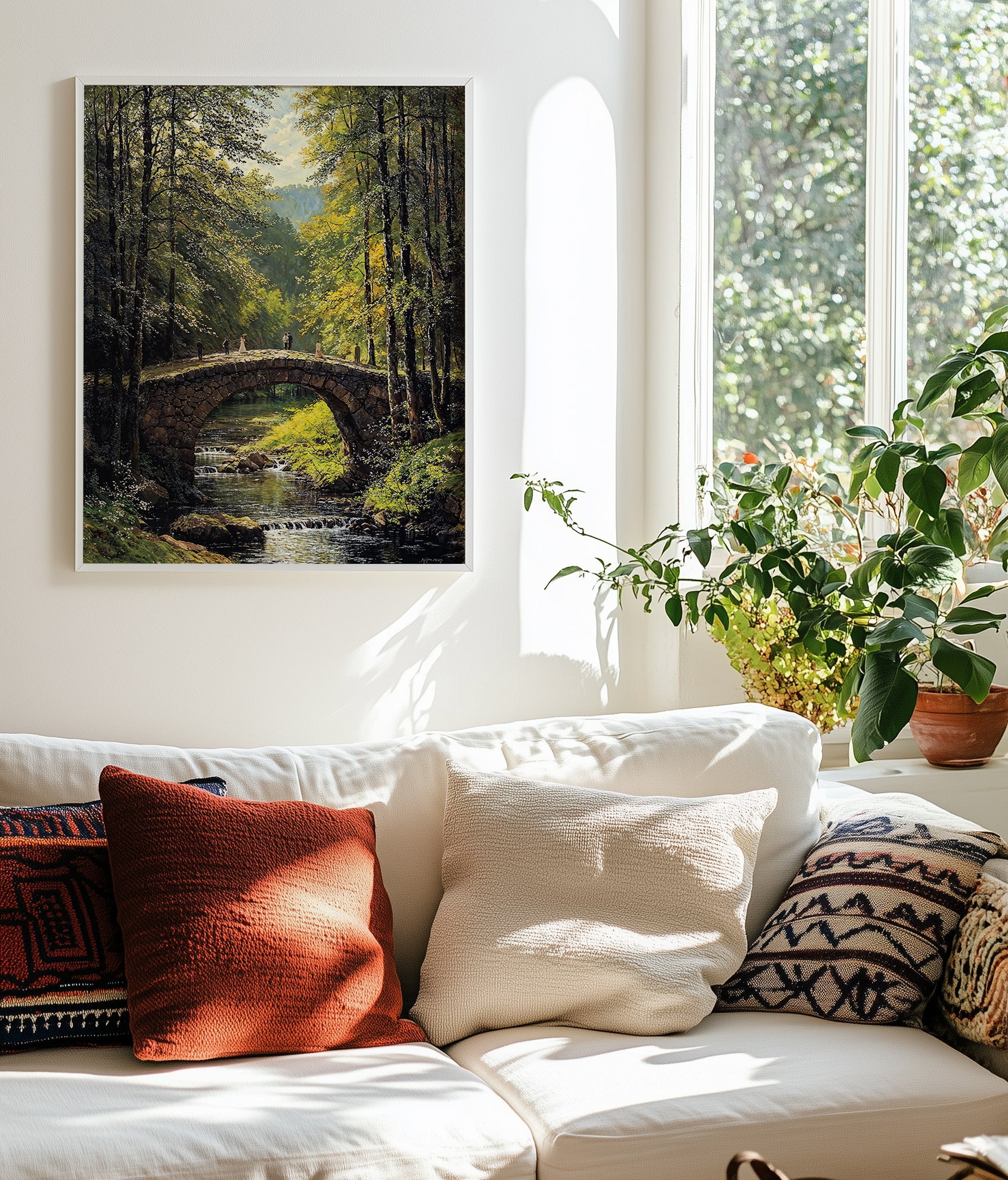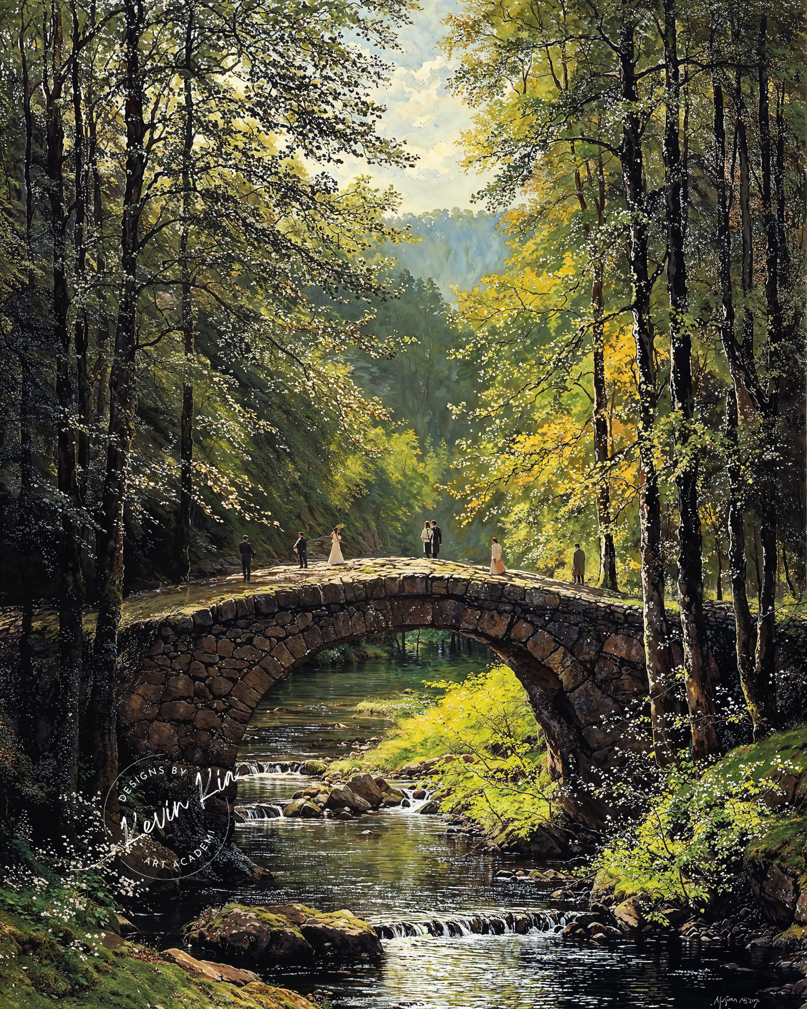 Bridge Stroll invites the viewer into a forest quietly alive with filtered gold. Figures drift across an ancient stone arch, their movements gentle and momentary, softened by time and shadow. The bridge holds not only weight, but memory—arching between light and reflection, leaf and silence.