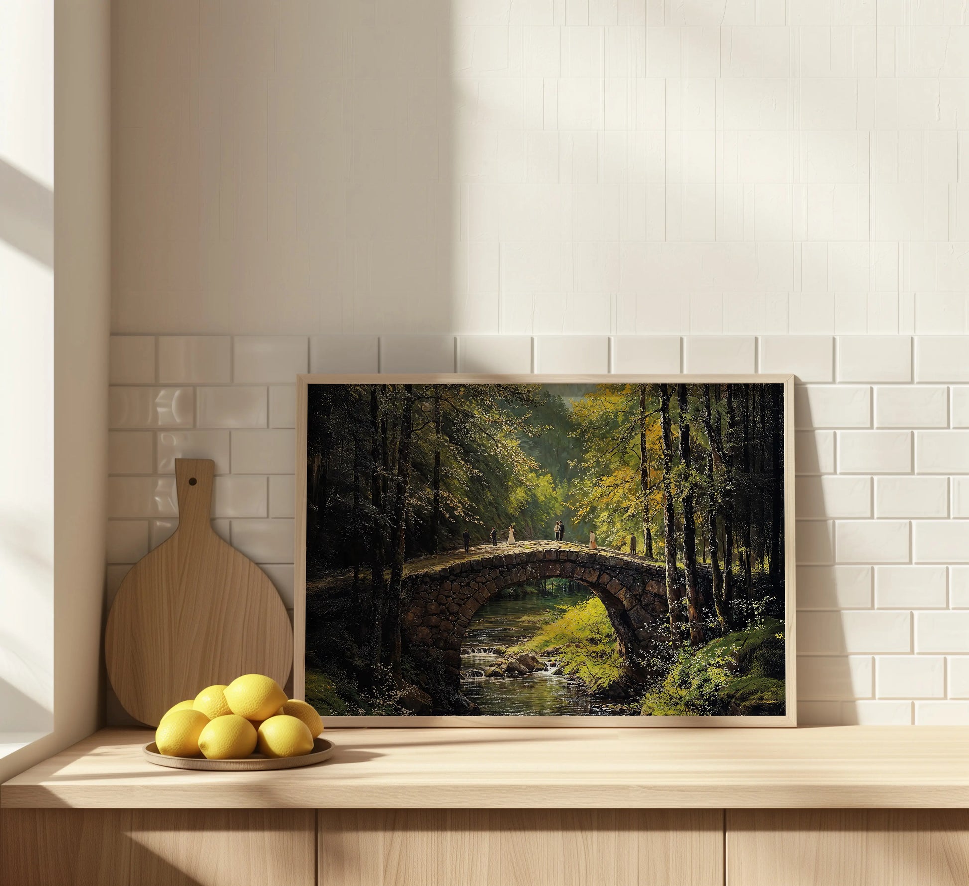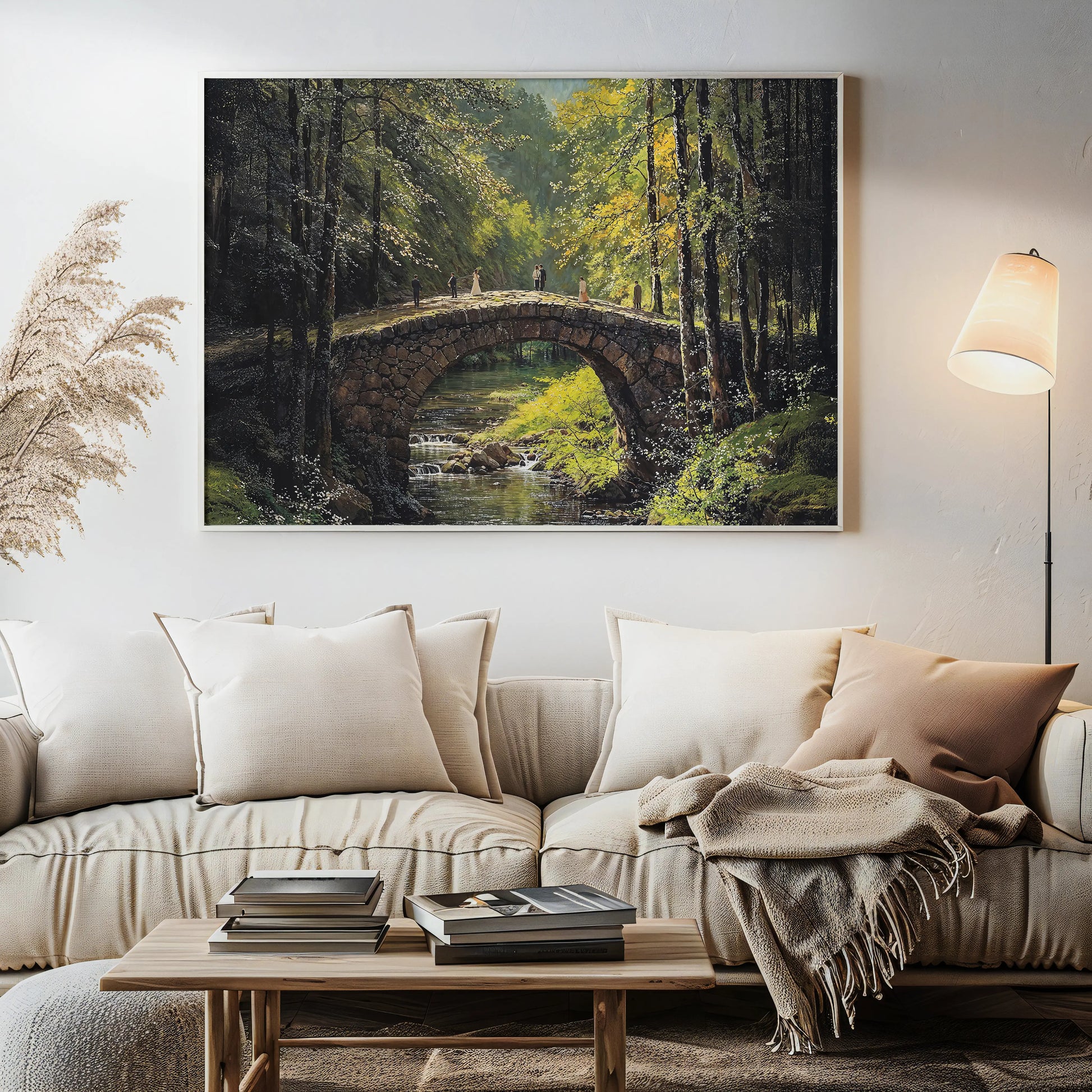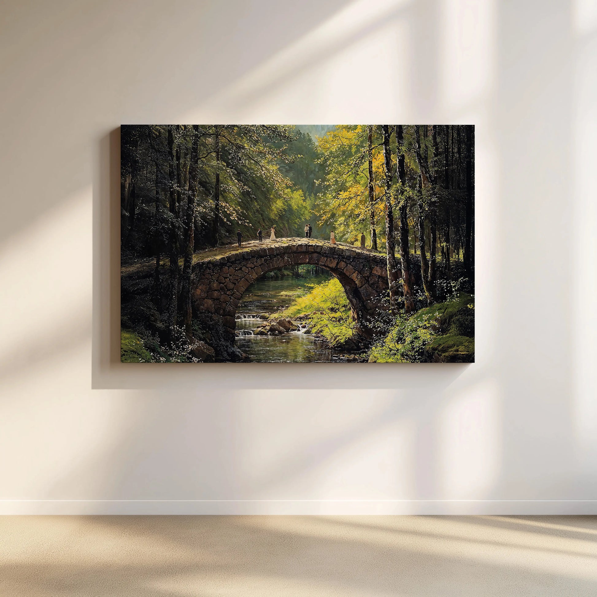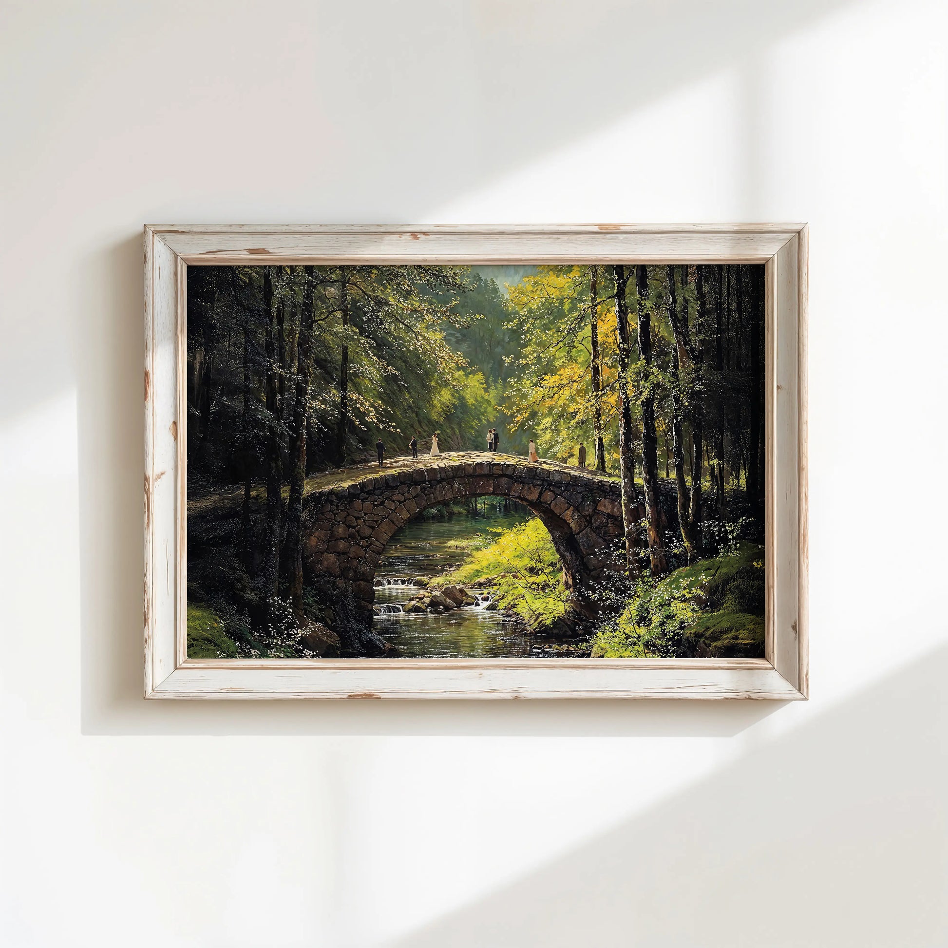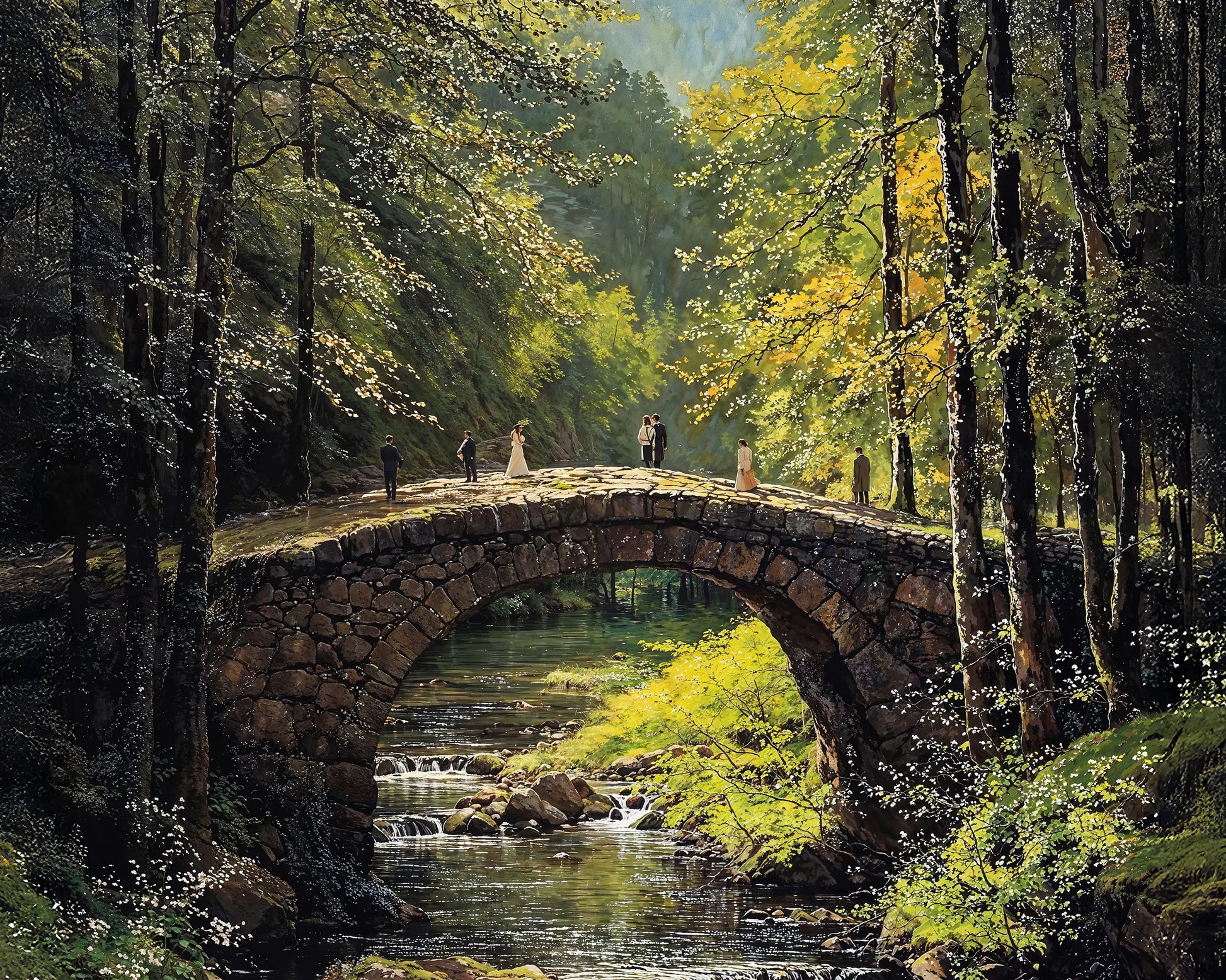 Bridge Stroll is a masterful depiction of love and nature in harmony. A rustic stone bridge arches gracefully over a gentle forest stream, dappled in golden sunlight. Several figures, including a wedding couple, add warmth and storytelling to the serene woodland setting.