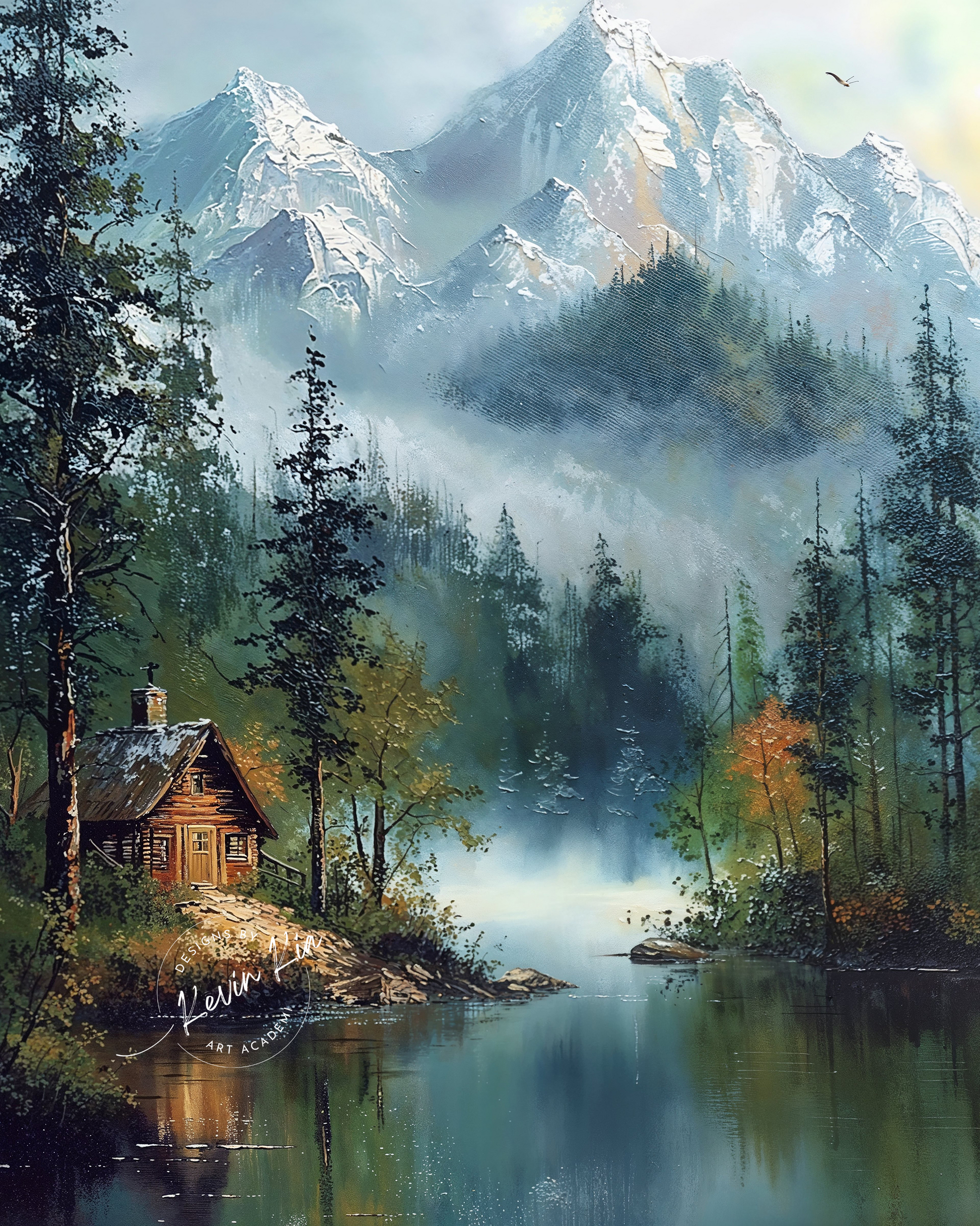 Soft breath of dawn lingers across a mirror-still lake as mist rises through fir and alder. A lone cabin, weathered and inviting, anchors the shoreline—its presence subtle, its silence deep. Cabin in the Mists holds that rare, sacred stillness when nature hushes even thought.