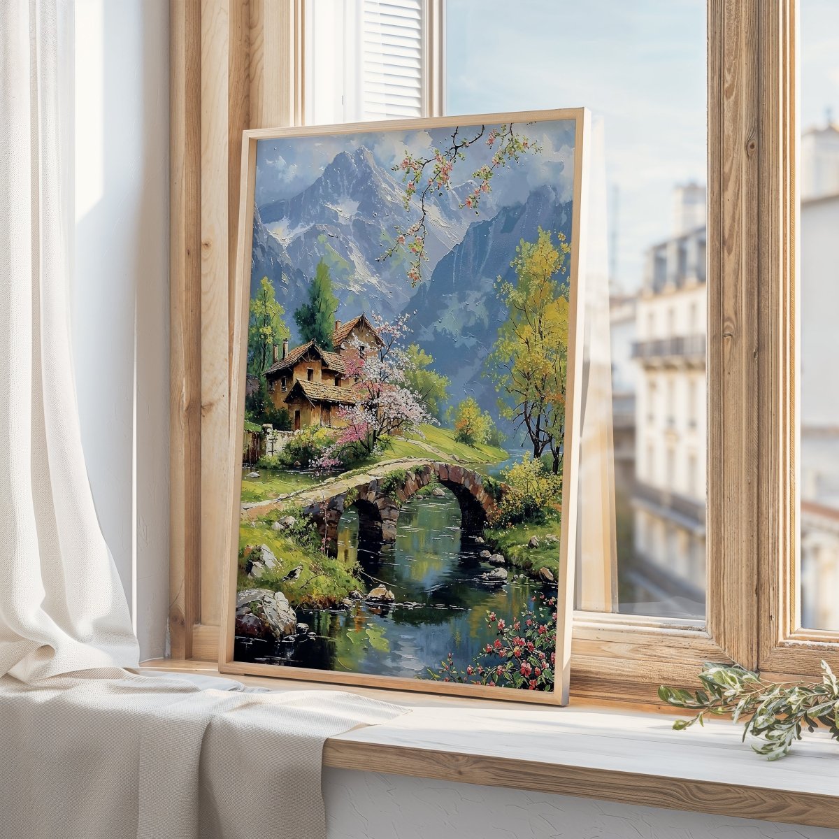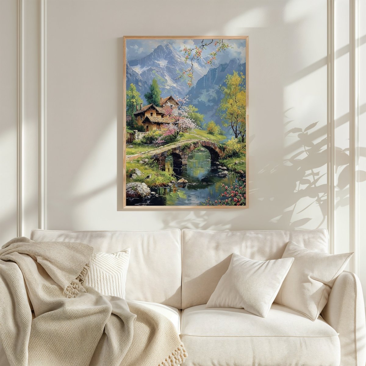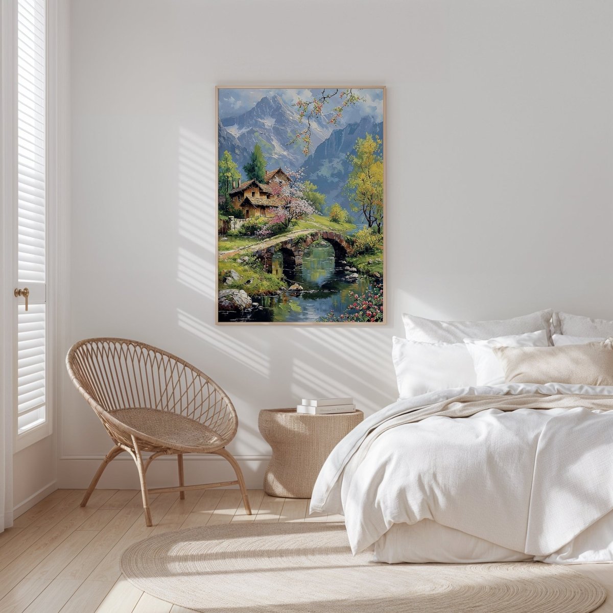 In Bridge & Blossoms, petals scatter like memory across an alpine bridge, where spring’s color finds harmony with stone, sky, and snow-dusted rise. Nestled cottages lean into cherry blossom shade, their rooftops quietly warmed by the soft, diffused light of awakening seasons. Mountain silhouettes frame the scene like guardians—majestic, but never imposing.