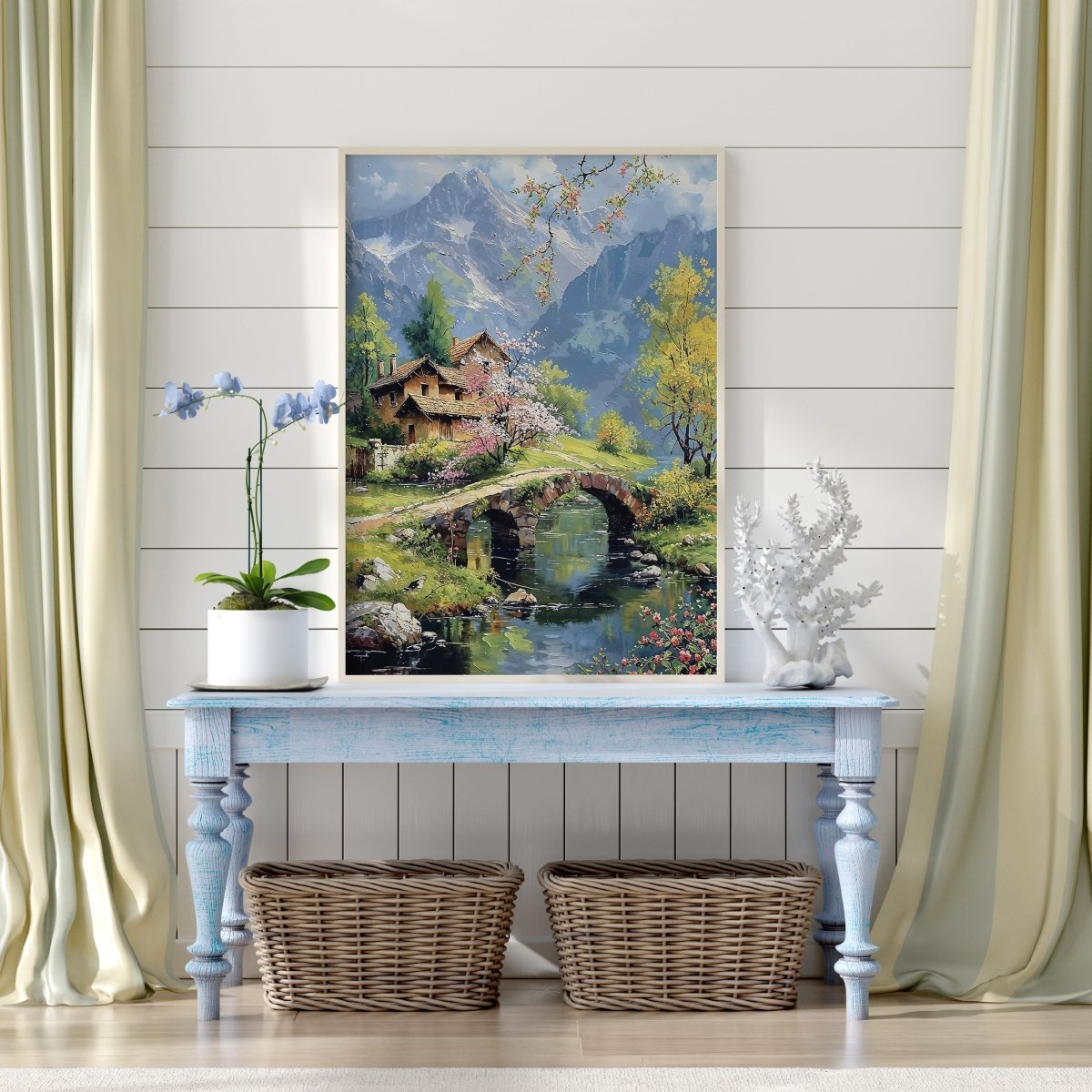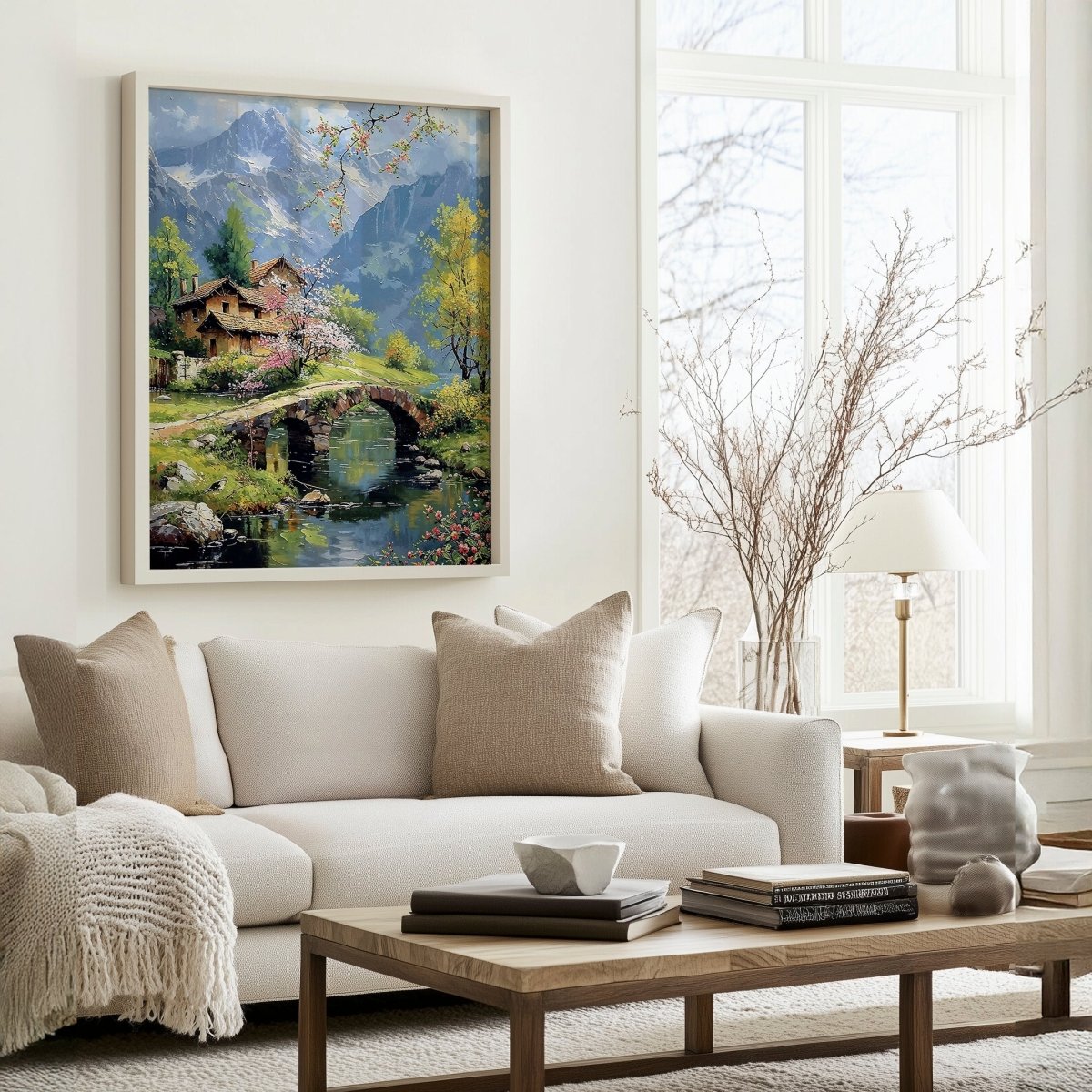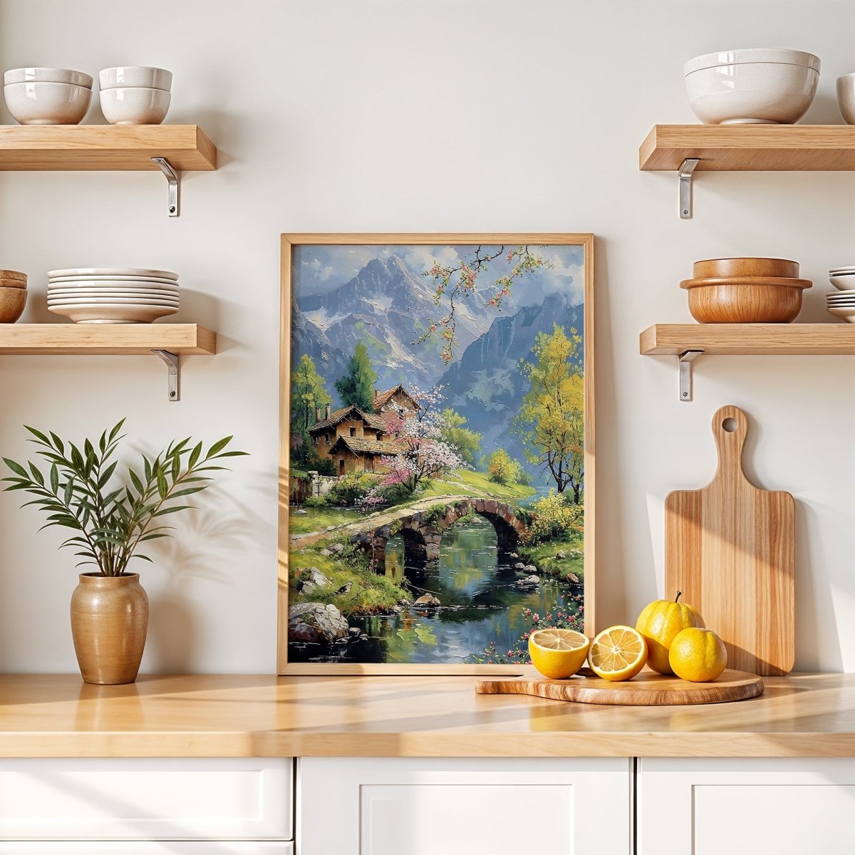 In Bridge & Blossoms, petals scatter like memory across an alpine bridge, where spring’s color finds harmony with stone, sky, and snow-dusted rise. Nestled cottages lean into cherry blossom shade, their rooftops quietly warmed by the soft, diffused light of awakening seasons. Mountain silhouettes frame the scene like guardians—majestic, but never imposing.