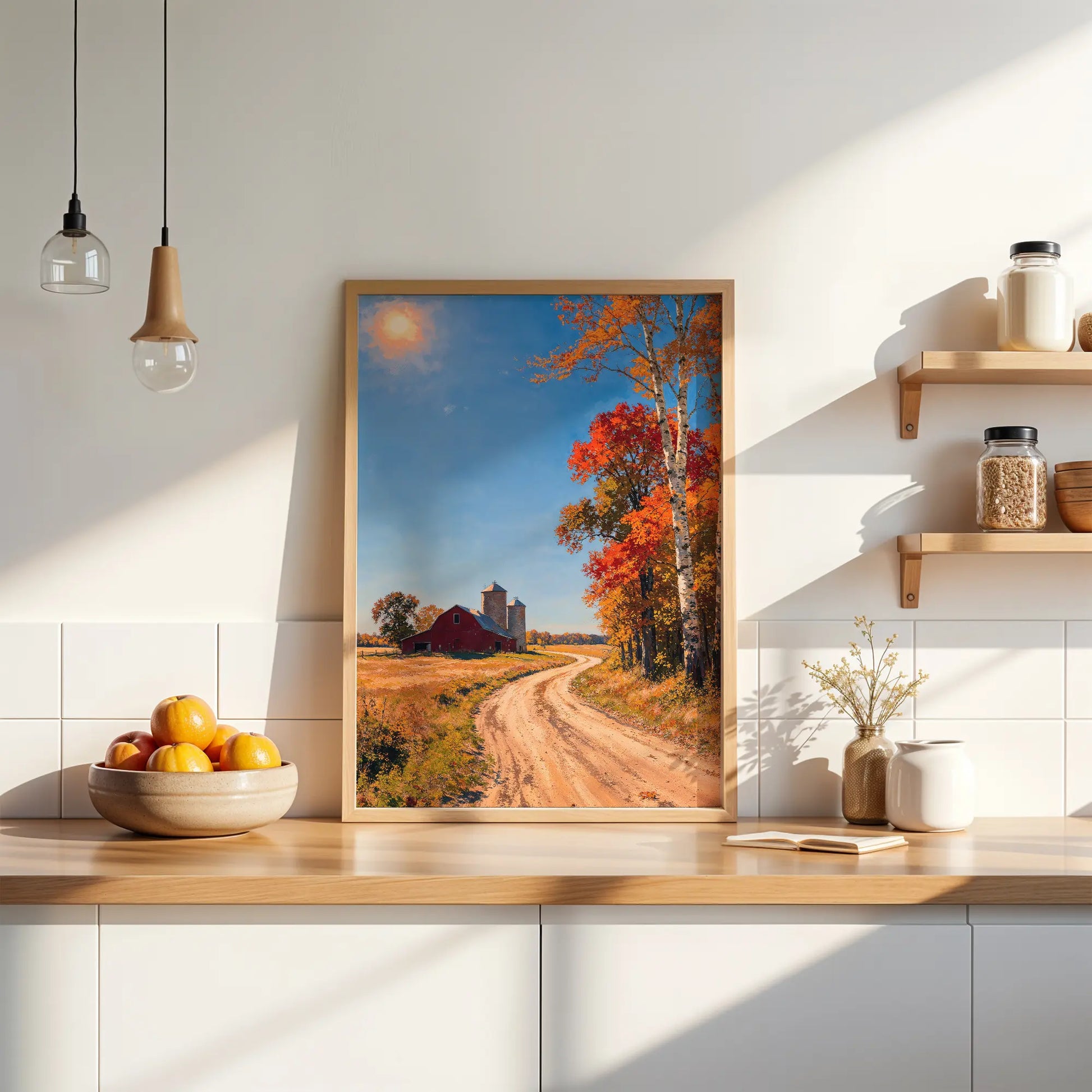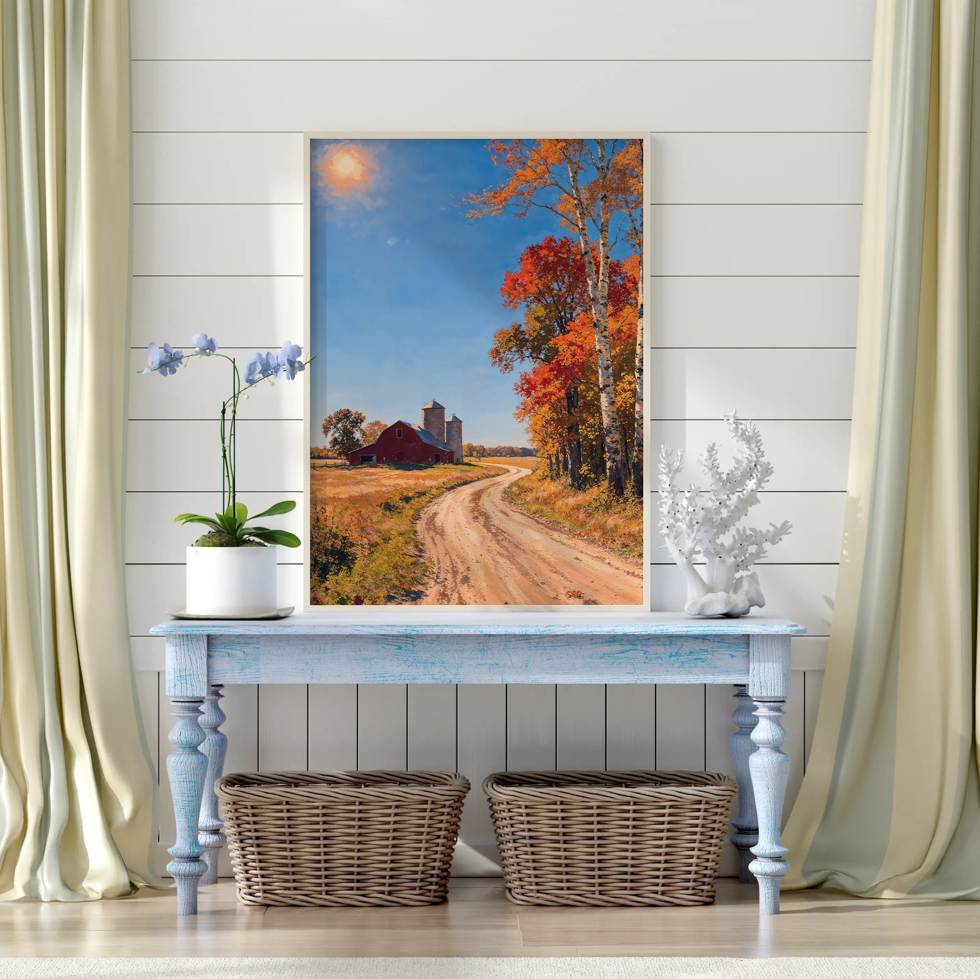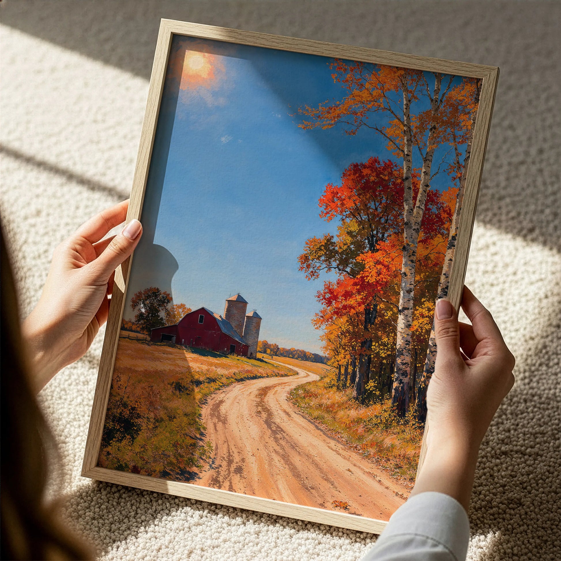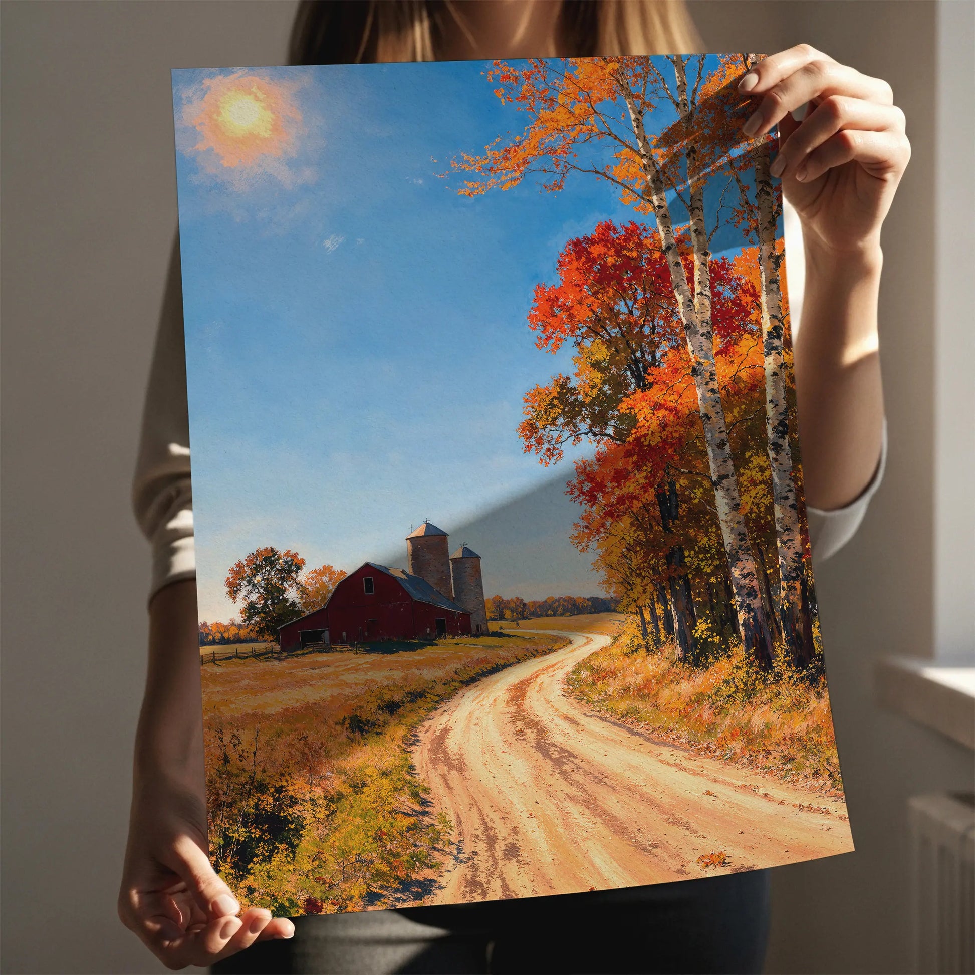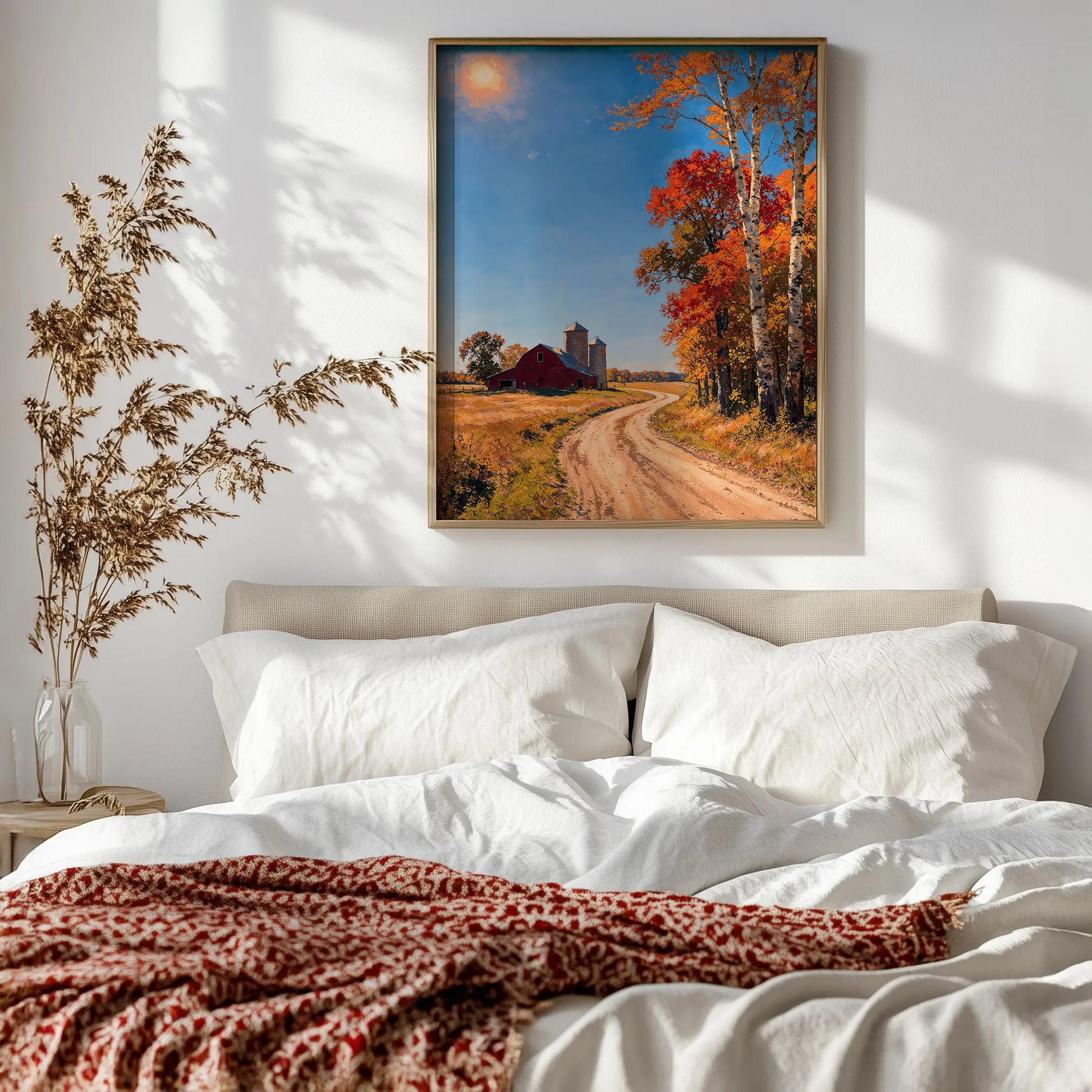 Copper Hill unfolds in a cascade of amber and gold, where a winding dirt road leads past a red barn nestled at the edge of fiery birch trees.