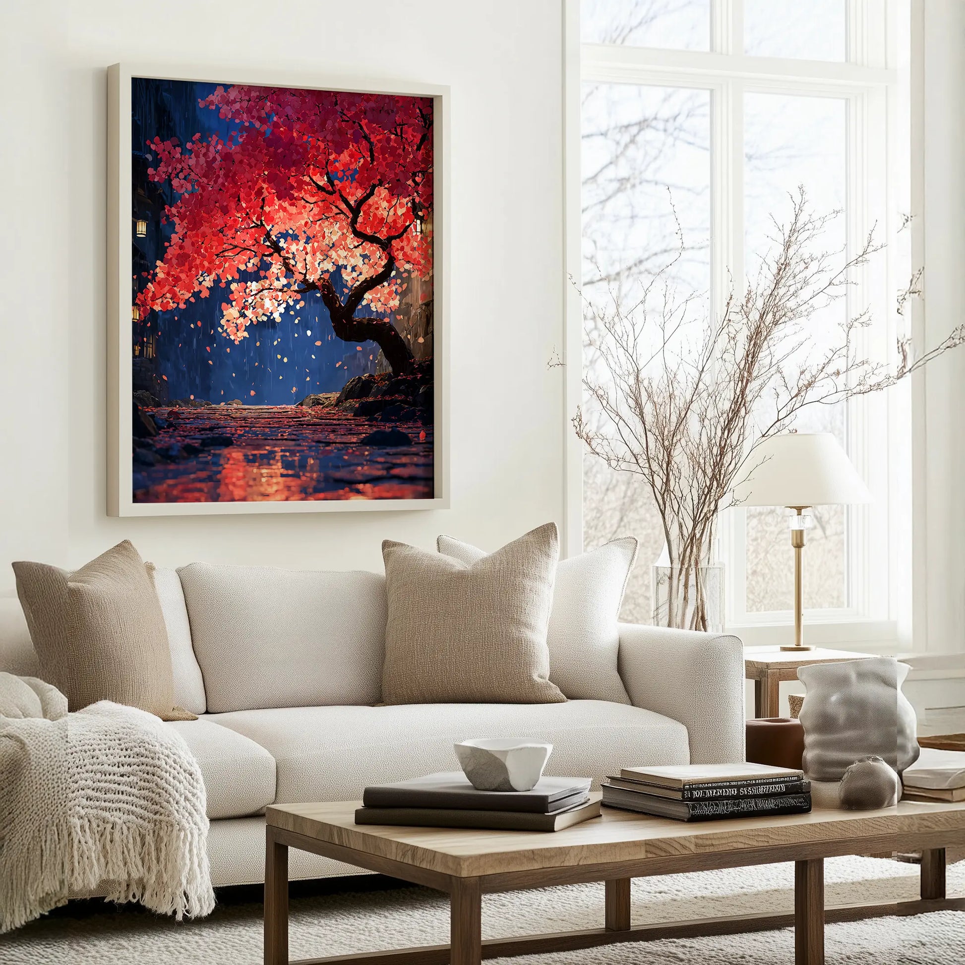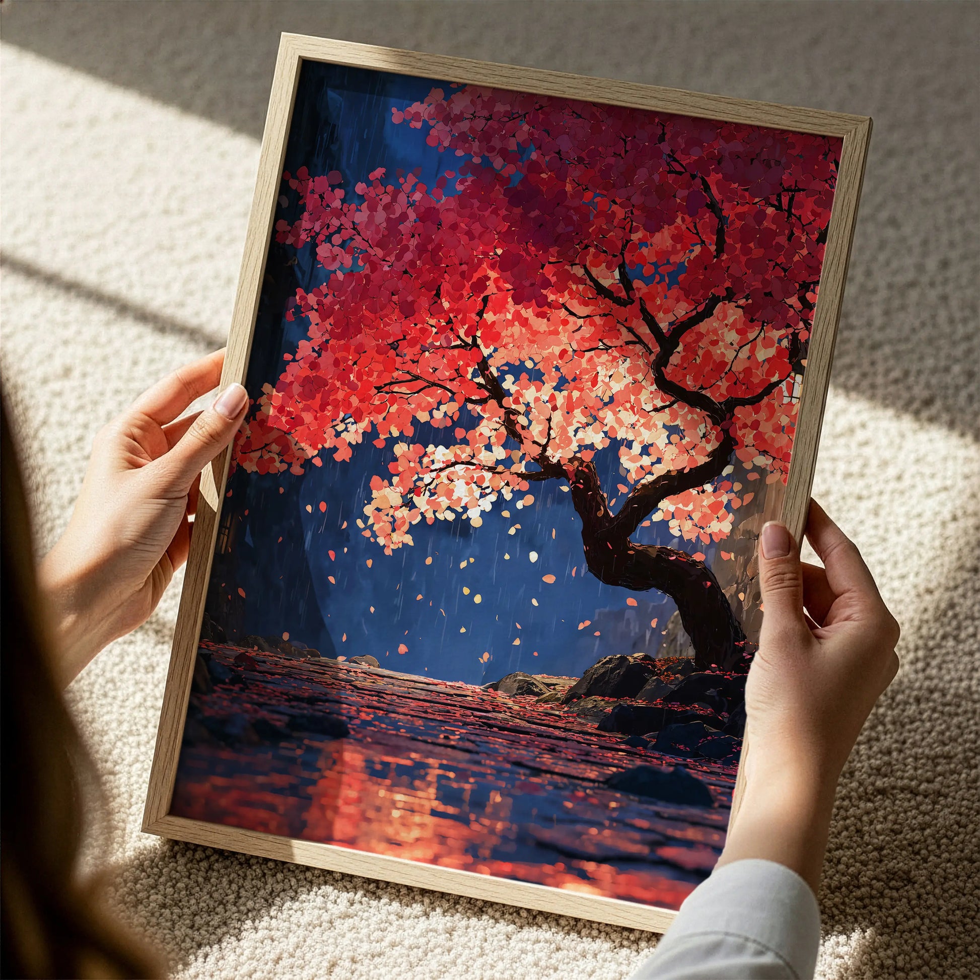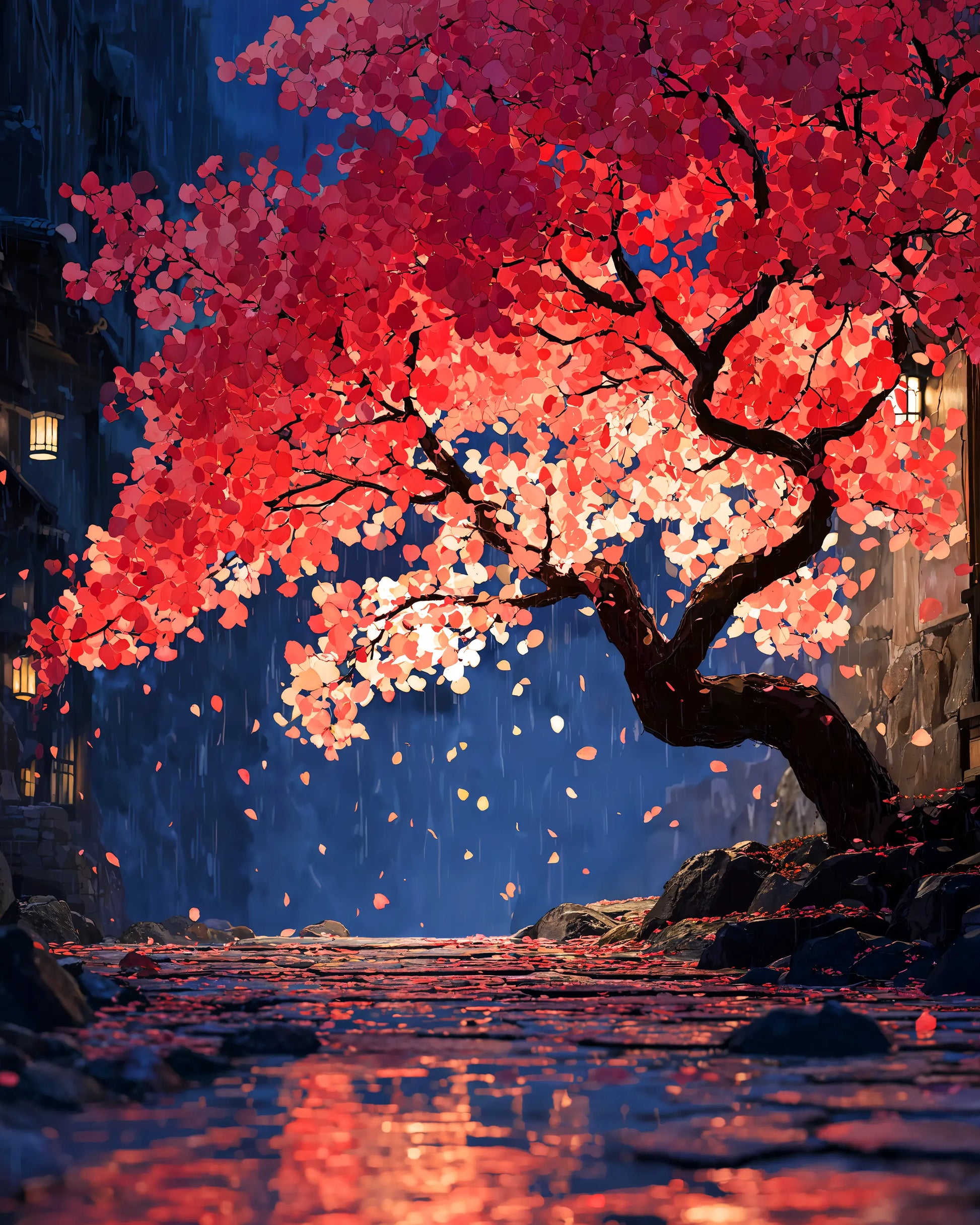 In Cormorant, a single luminous tree spills light into a narrow, rain-slicked path—its crimson blossoms glowing like lanterns against a midnight sky. Raindrops fall in silence, scattering petals onto the stone walkway, where reflections shimmer in deep reds and electric blues.