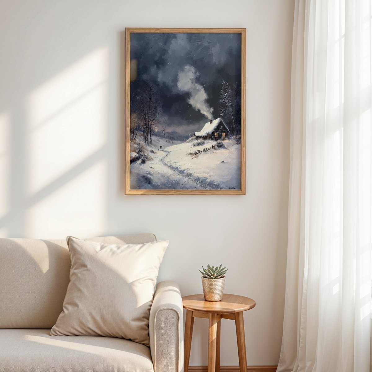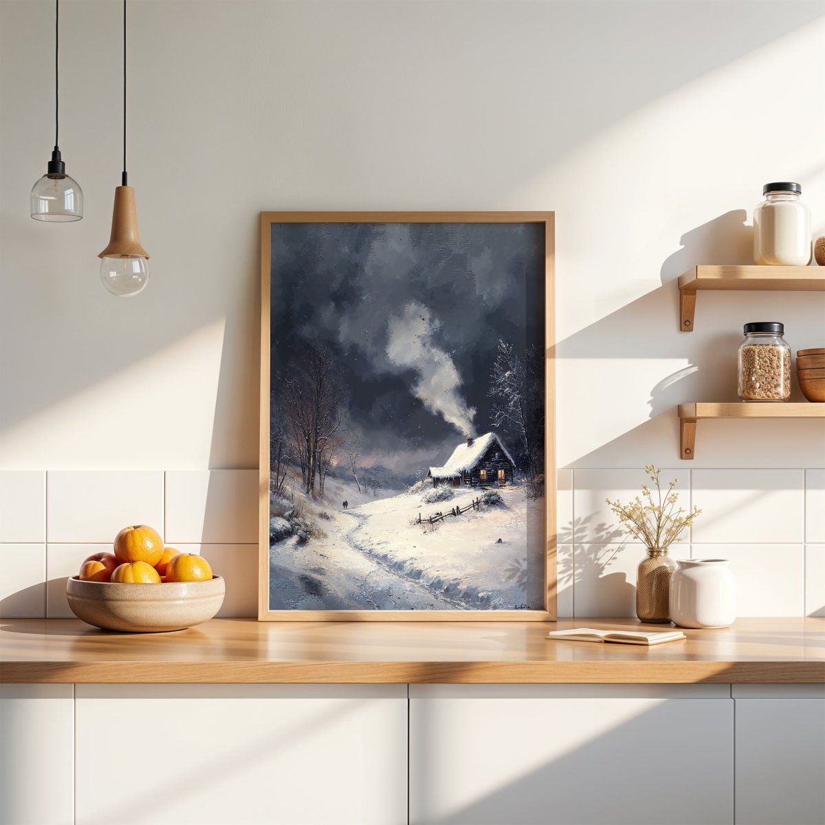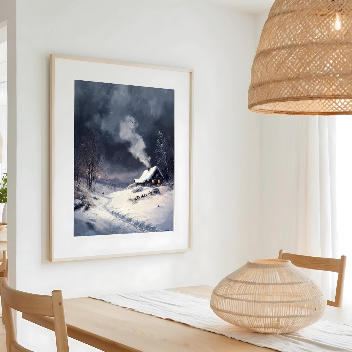 Handcrafted using Adobe Photoshop, Illustrator, Procreate, and Rebelle, this piece blends classical atmosphere with contemporary precision. Ideal for hygge-inspired interiors, winter-themed walls, or quiet seasonal moments that call for warmth and stillness.