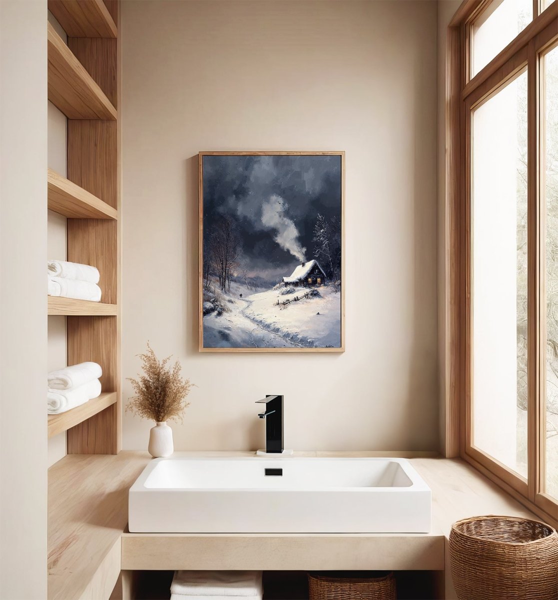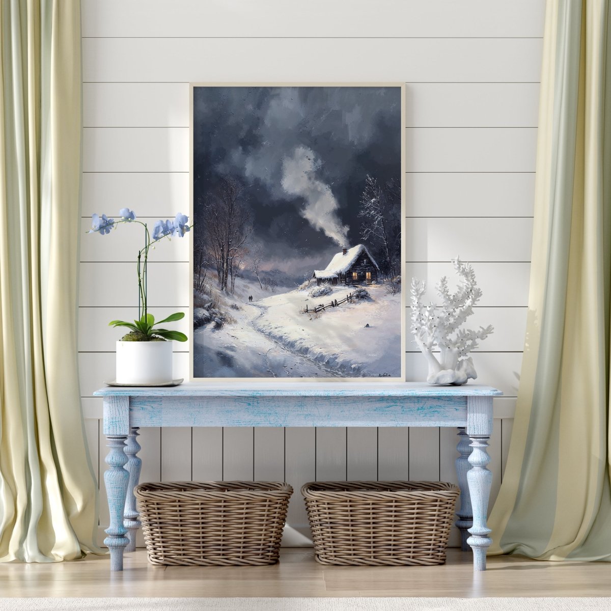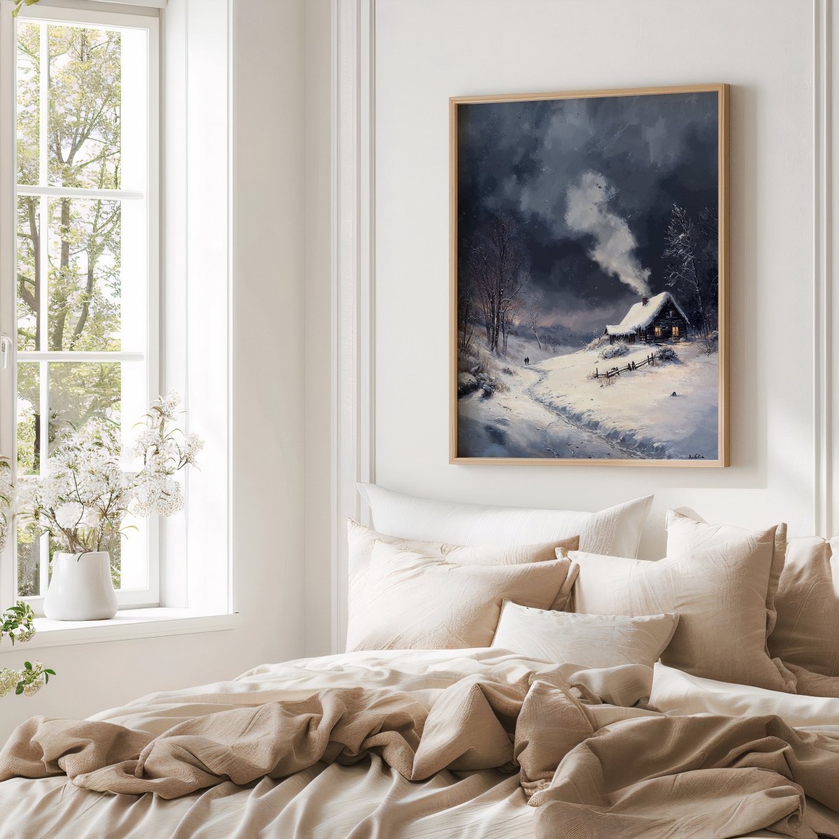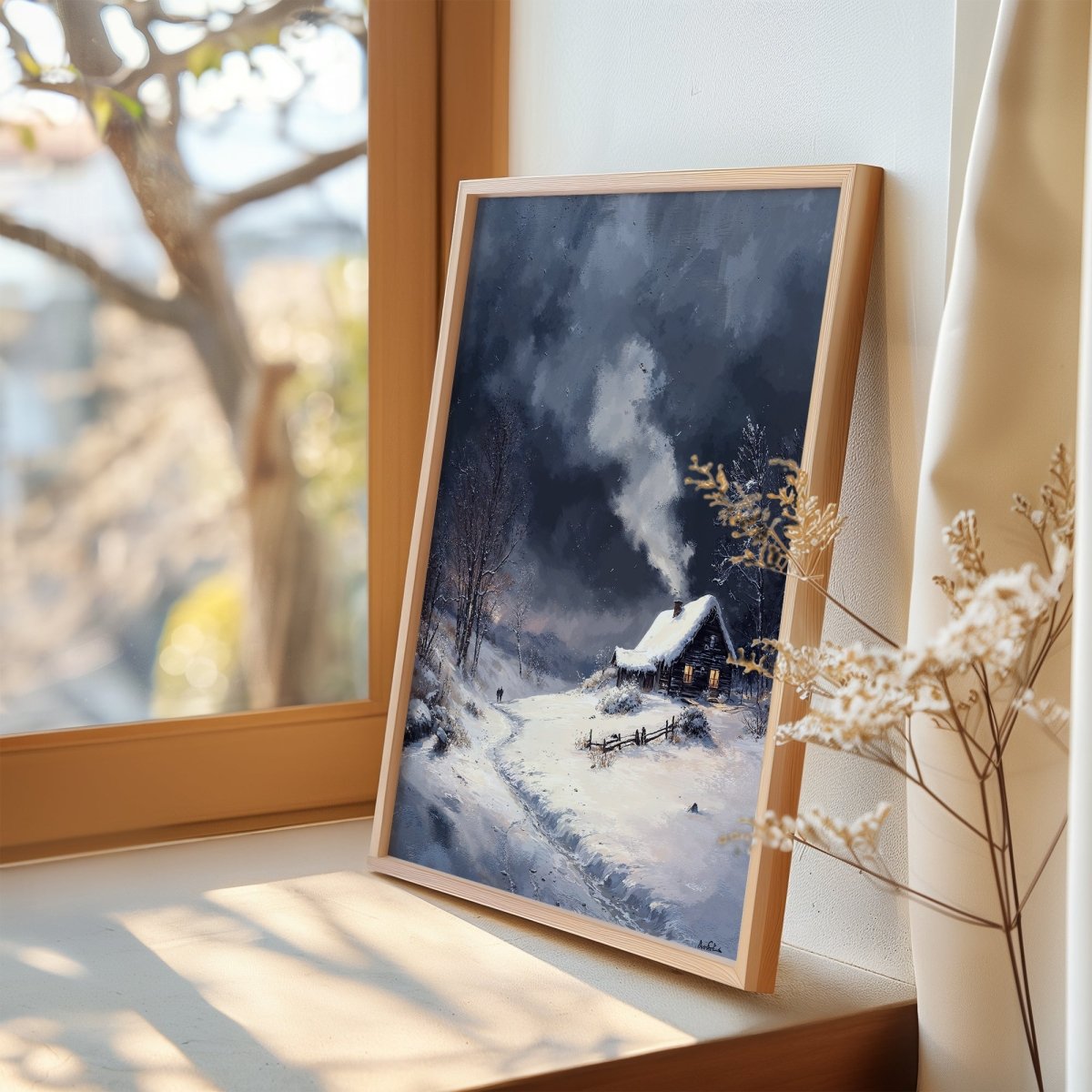 Handcrafted using Adobe Photoshop, Illustrator, Procreate, and Rebelle, this piece blends classical atmosphere with contemporary precision. Ideal for hygge-inspired interiors, winter-themed walls, or quiet seasonal moments that call for warmth and stillness.