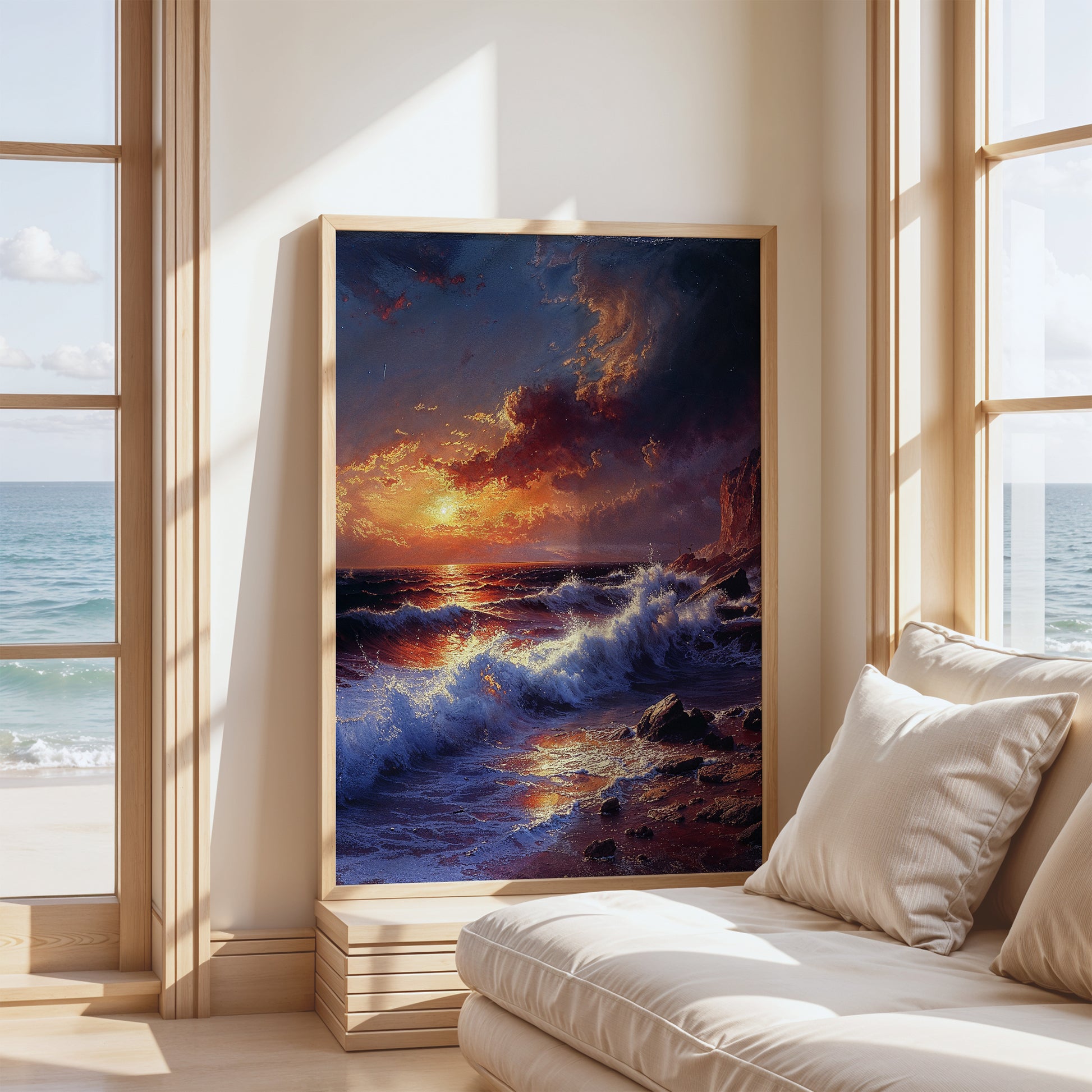 Sun ignites the sea in Crimson Tide, where flame and water collide at the edge of night. Waves lash the shoreline in molten hues, their foam illuminated like breath meeting fire. Above, clouds twist into baroque swells of rust and violet, holding the last light before surrender.