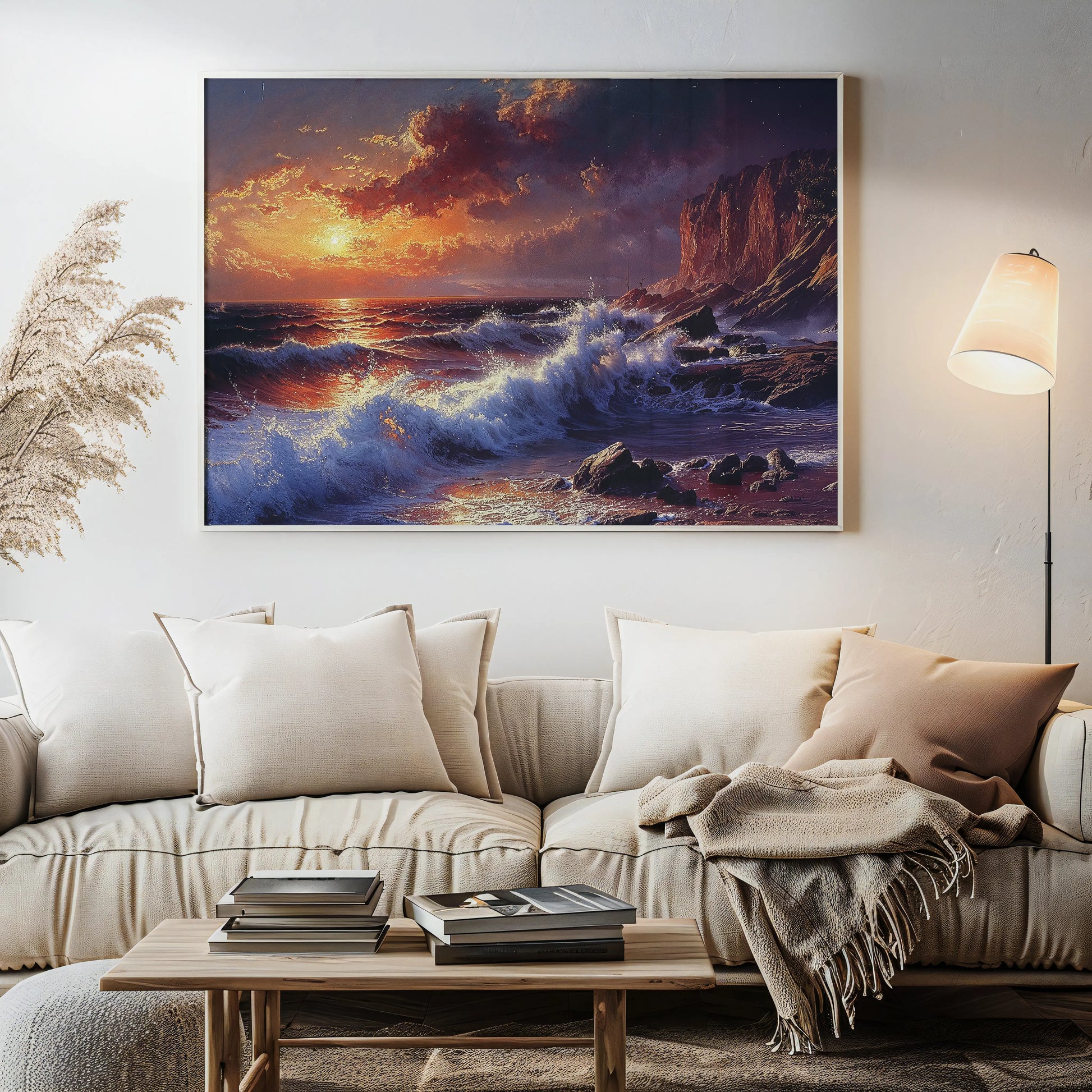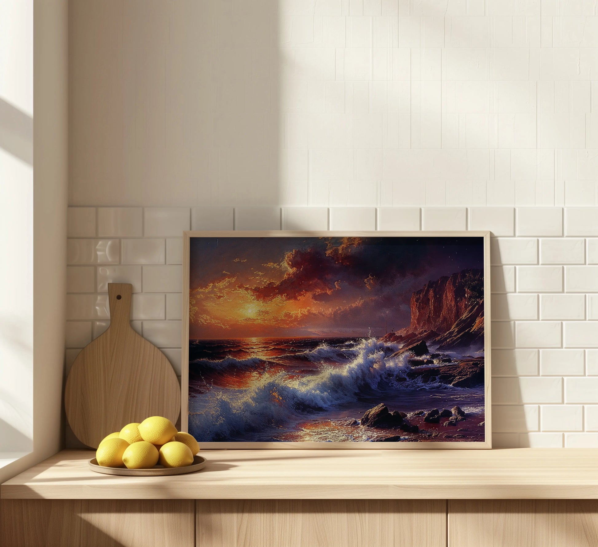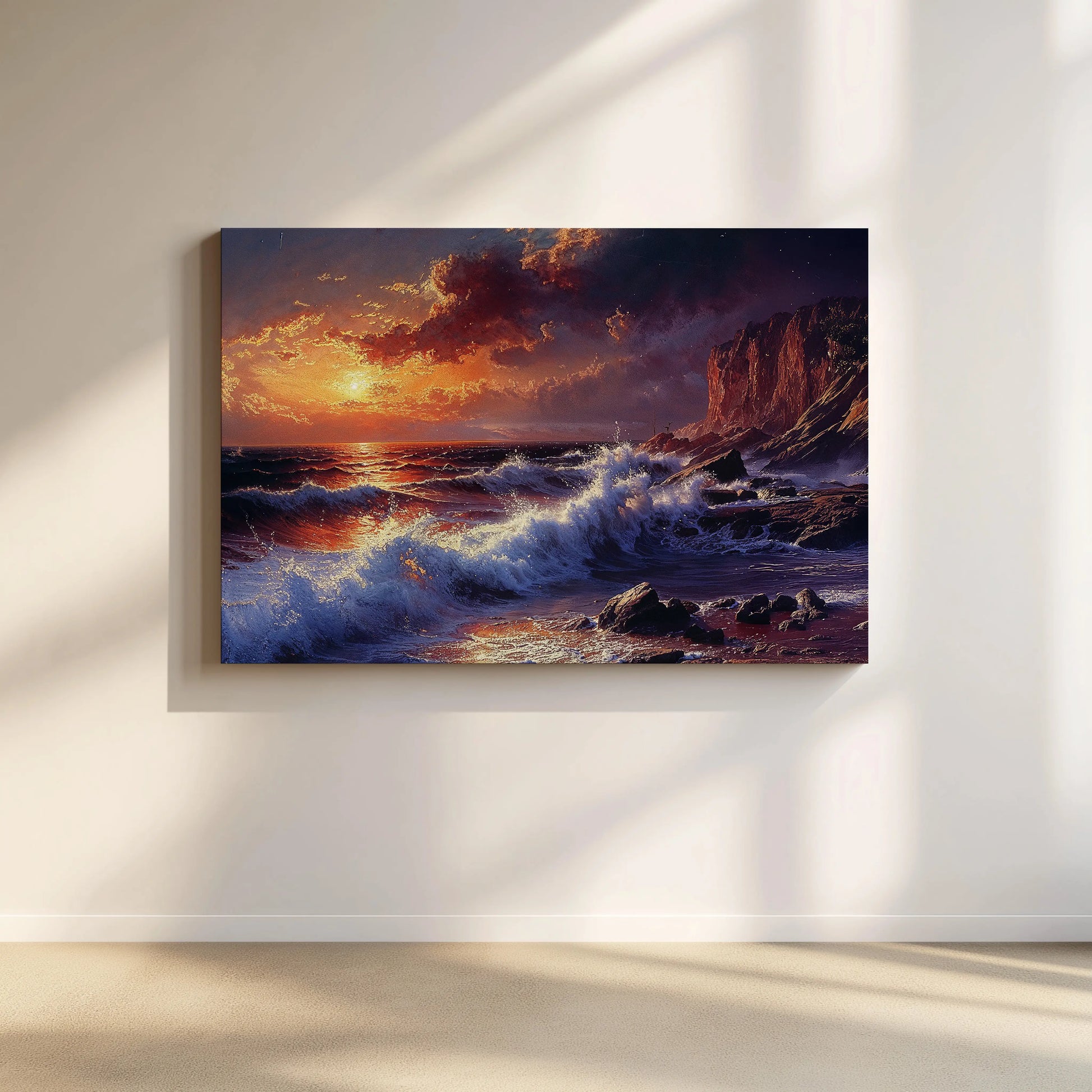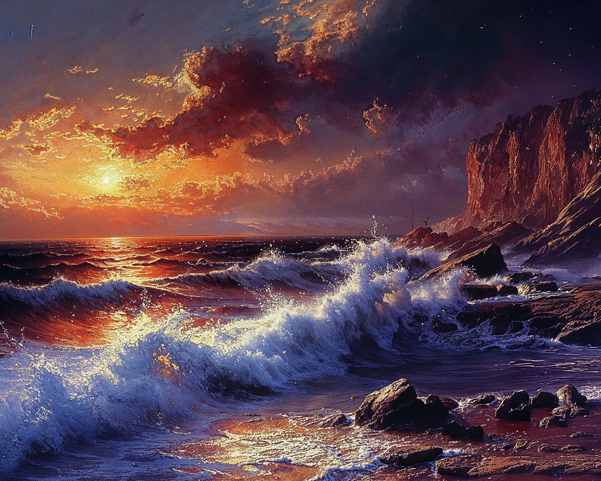 Sun ignites the sea in Crimson Tide, where flame and water collide at the edge of night. Waves lash the shoreline in molten hues, their foam illuminated like breath meeting fire. Above, clouds twist into baroque swells of rust and violet, holding the last light before surrender.