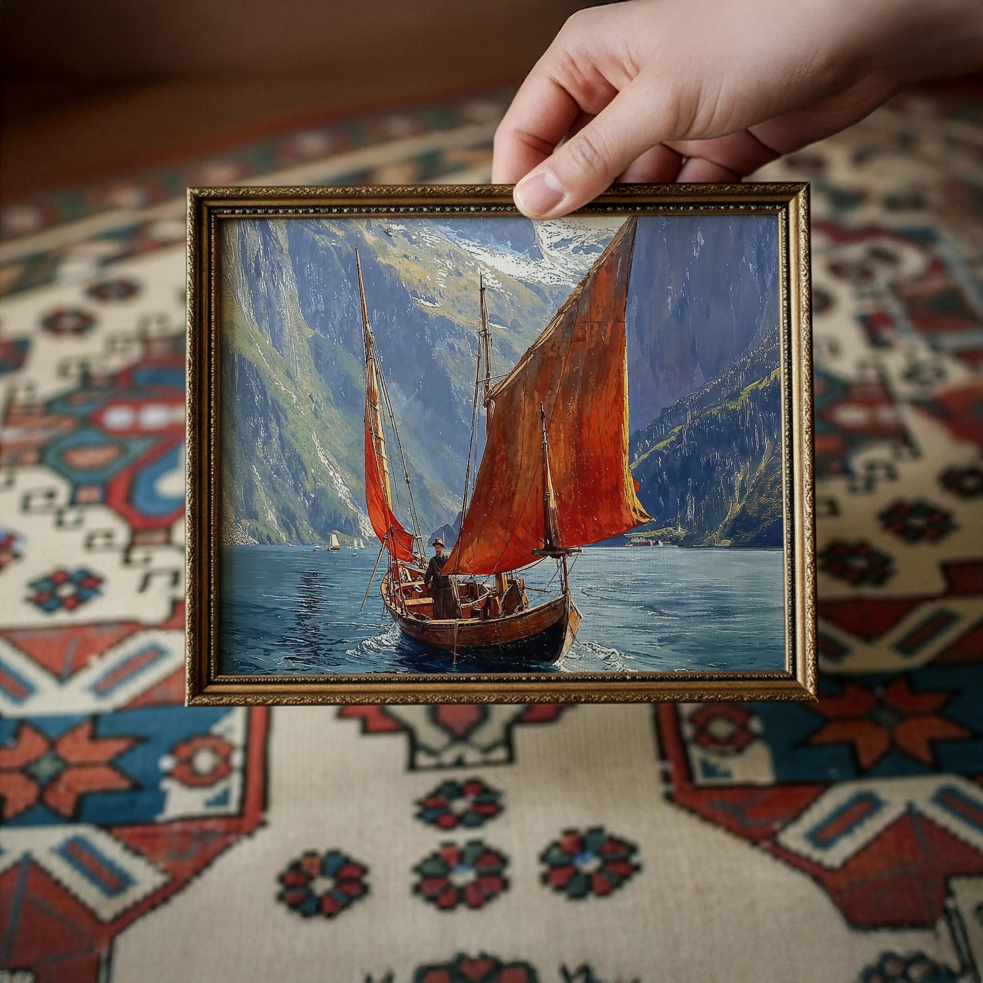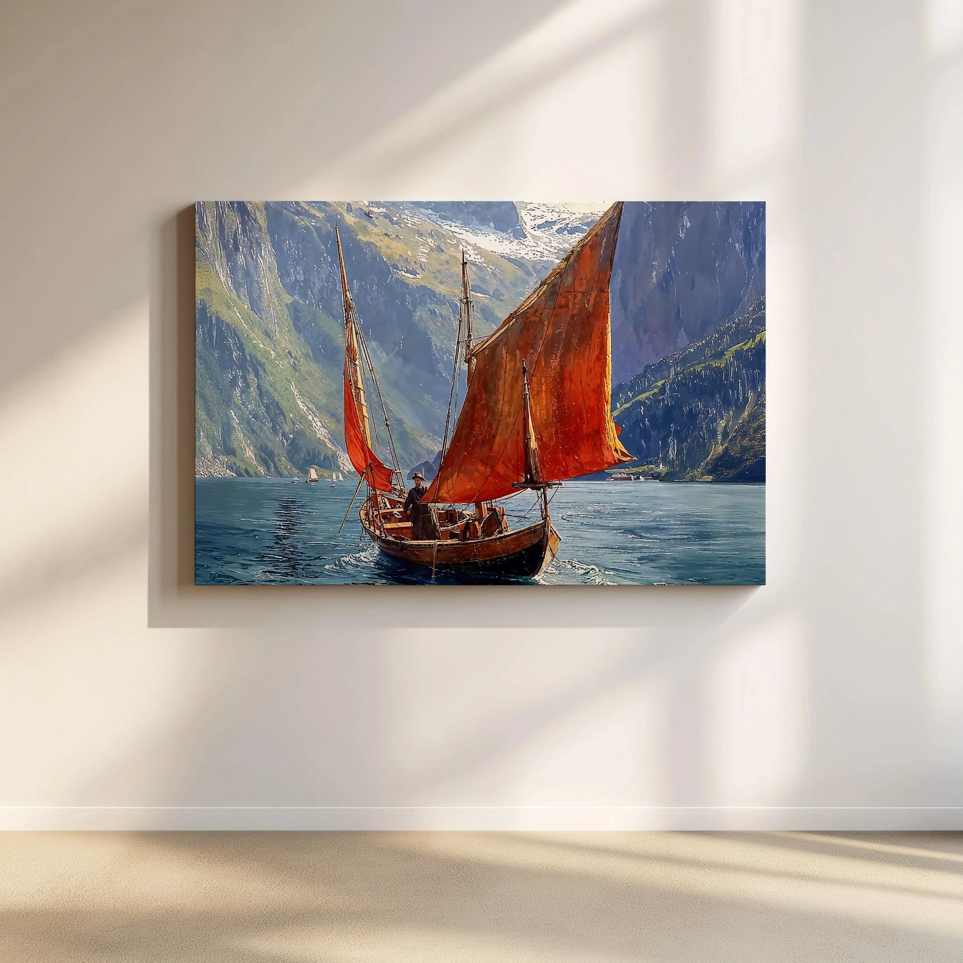 Crimson Voyage sails into silence, where red canvas carves its path through the cool serenity of fjord waters. Towering cliffs and distant snowcaps stand sentinel, yet the lone vessel—modest in form, immense in presence—moves with quiet intent; reflection dances beneath, echoing the sail’s fiery arc.