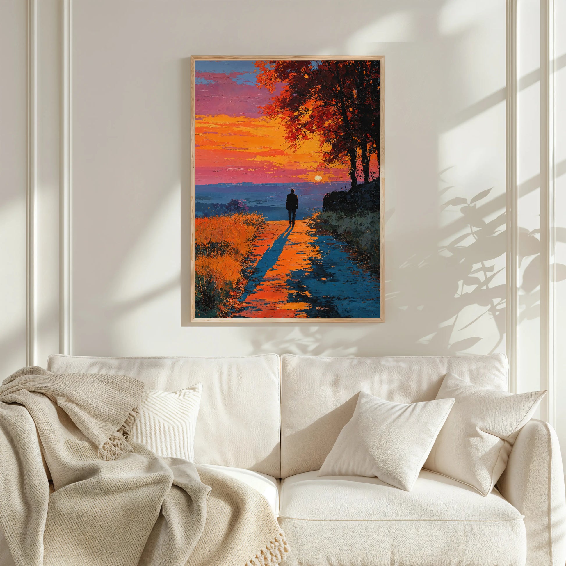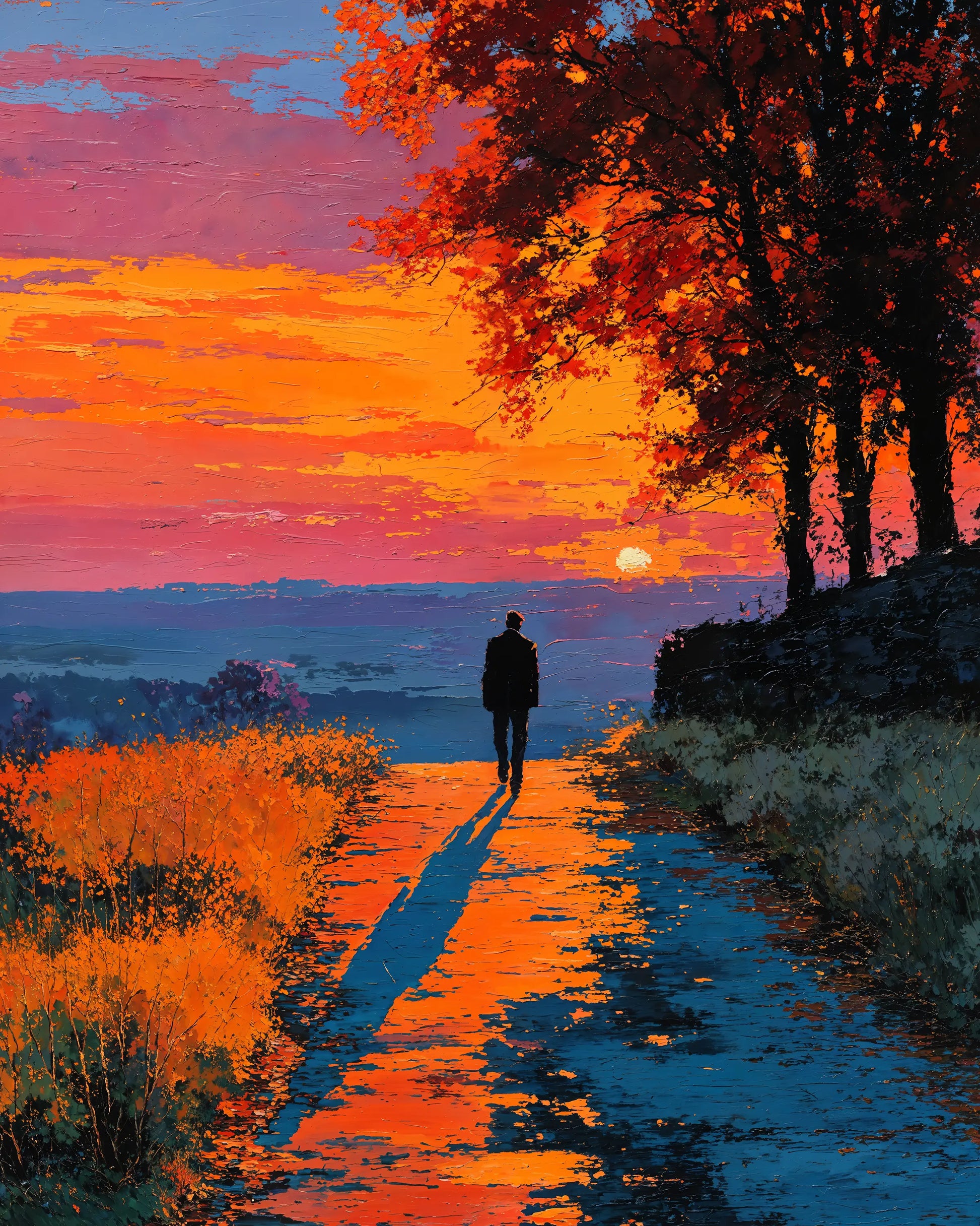 In Devoted, a lone figure walks into the blaze of an autumn sunset, casting a long shadow across the glowing path. The sky burns with layers of violet, rose, and orange, while surrounding trees smolder in the same rich palette.
