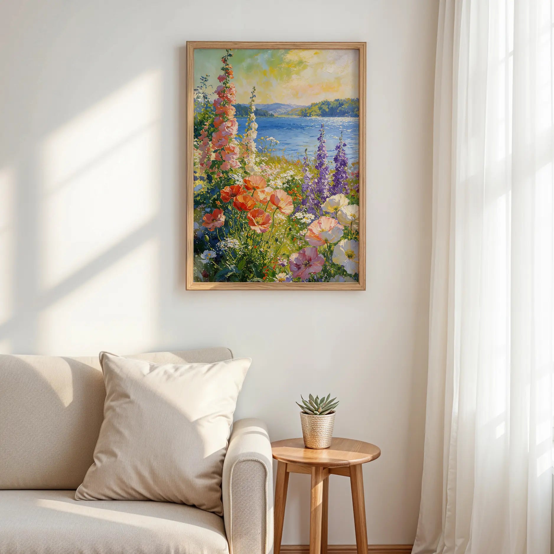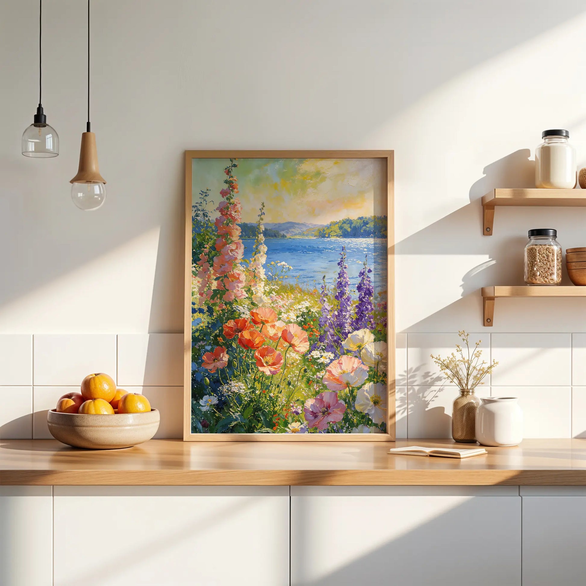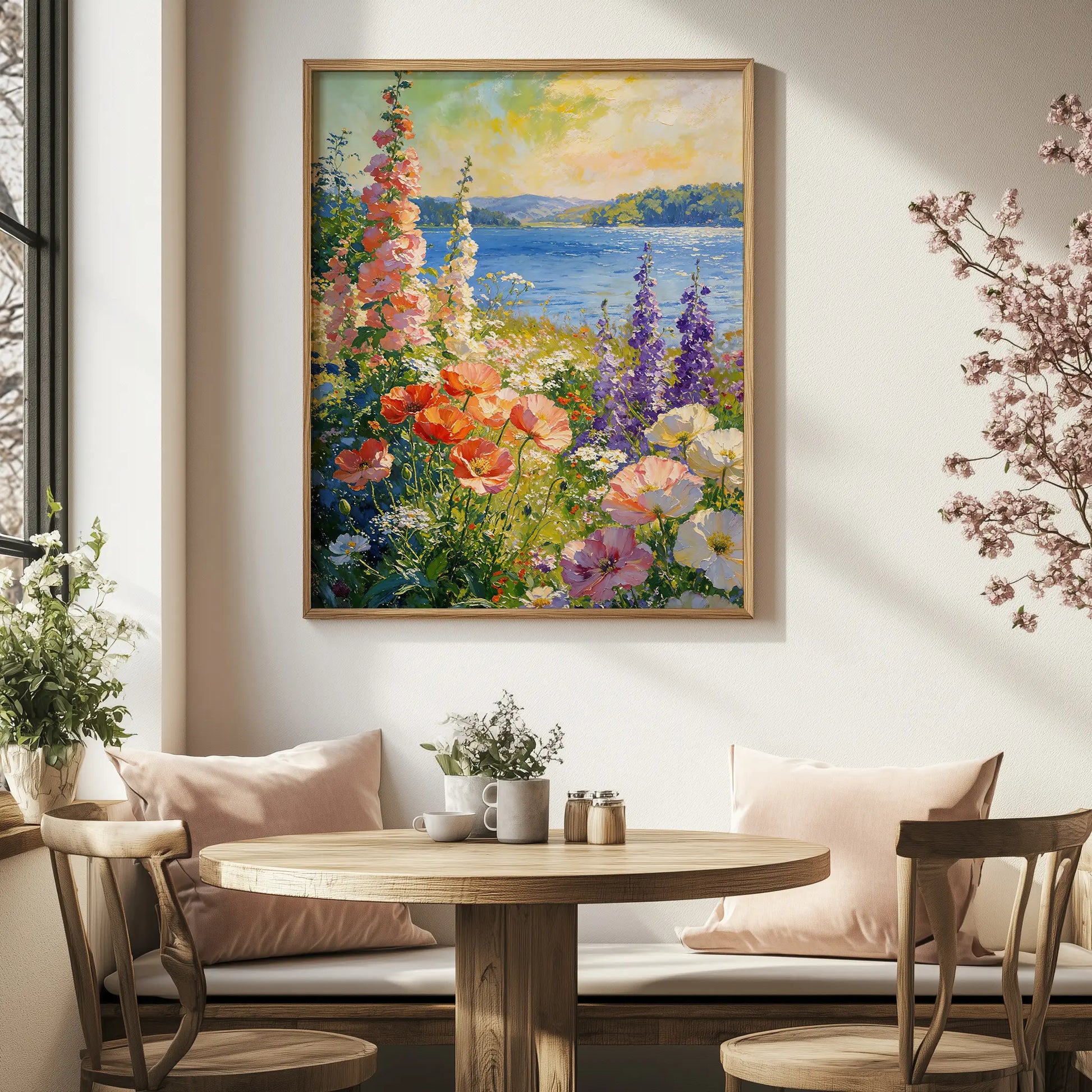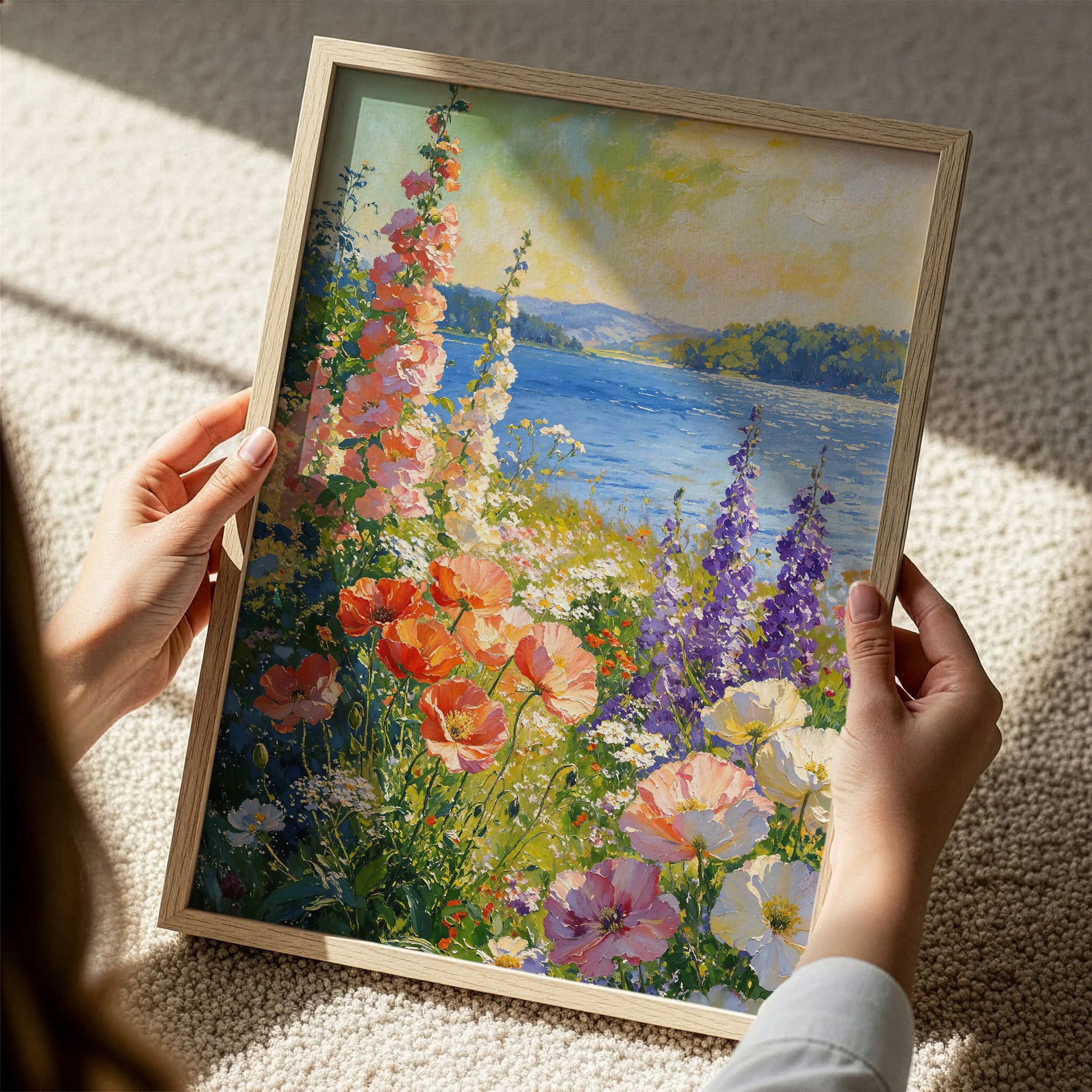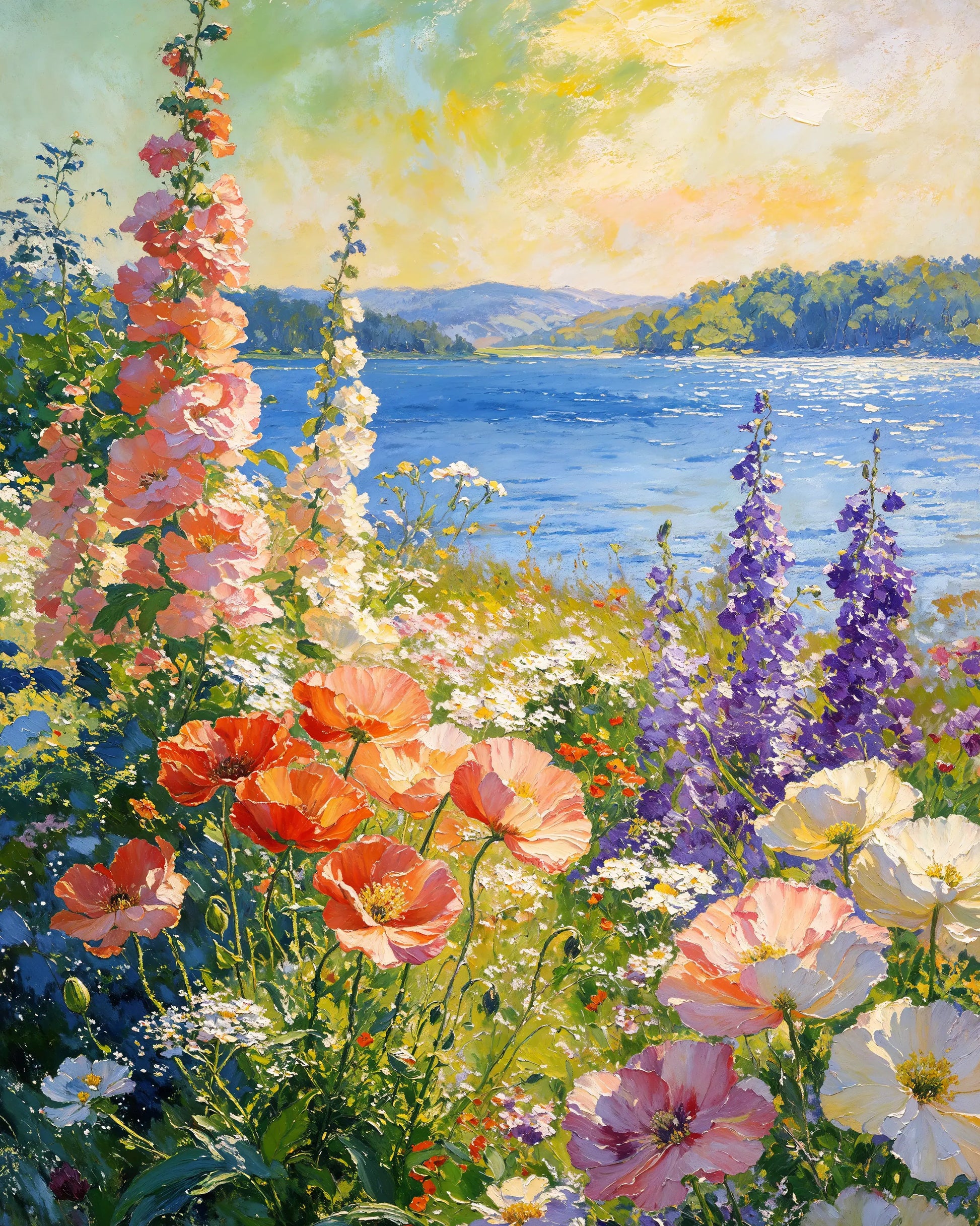 Dew depicts a lakeside meadow where summer flowers rise thick and bright, their petals catching light as water glimmers beyond. Poppies, foxglove, and wild blooms sway in warm air, set against distant hills and a sky washed in soft yellow and blue.
