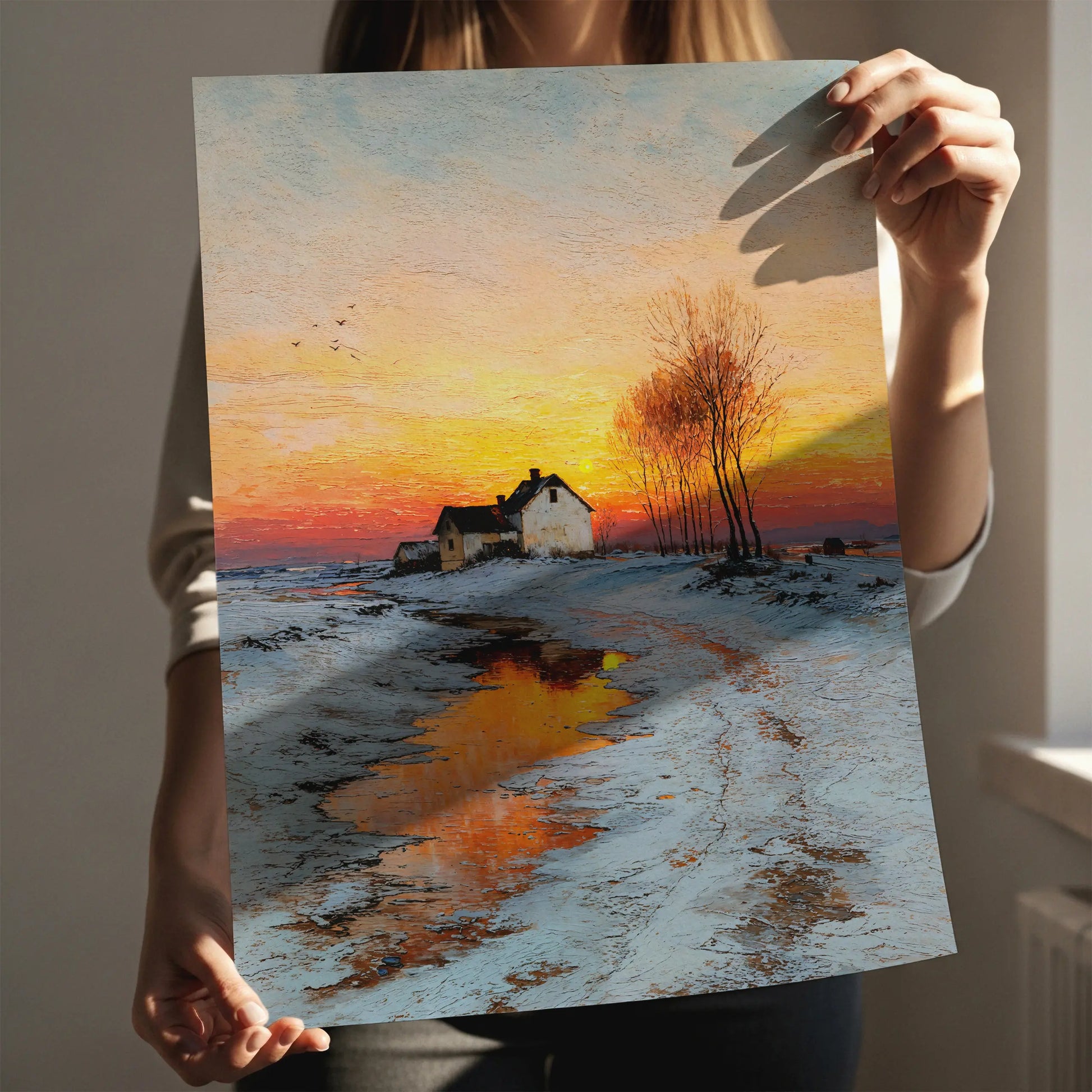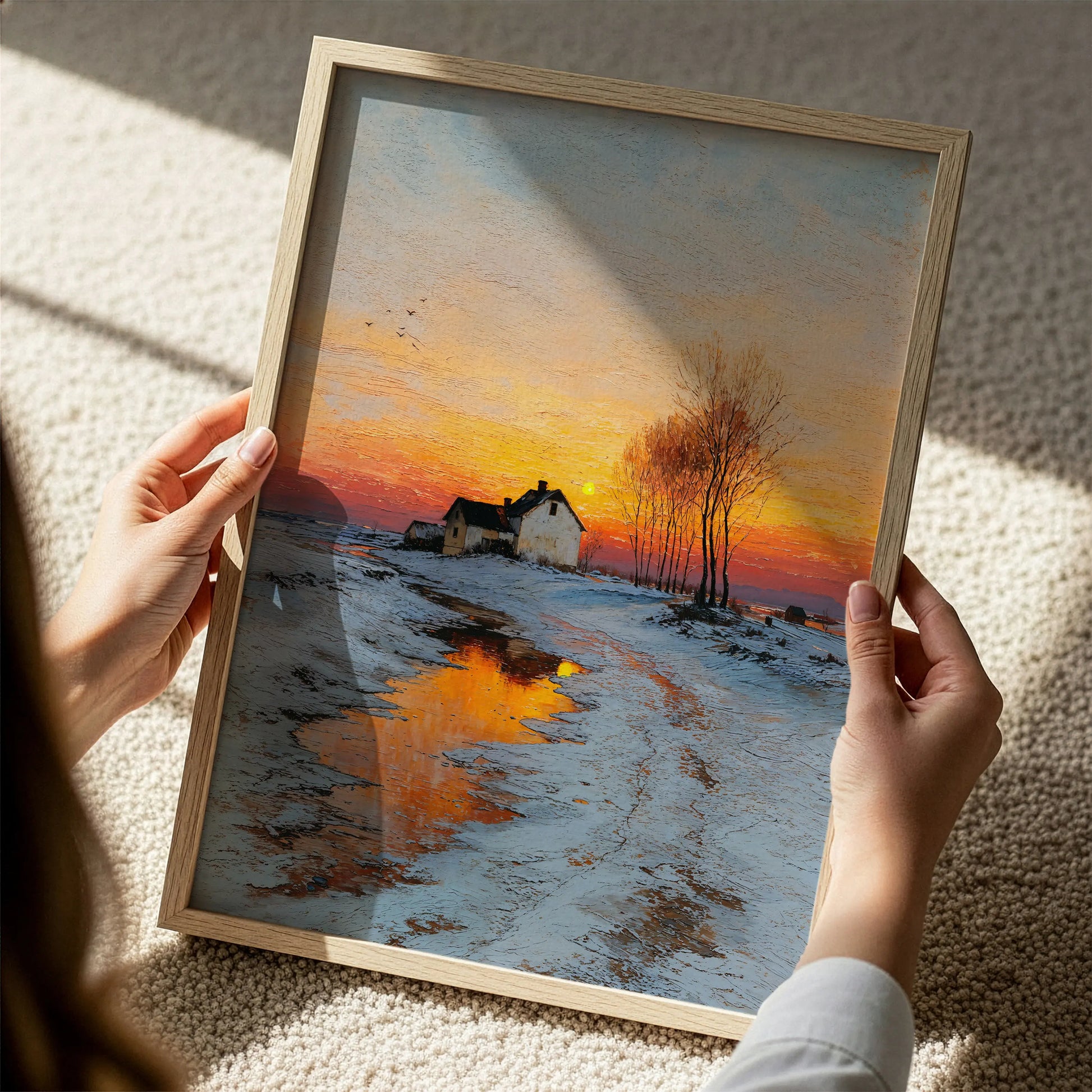 In Echoes of Cinnabar, the last light of day melts across a snowy riverbend, where golden tones linger on rooftops and water alike. The quiet river reflects the sky's final flame, and rustic homes rest under the hush of dusk.
