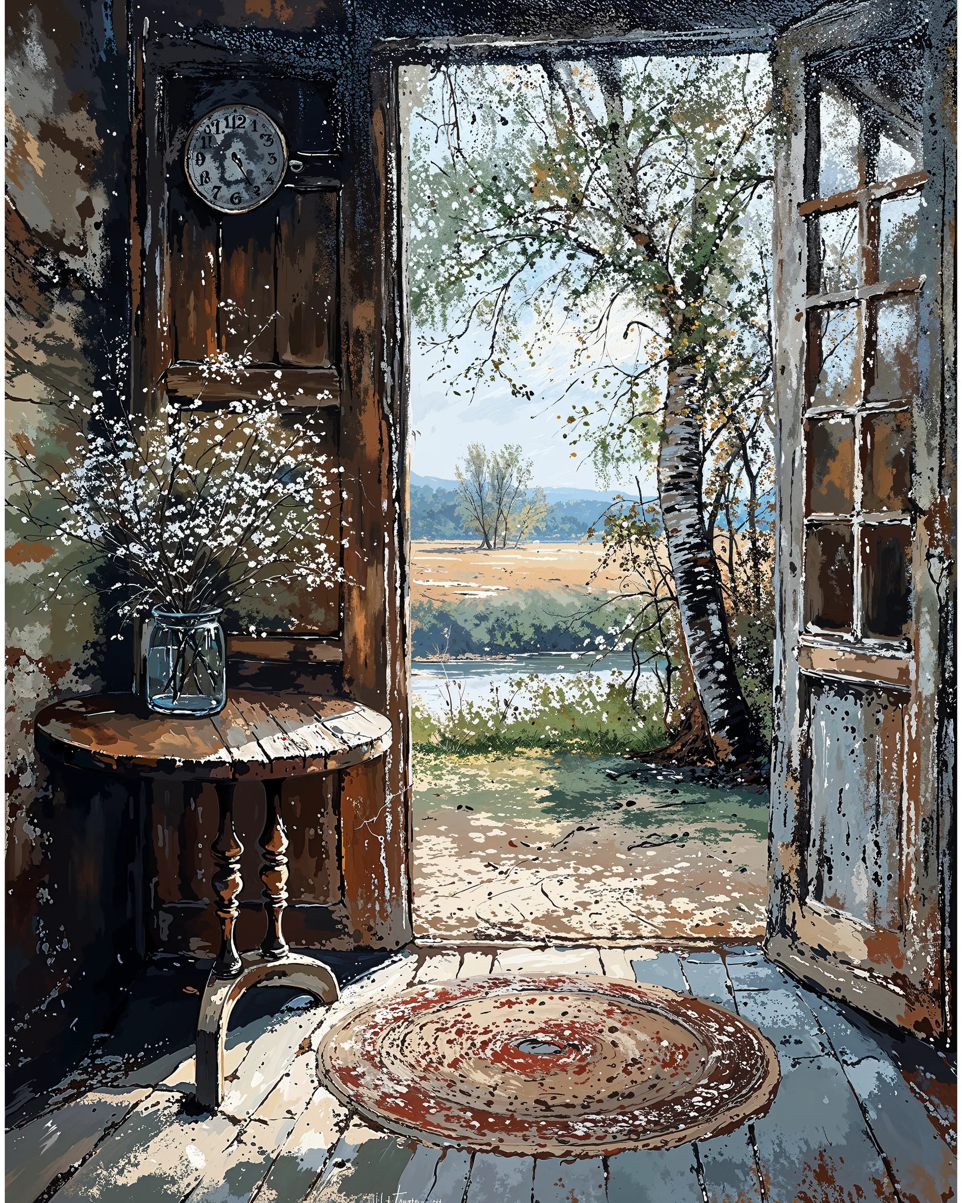 Edge of Light captures a quiet threshold where morning touches wildflowers and weathered floorboards. A birch shimmers just beyond, with a river’s hush and open fields beckoning softly toward a distant sky.