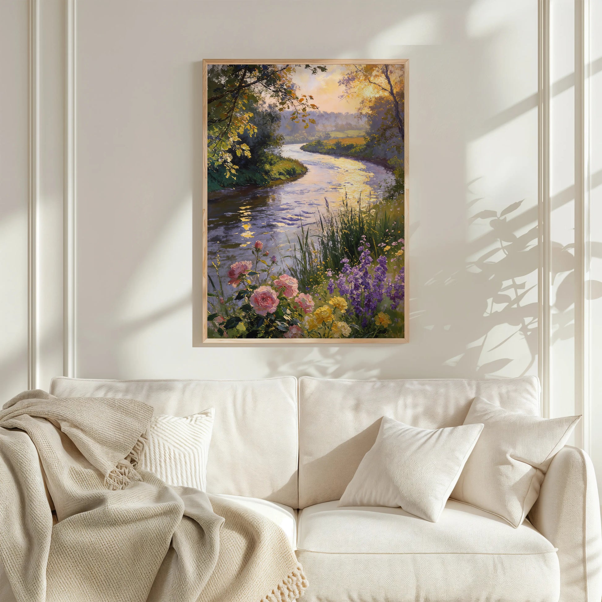 Eglantine is a vertical fine art print on matte paper depicting a gently winding river bordered by flowering plants and softly illuminated trees. Roses and wild blooms fill the foreground while light drifts across the water’s surface, reflecting the surrounding landscape with subtle movement.