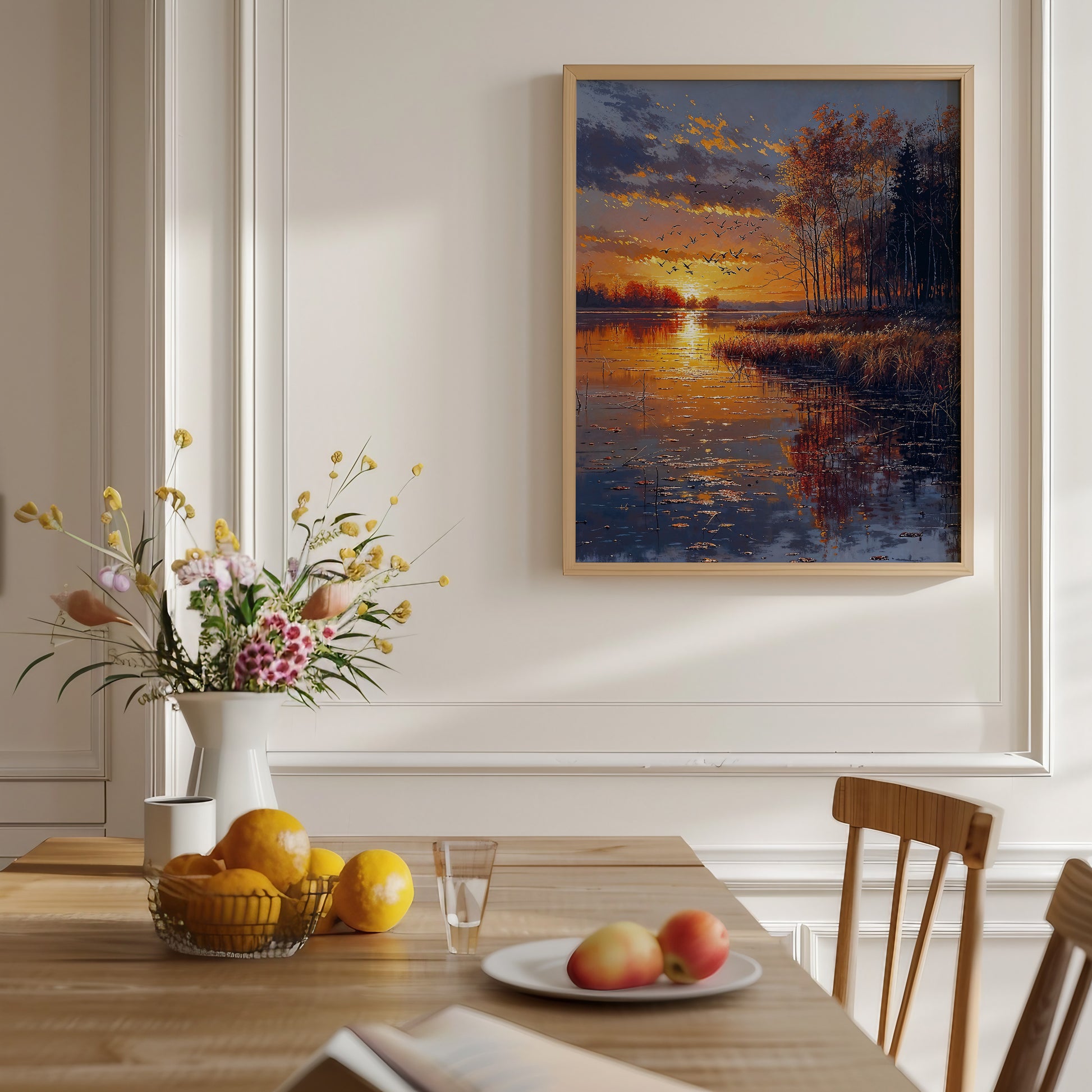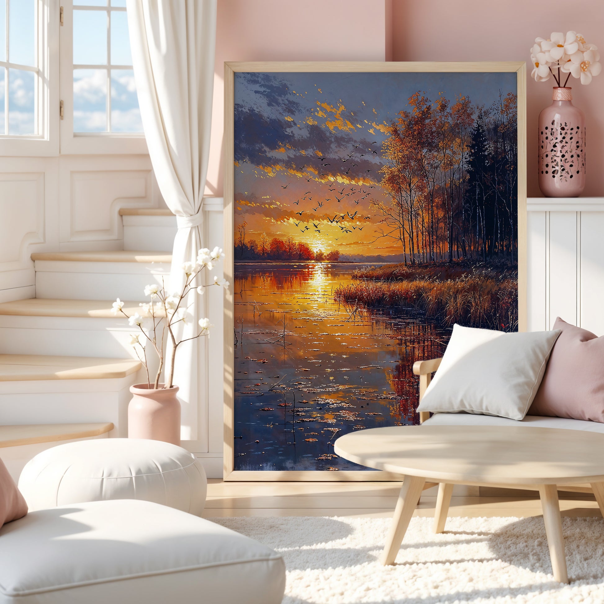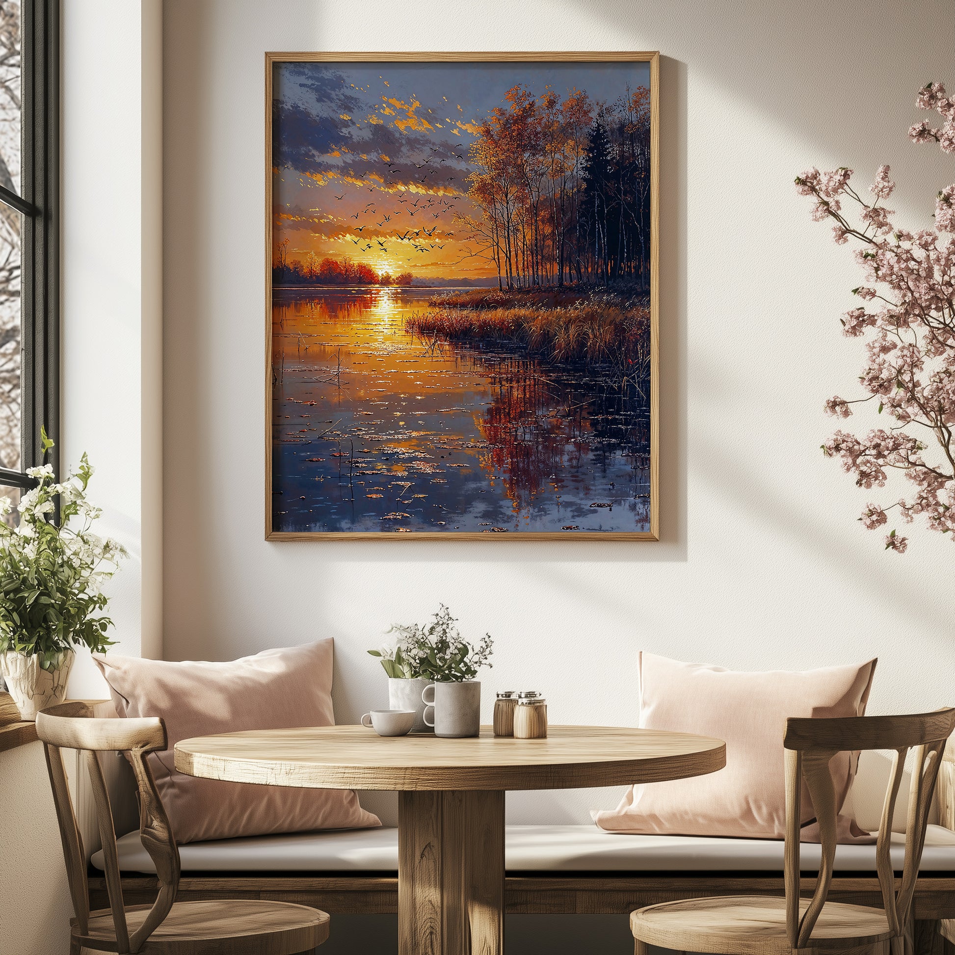 Designed to enhance restful spaces—bedrooms, lakeside interiors, or meditation rooms—it invites quiet presence. More than a sunset, it is a passage: golden, suspended, and momentarily eternal.