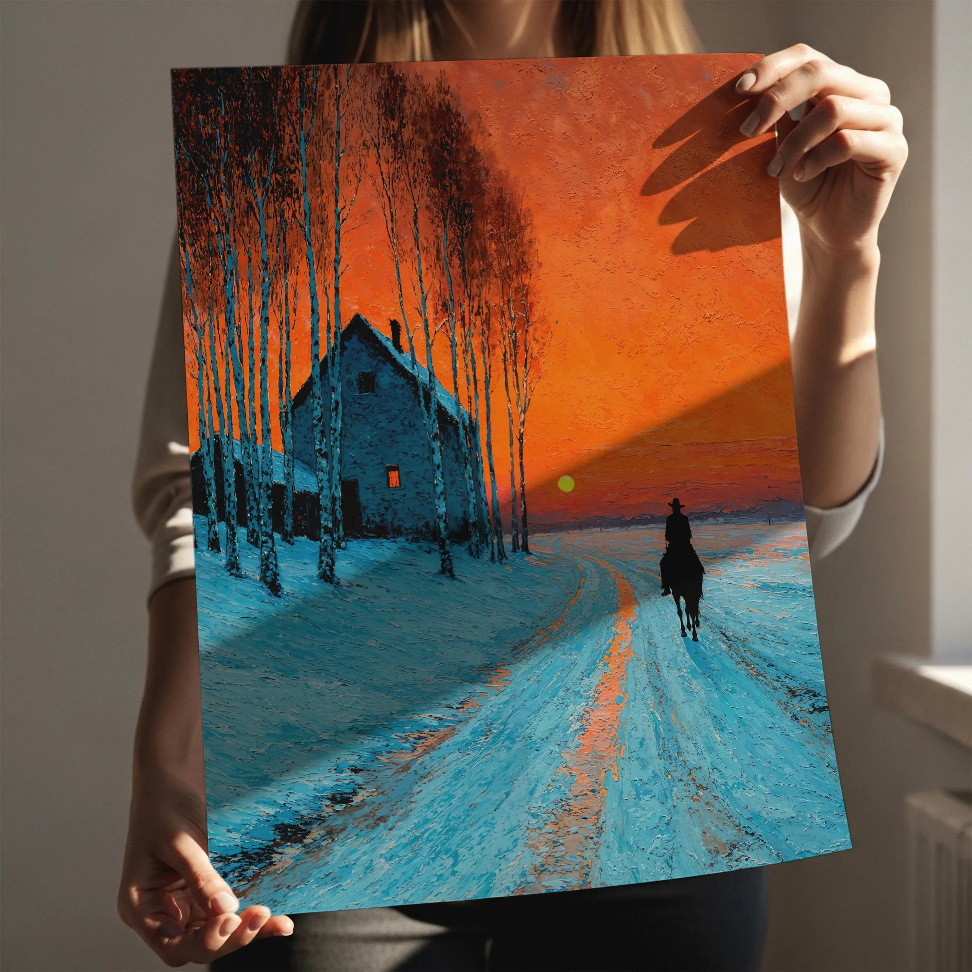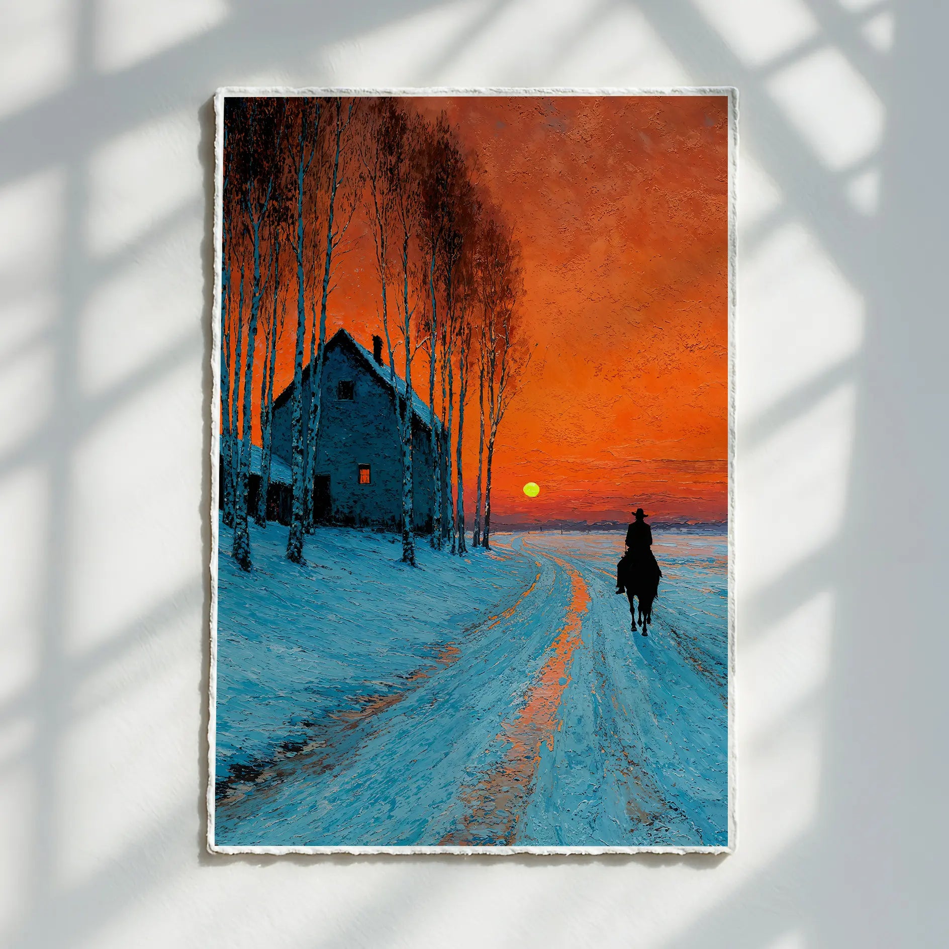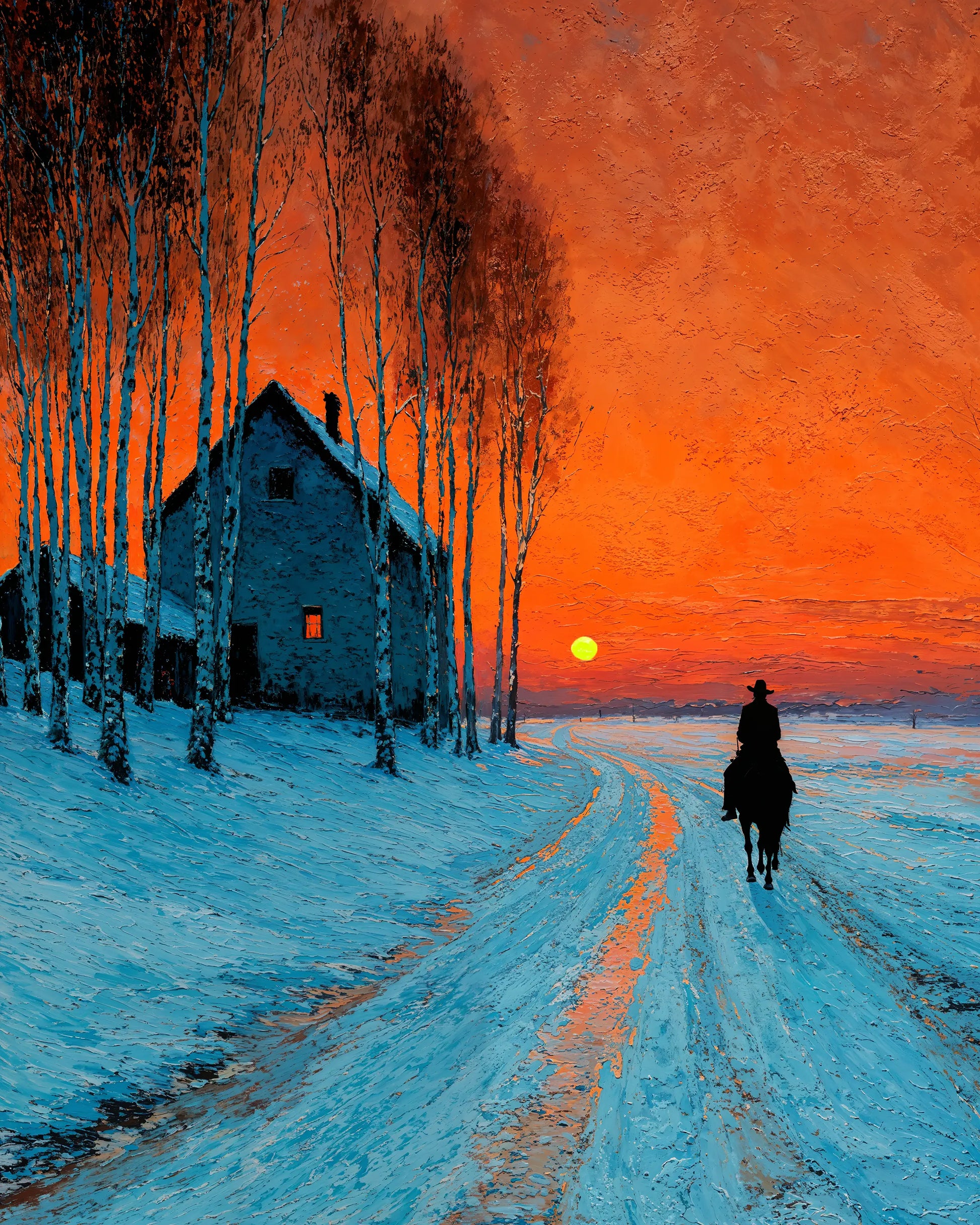 In Eternal, a lone rider drifts into the horizon as the last light of day stretches across a snow-covered path. A warm crimson sky blazes behind a quiet birch forest and a darkened house, their silhouettes softened by distance and time. The snow reflects gold and fire, contrasting the icy path beneath. Every element is suspended in stillness—light, movement, and memory bound together in a single, timeless frame.