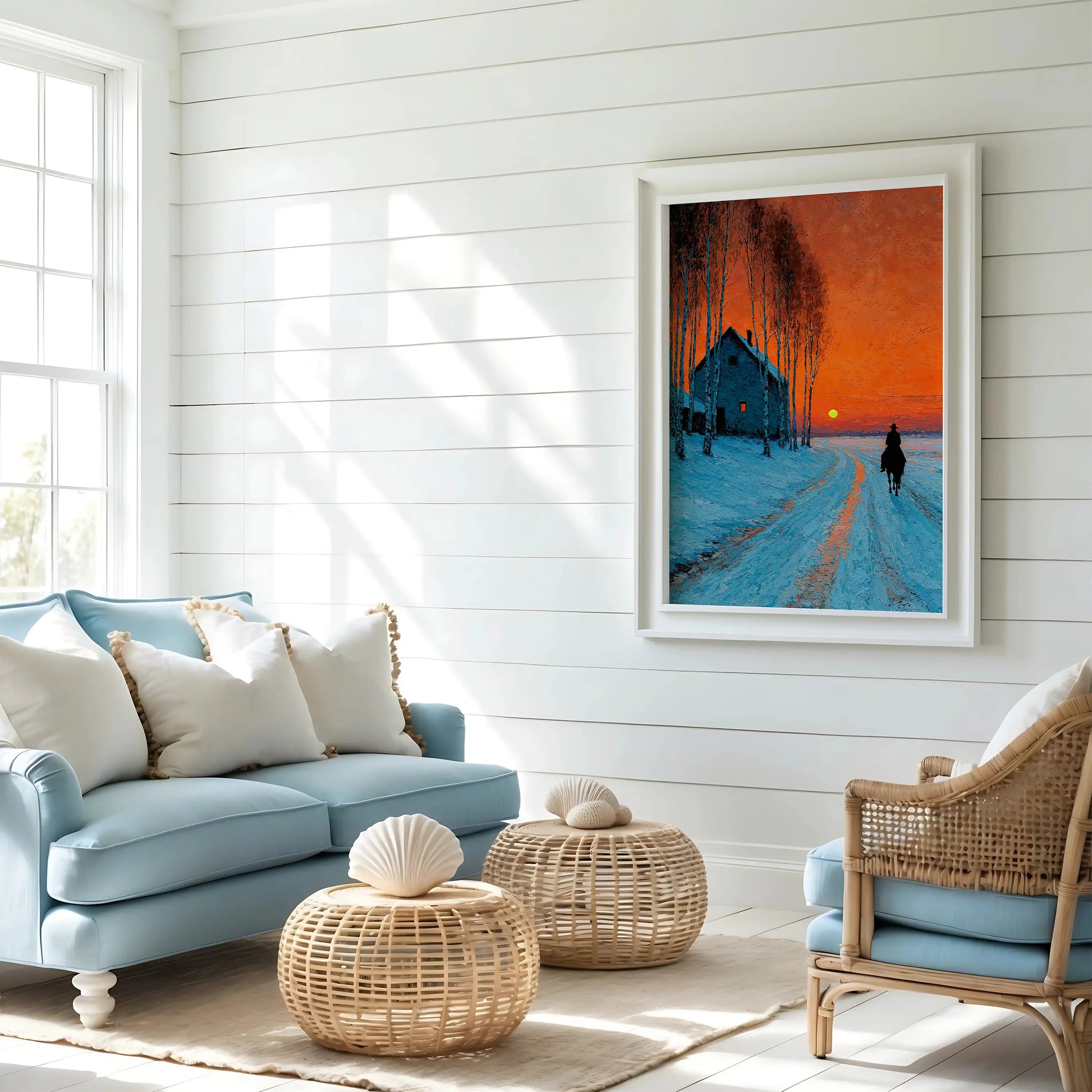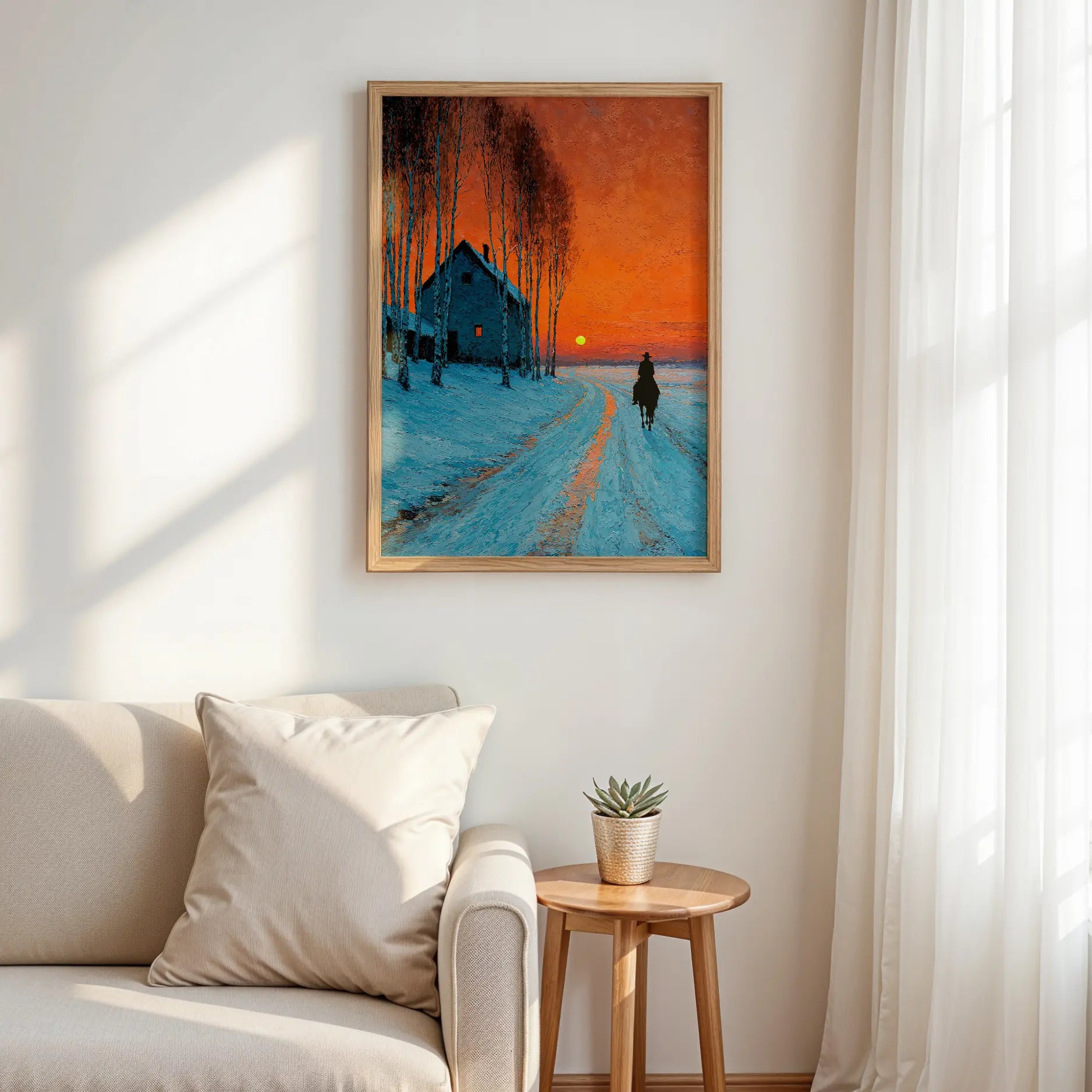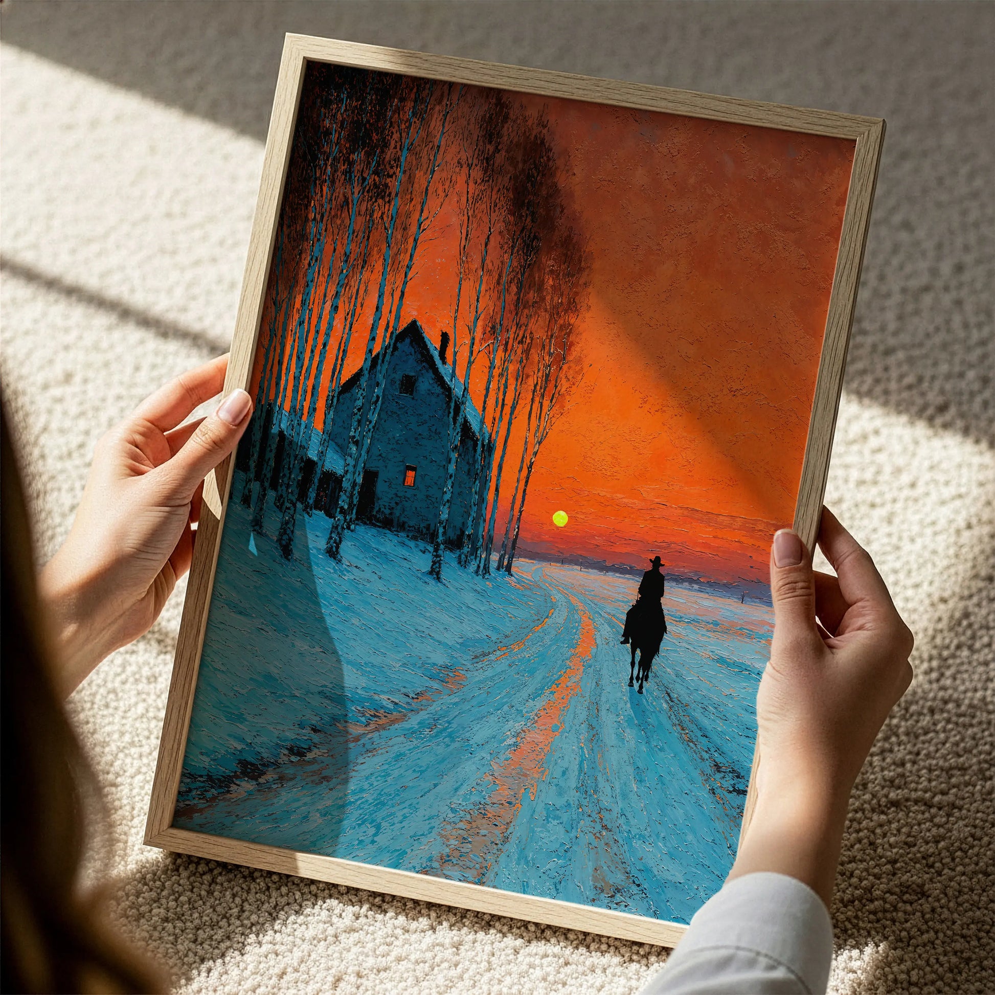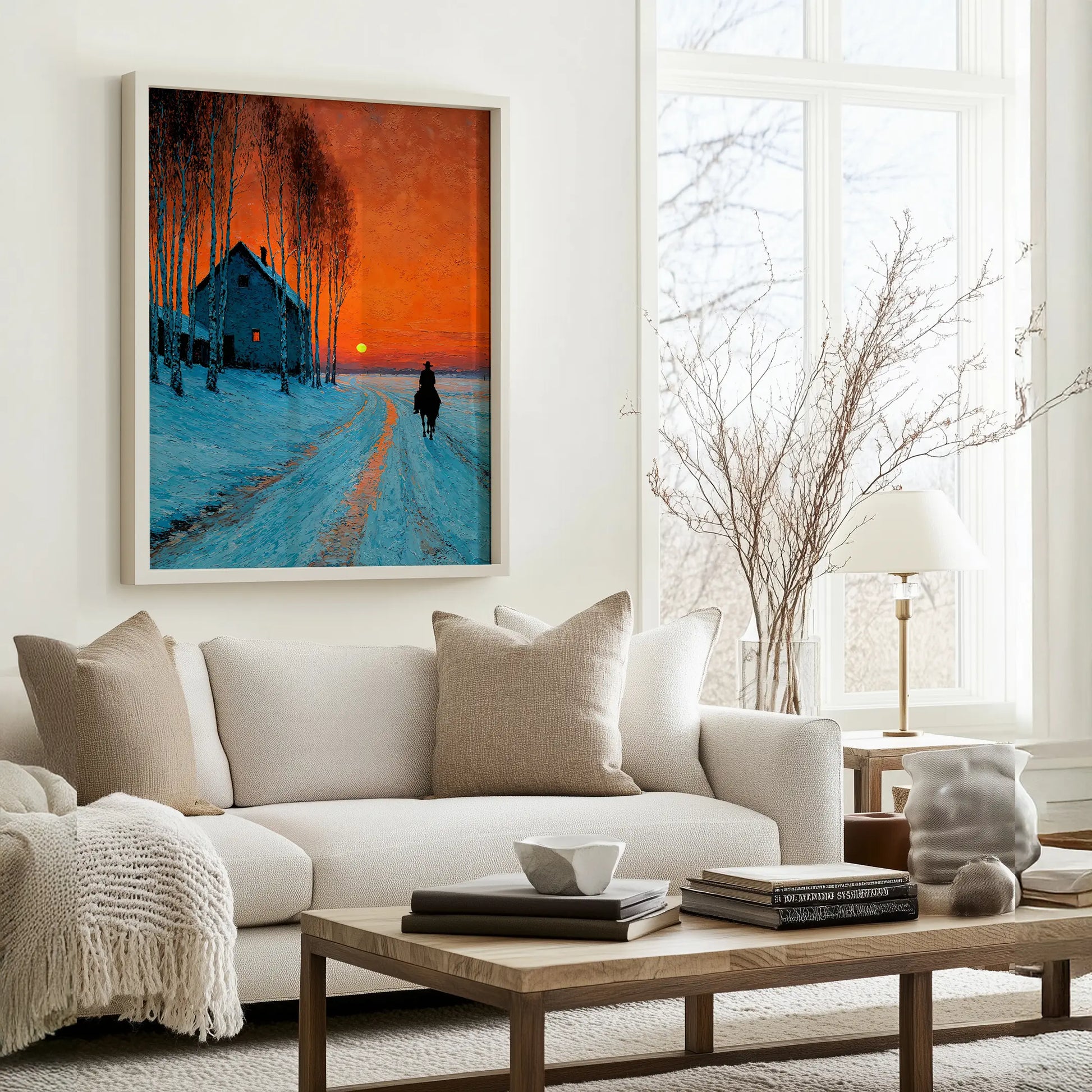 In Eternal, a lone rider drifts into the horizon as the last light of day stretches across a snow-covered path. A warm crimson sky blazes behind a quiet birch forest and a darkened house, their silhouettes softened by distance and time. The snow reflects gold and fire, contrasting the icy path beneath. Every element is suspended in stillness—light, movement, and memory bound together in a single, timeless frame.