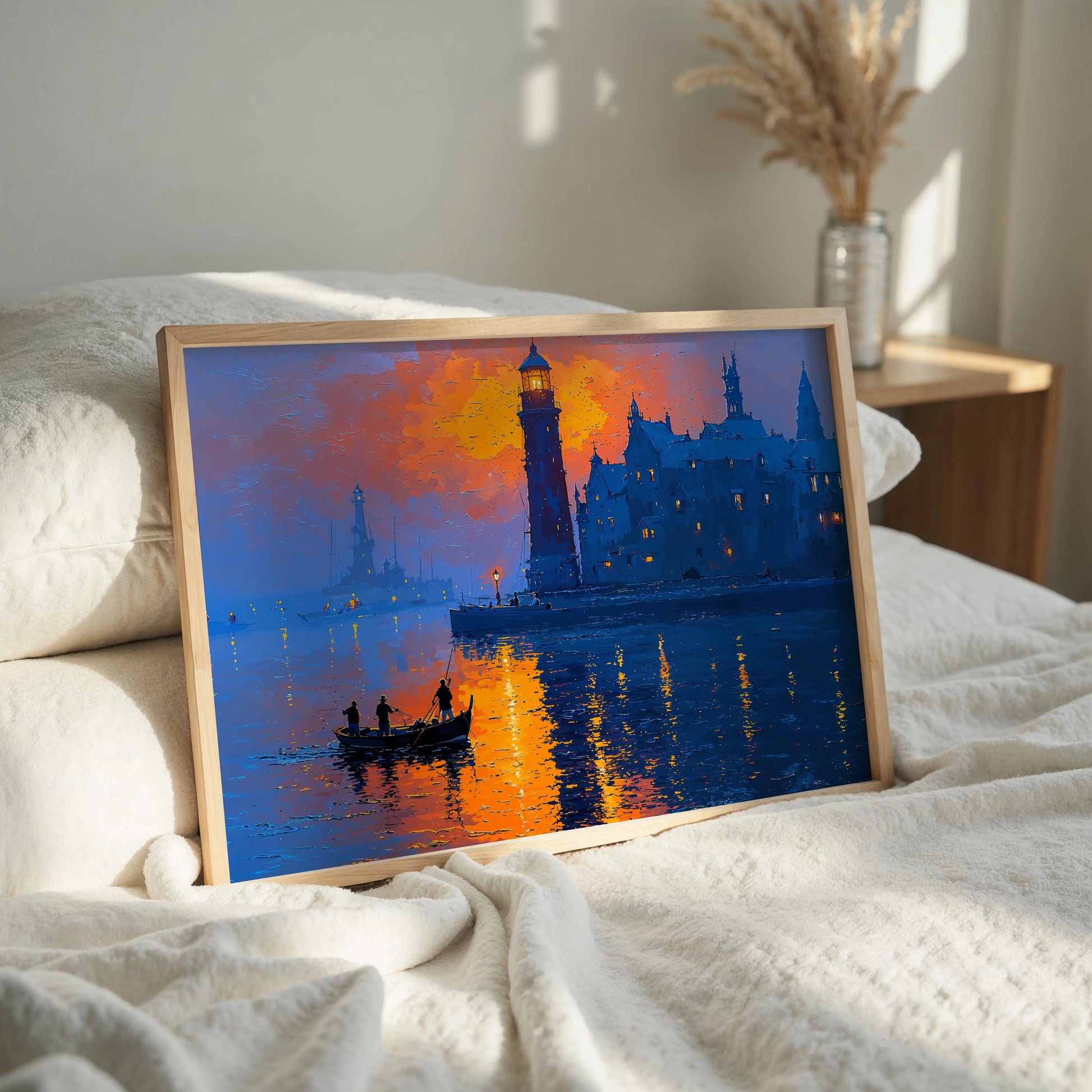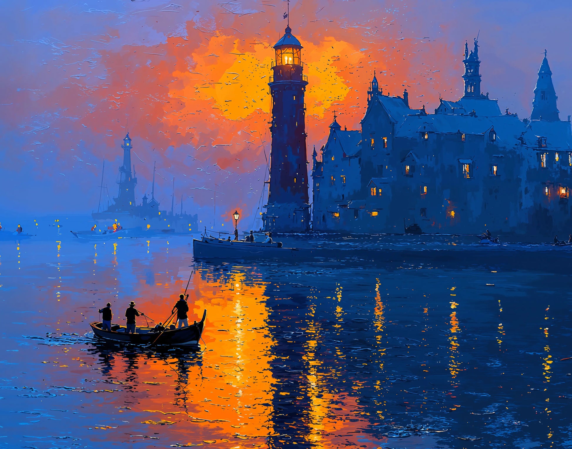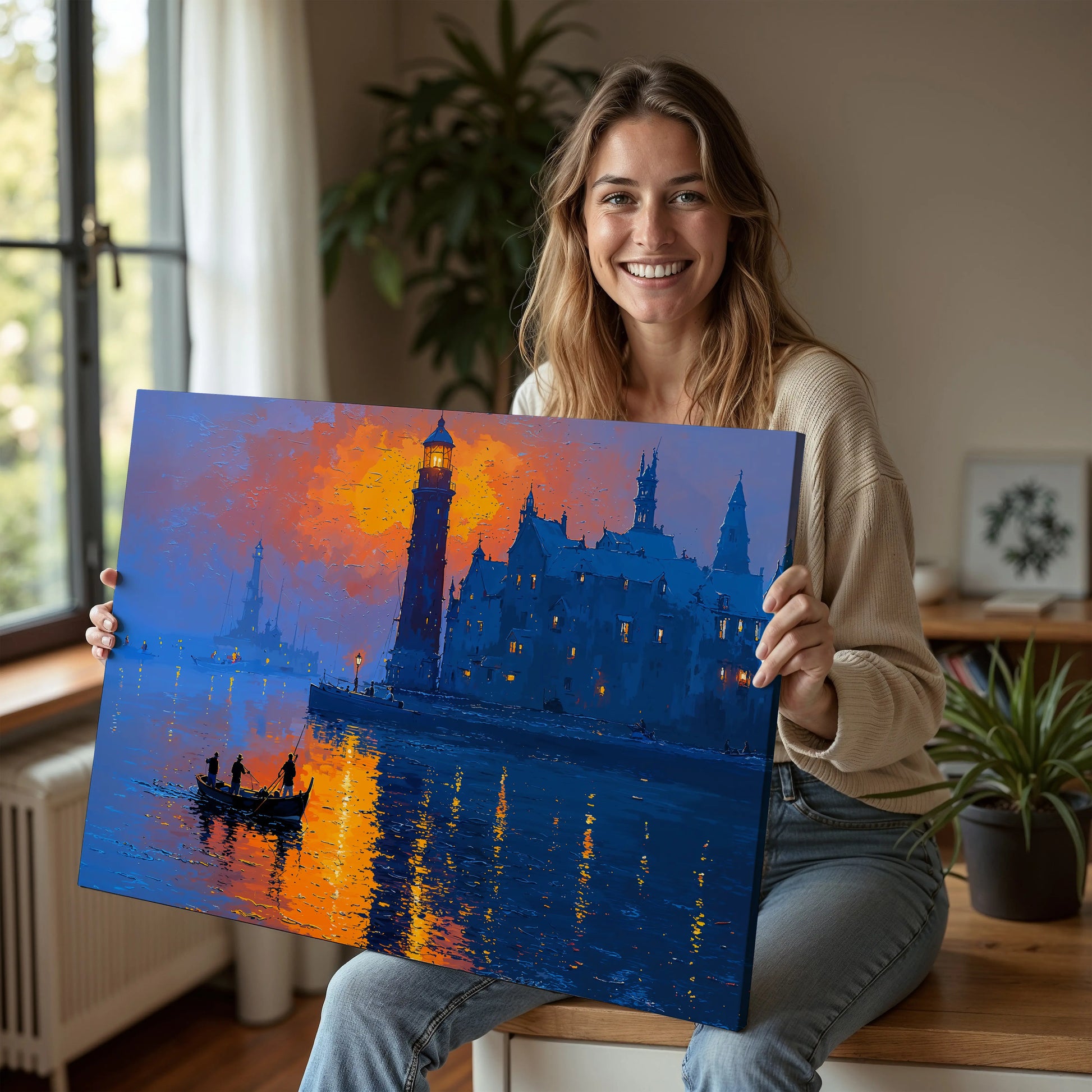 Eventing Tides captures the meeting of day and night in a harbor scene rich with color and atmosphere. Shades of deep blue wrap around fiery orange reflections, while distant spires and glowing windows anchor the moment in warmth and memory.